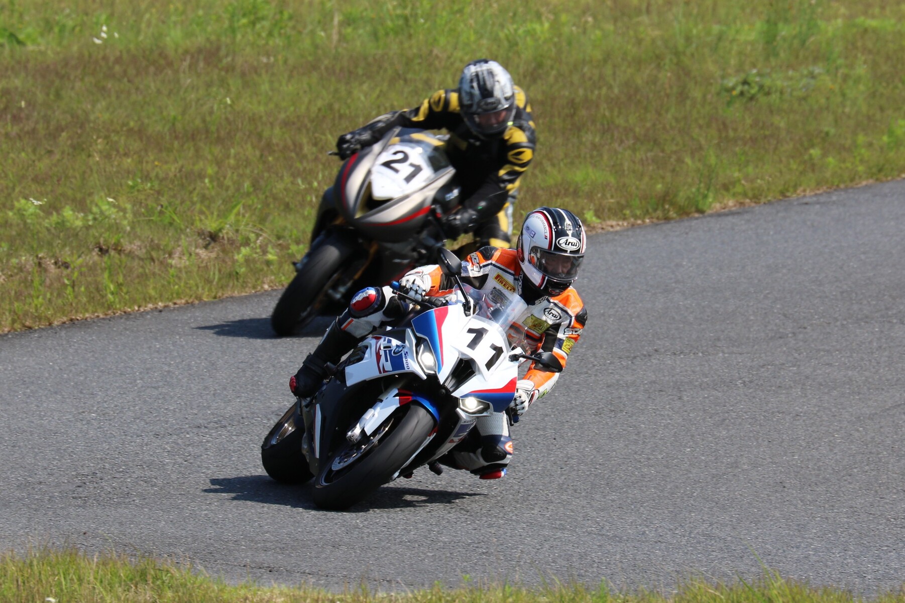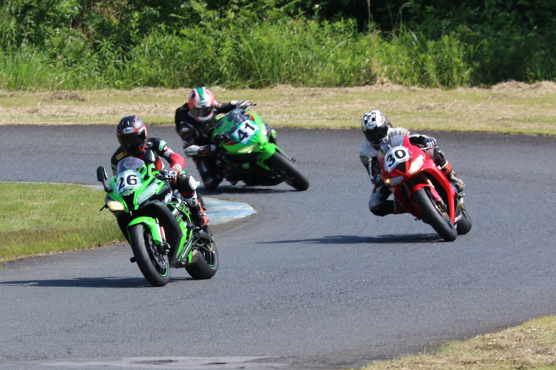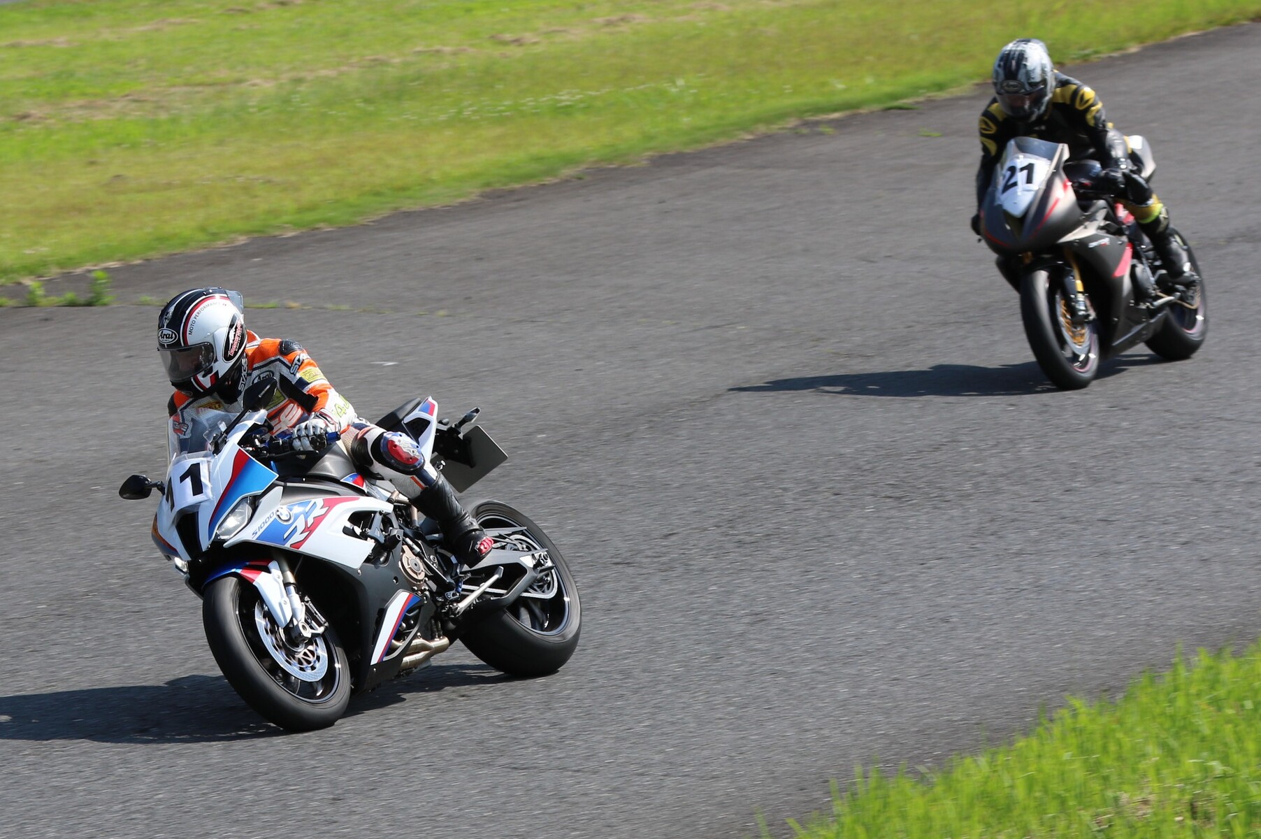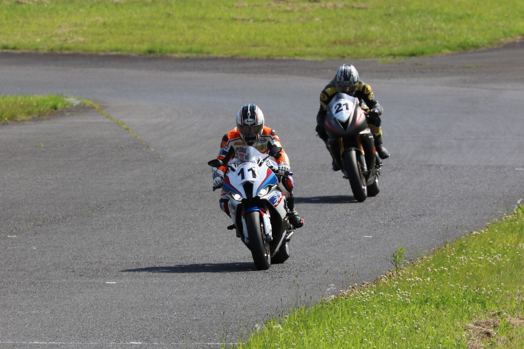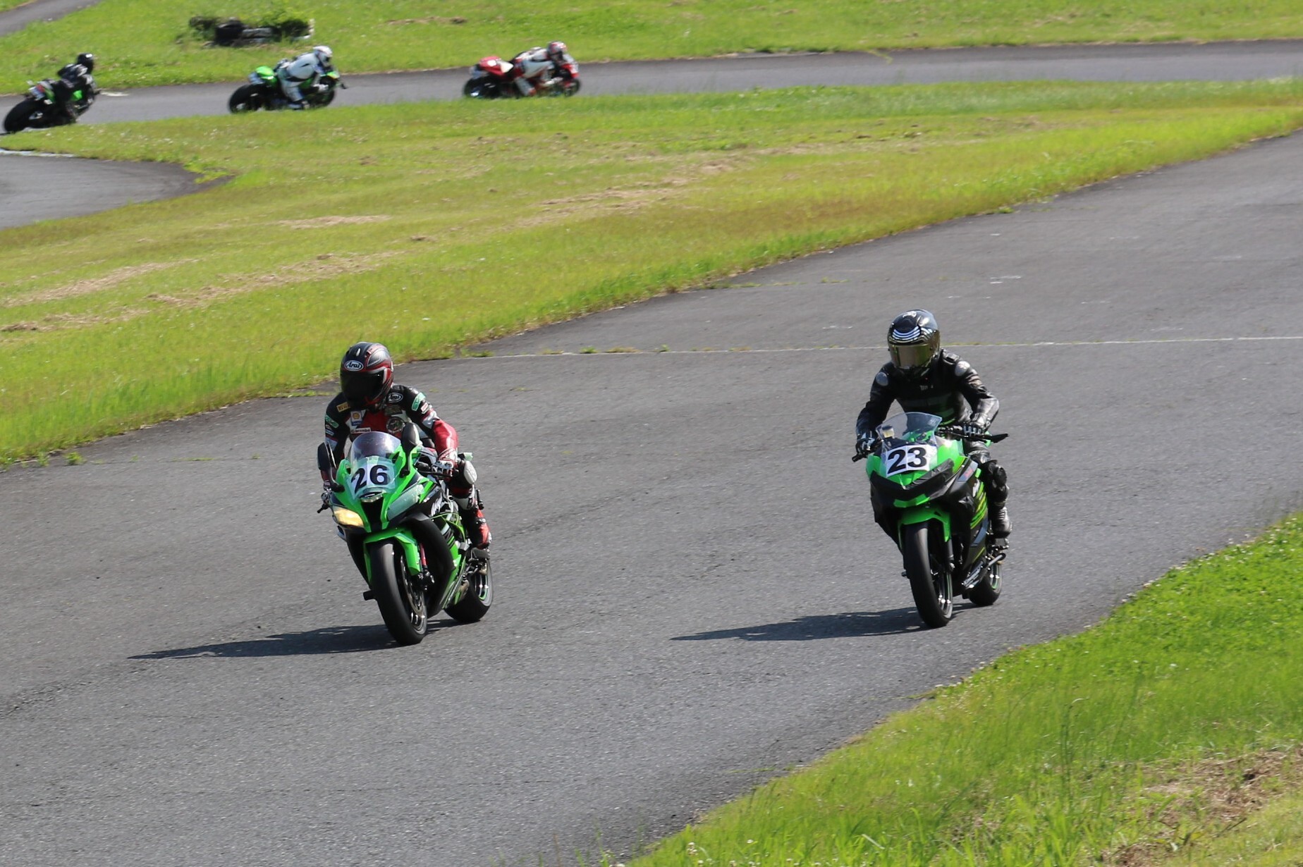 7番手に小川Ninja400、8番手に江川デイトナ675、9番手に大橋CBR600RR、10番手に池野ZX10R、11番手にCクラスからジャンプアップしてきた八木ZX6R、12番手に初参加でやはりCクラスからジャンプアップしてきた清川CBR600RRと続く。