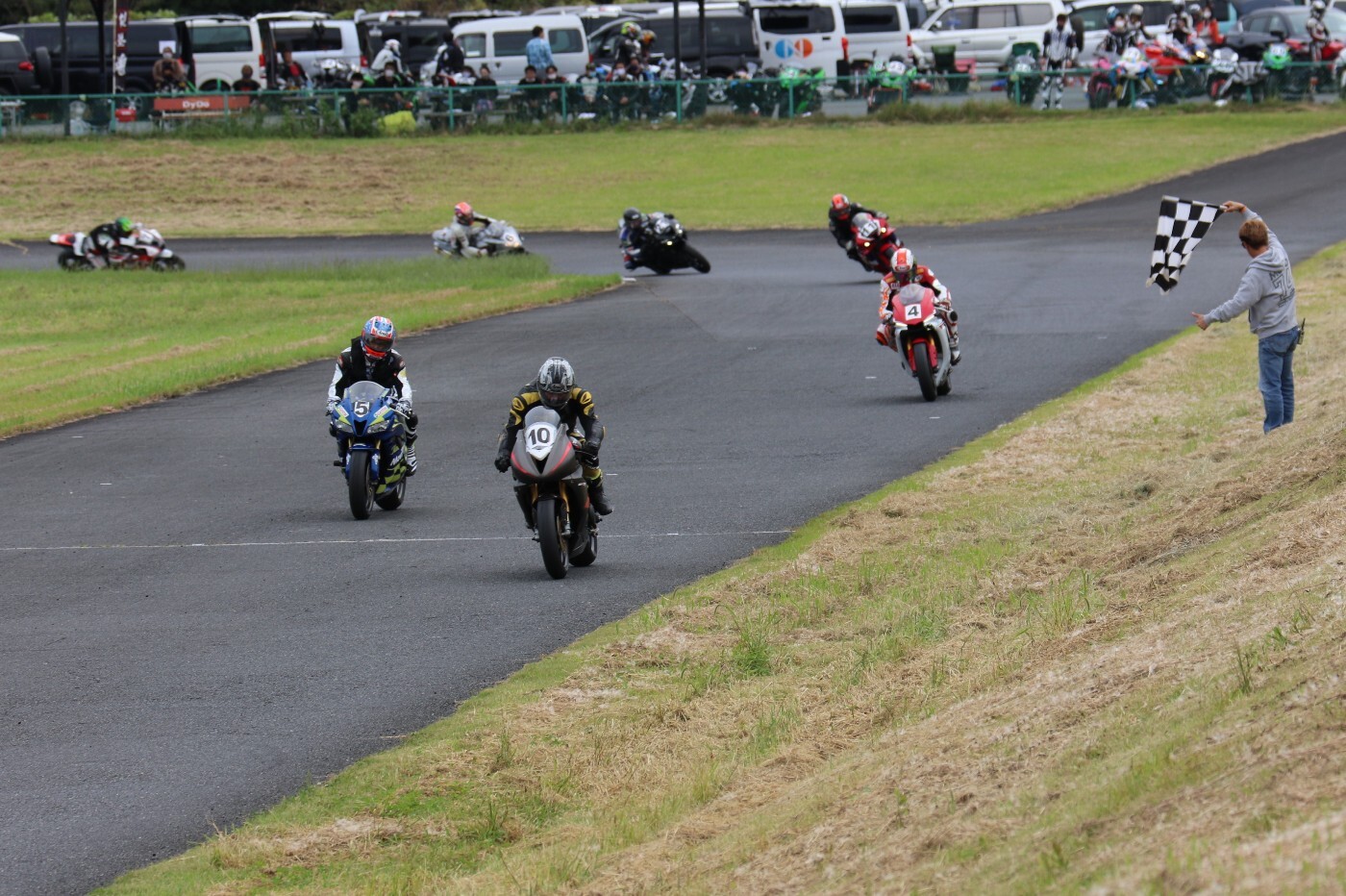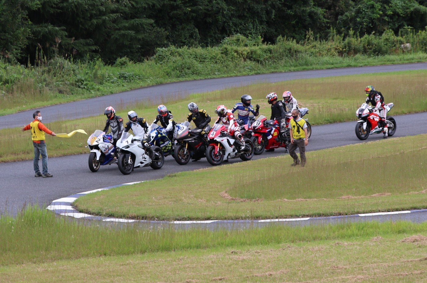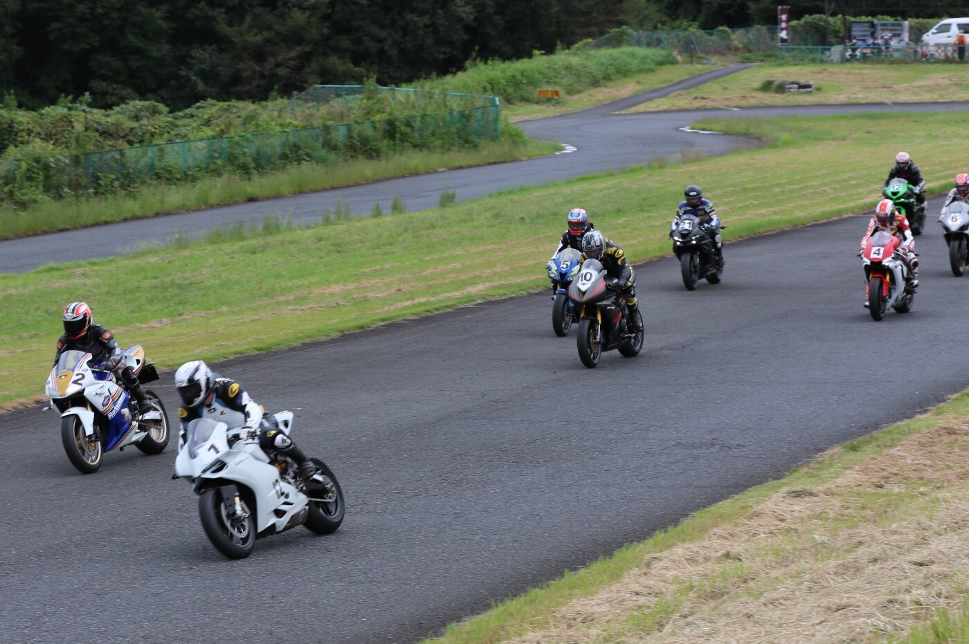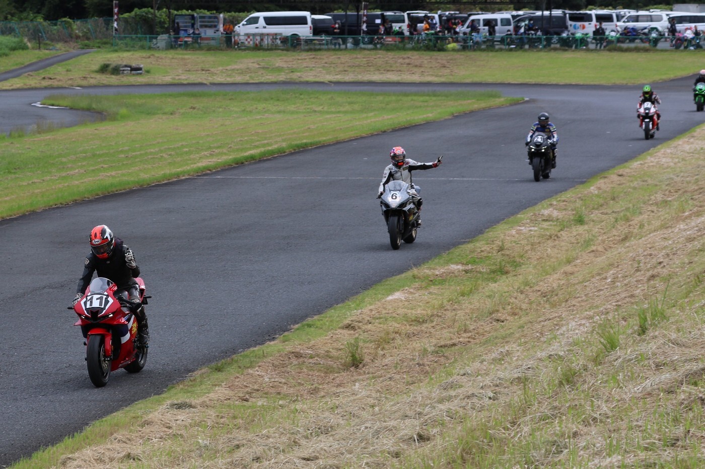 6番手に坂平CBR600RR、7番手に伊藤ZX6R、8番手に渡辺GSXR1000K6、9番手に阿部CBR600RR、10番手に亀田ZX6R、11番に尾崎ZX10R、12番手に鈴木CBR600RRと続く。