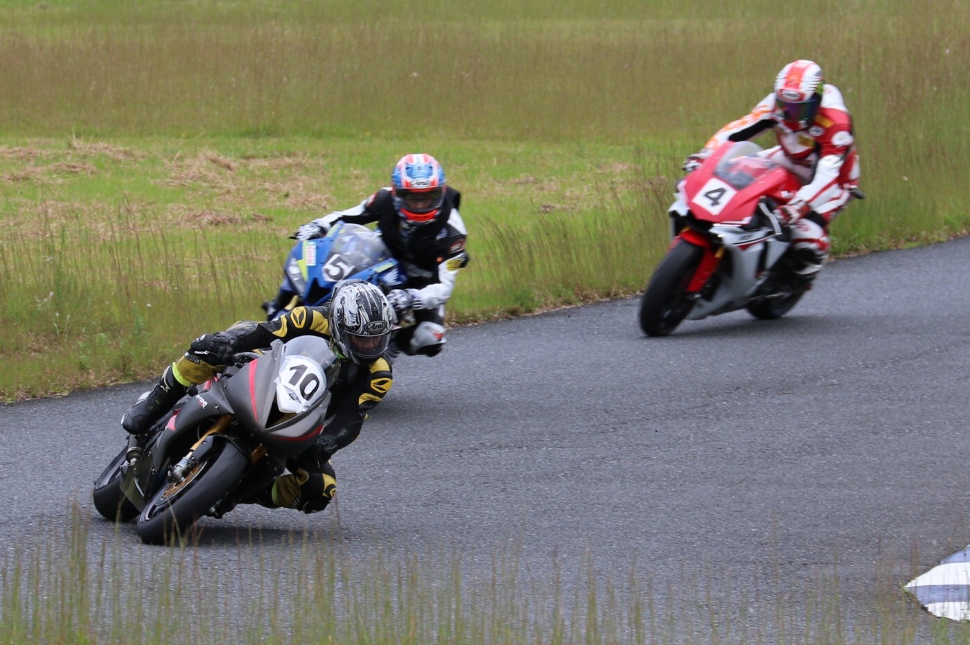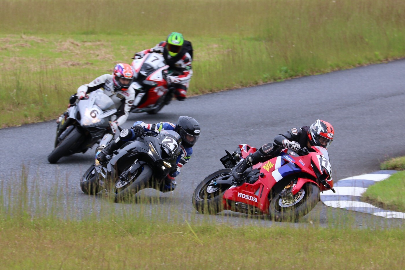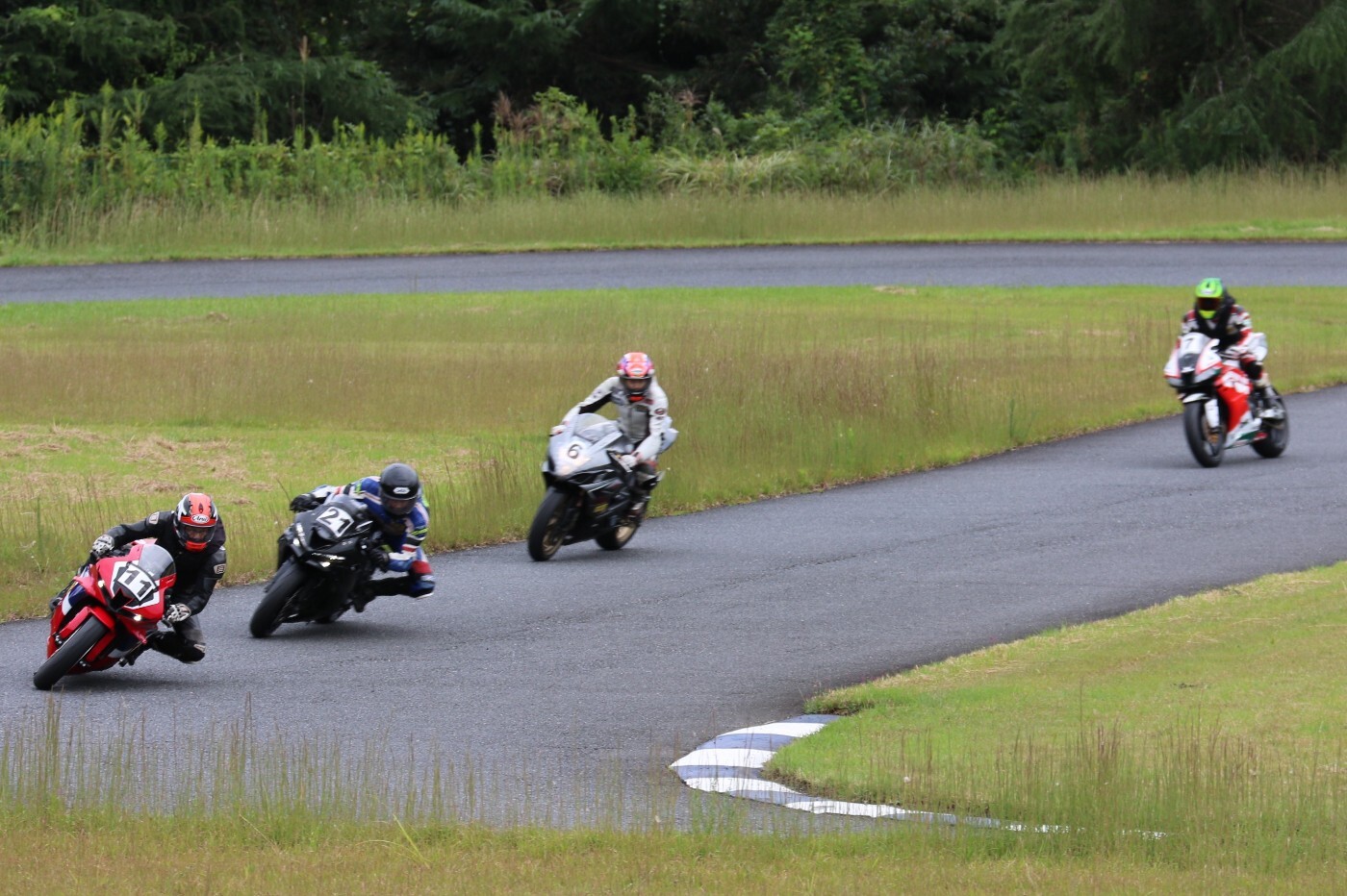 3番手には初のフロントロー、そして公式タイムで26秒台を記録した川畑デイトナ675R、4番手に松貝CBR600RR、5番手に磯山R1………