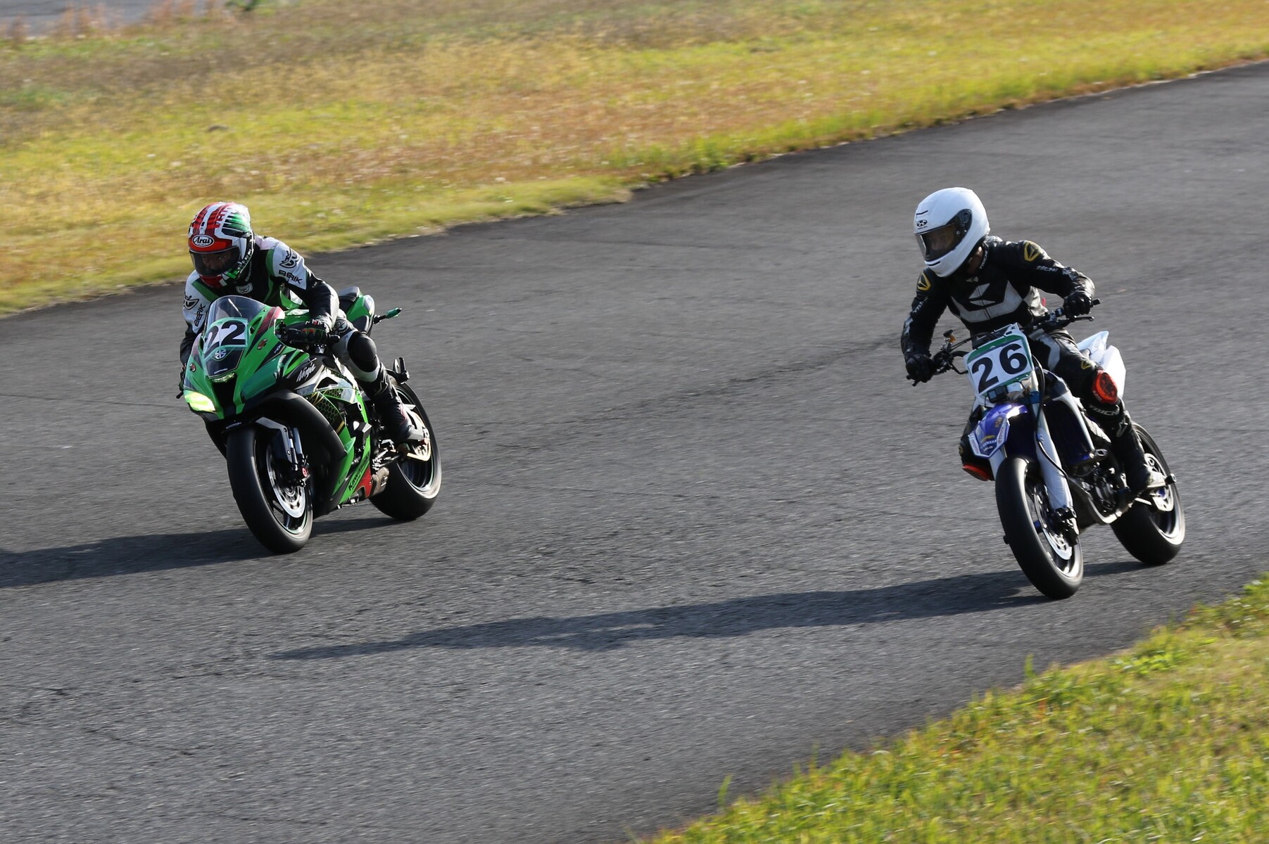 田口GSXR750。2番手にトシチョウYZ250F、ポールポジションスタートの山口ZX10Rは3番手に。