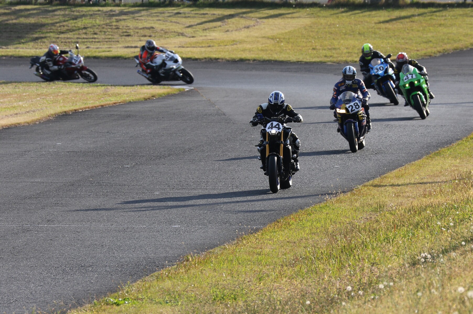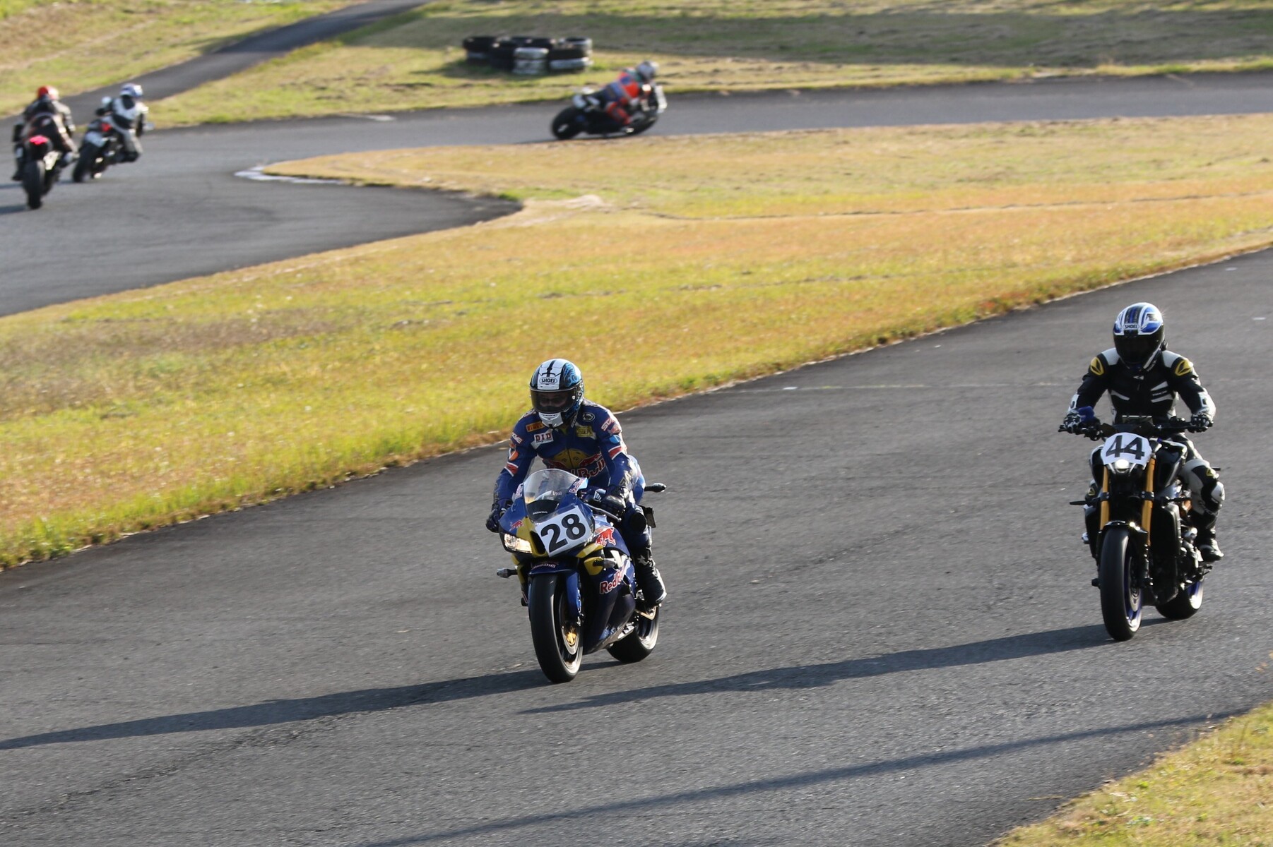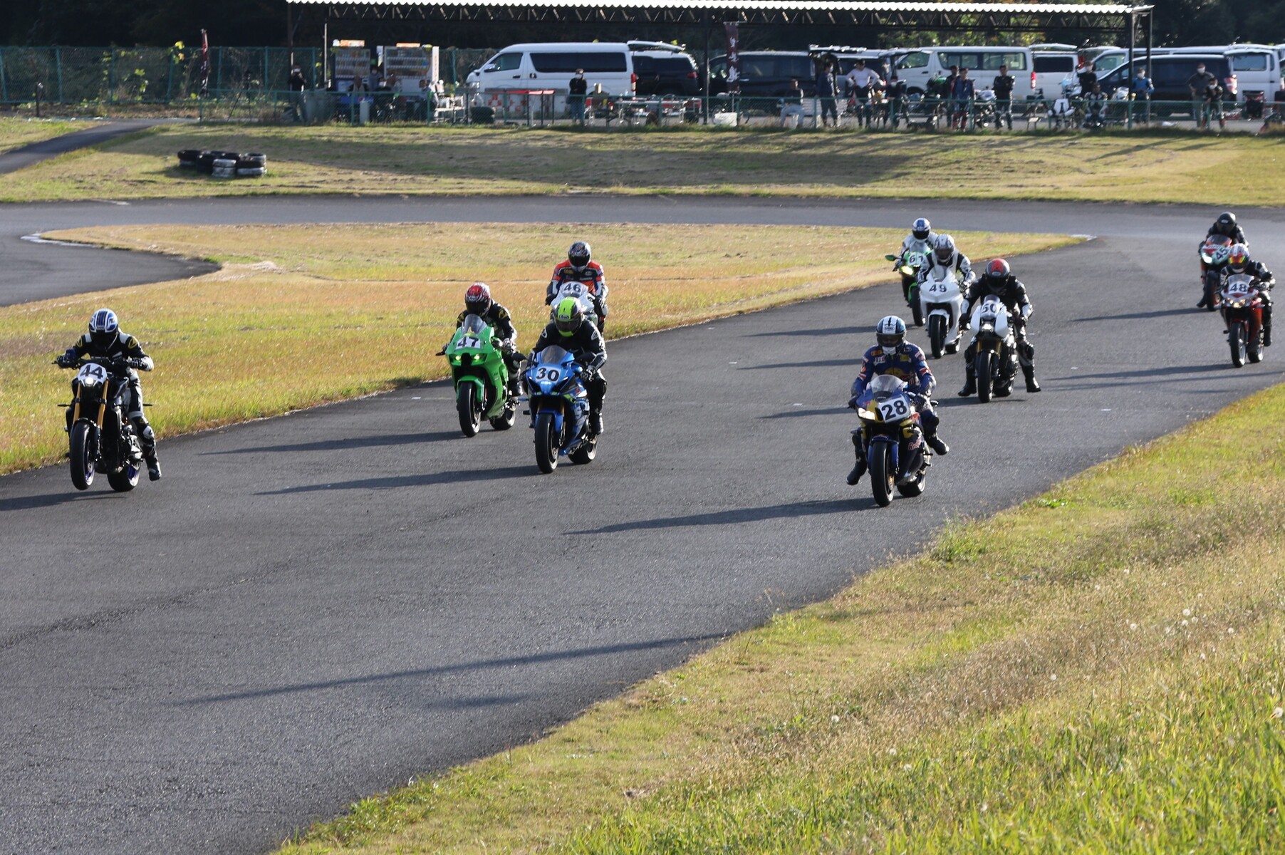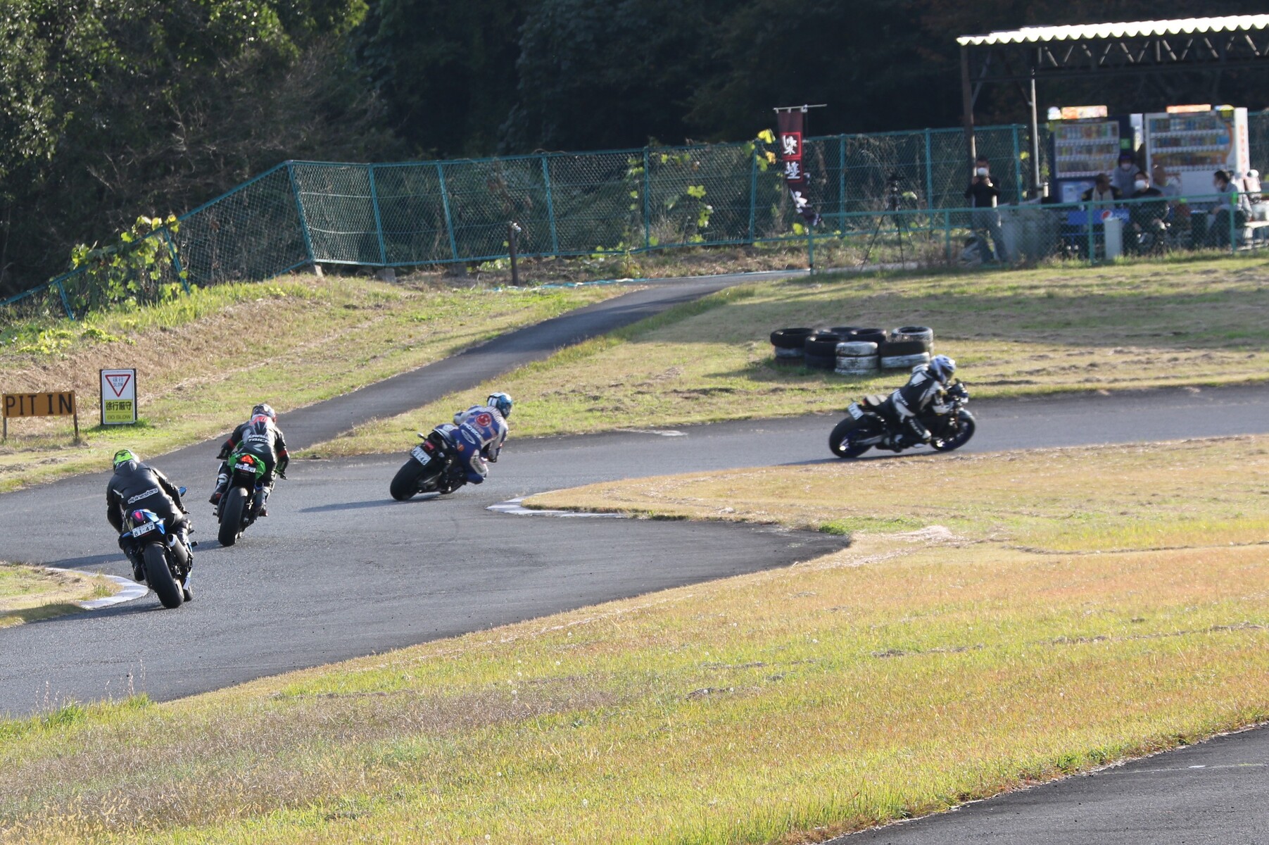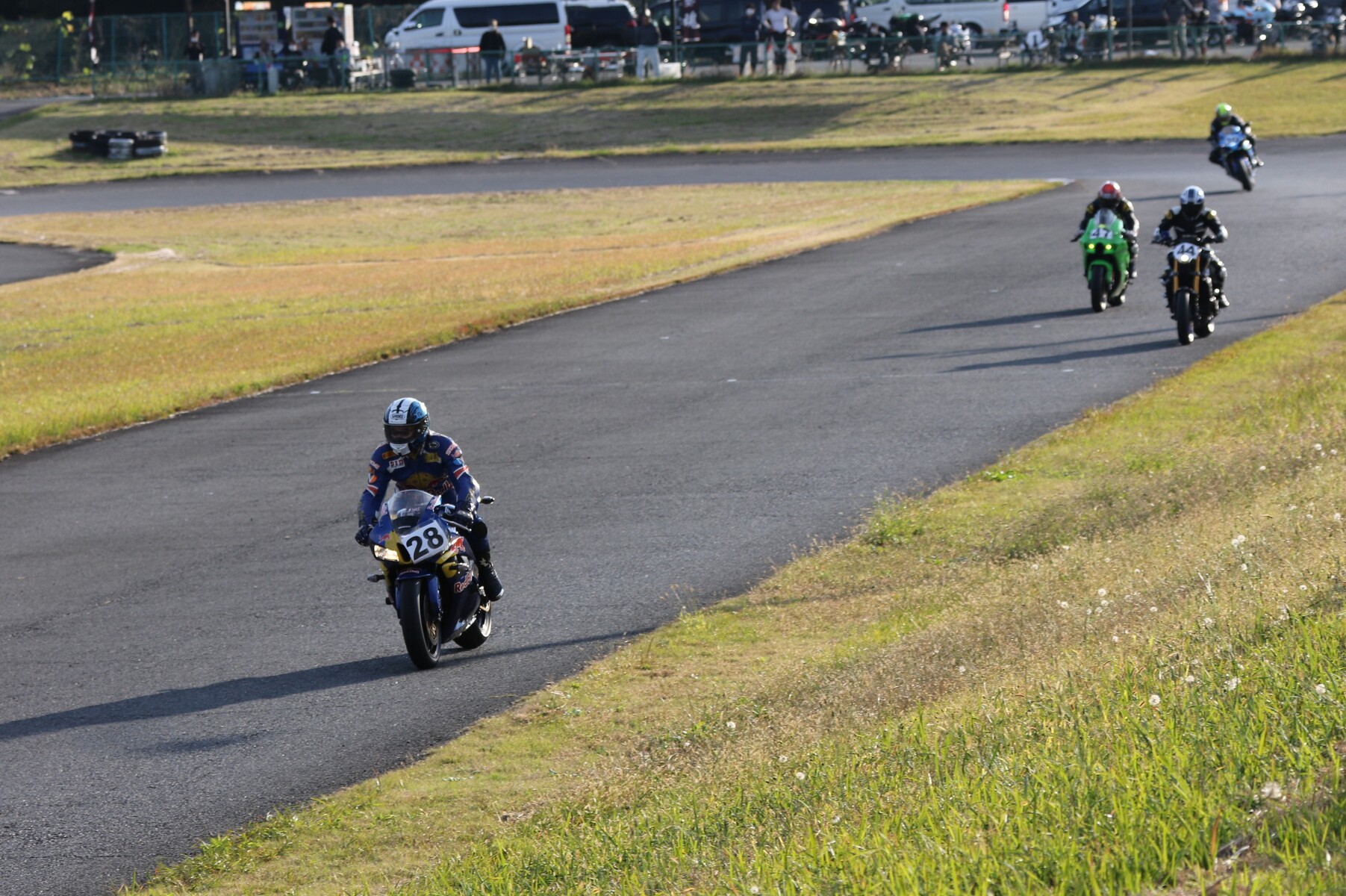 そのままホールショットを奪取。2番手に西村CBR600RR、3番手に二列目から上がってきた木村ZX10RR、4番手に服部GSXR1000R、5番手に菅原ZX6R、6番手に田北スピードトリプル1200RR………