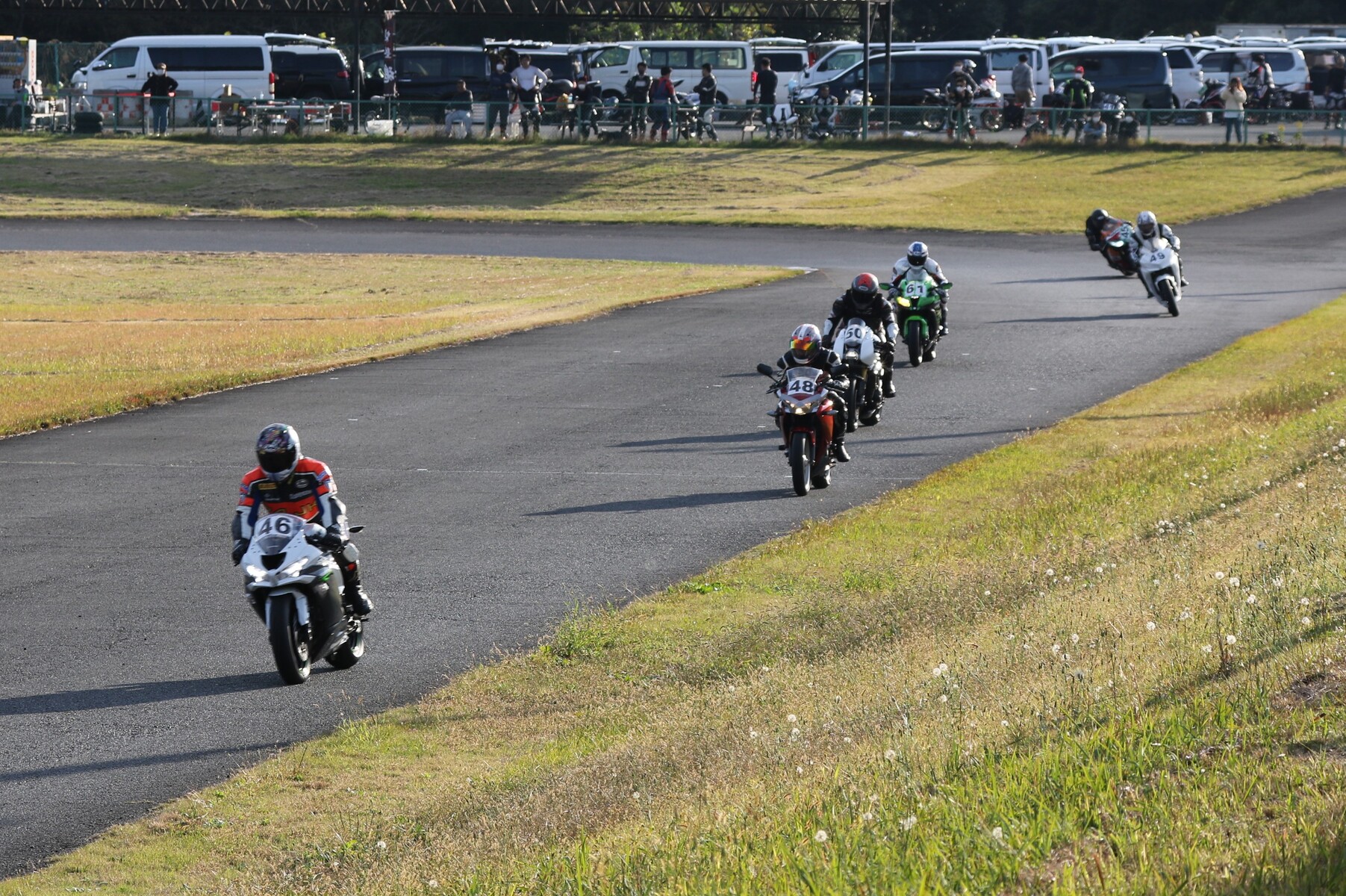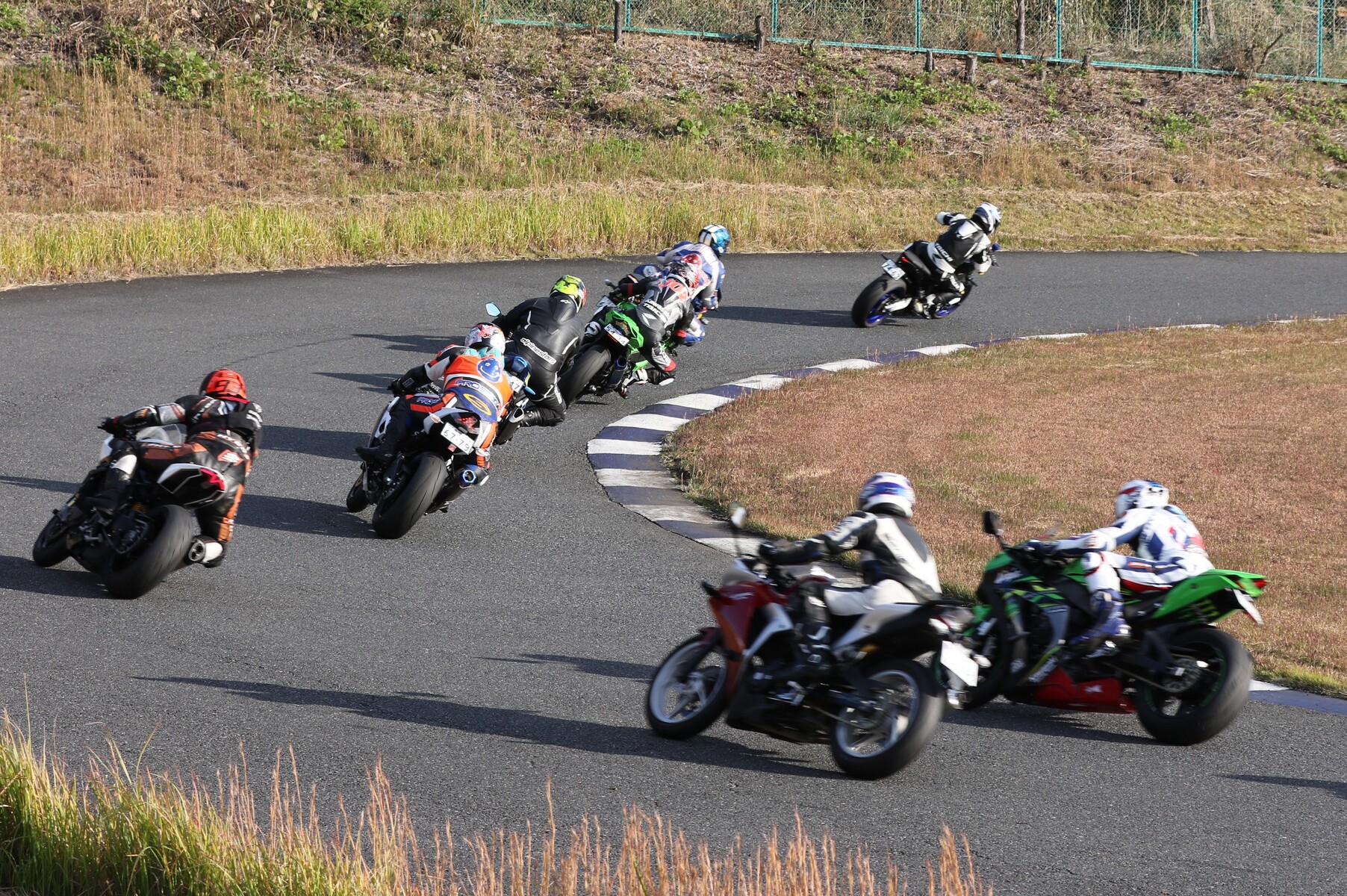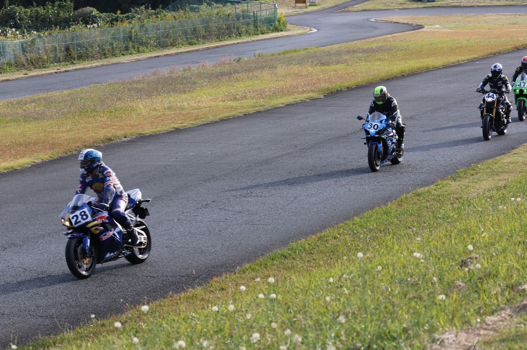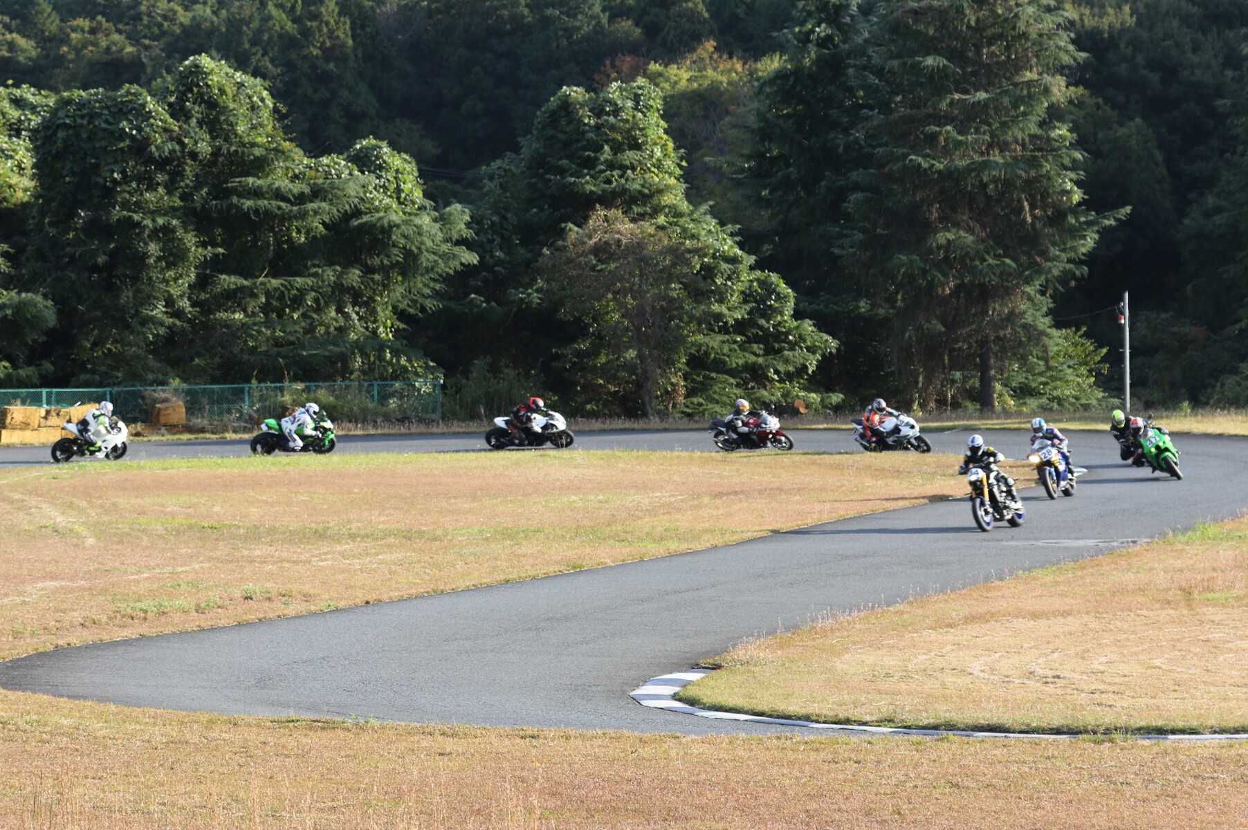 そのままホールショットを奪取。2番手に西村CBR600RR、3番手に二列目から上がってきた木村ZX10RR、4番手に服部GSXR1000R、5番手に菅原ZX6R、6番手に田北スピードトリプル1200RR………
