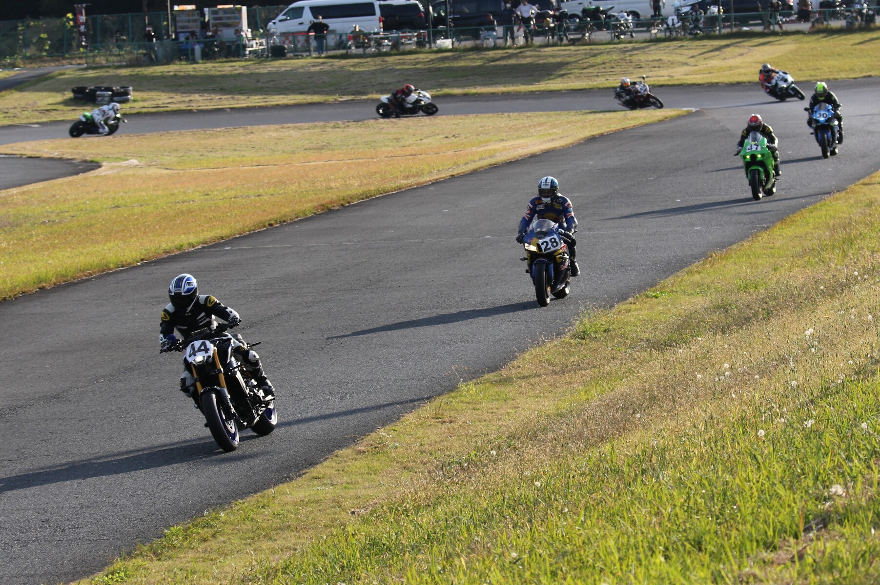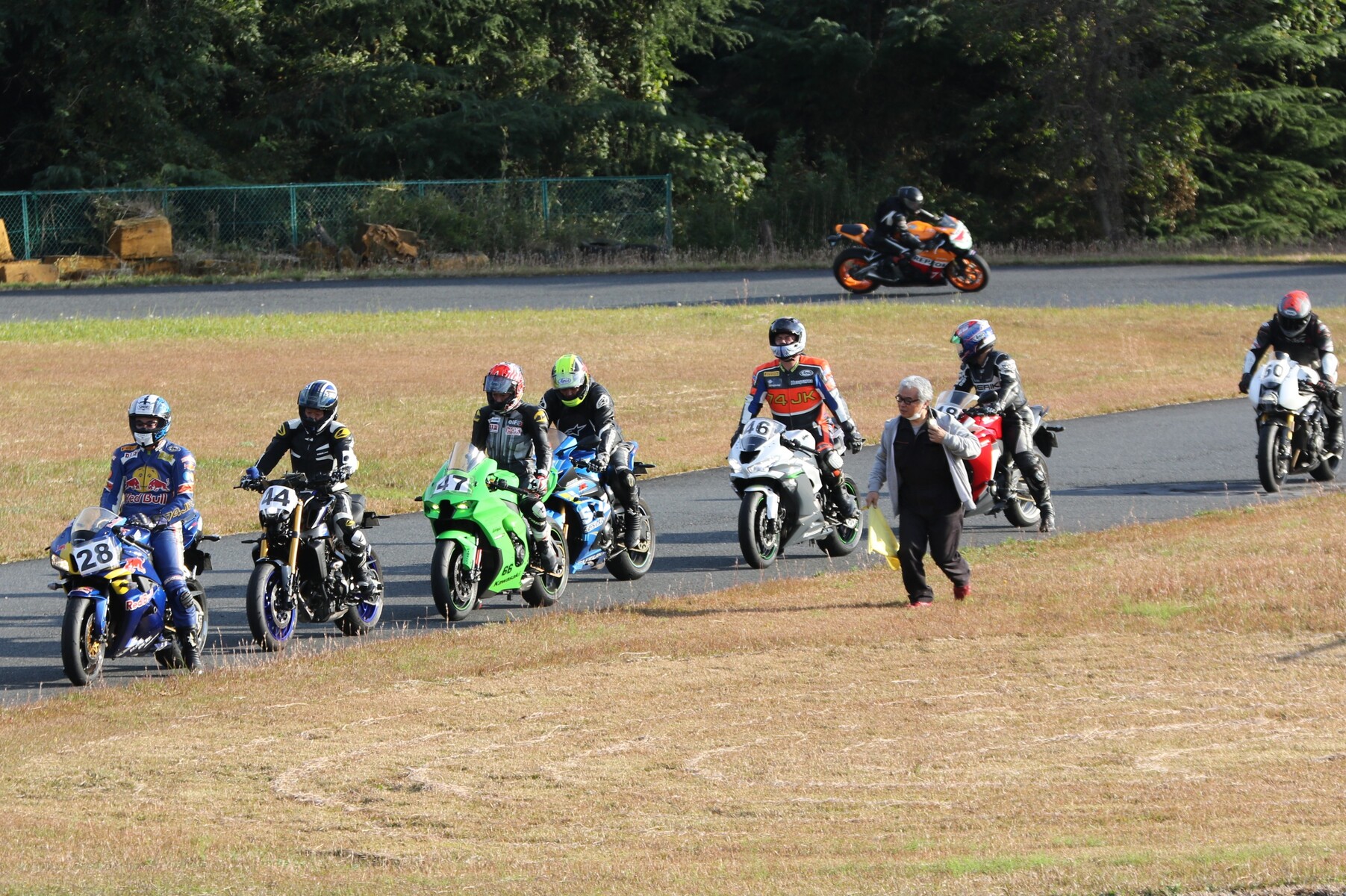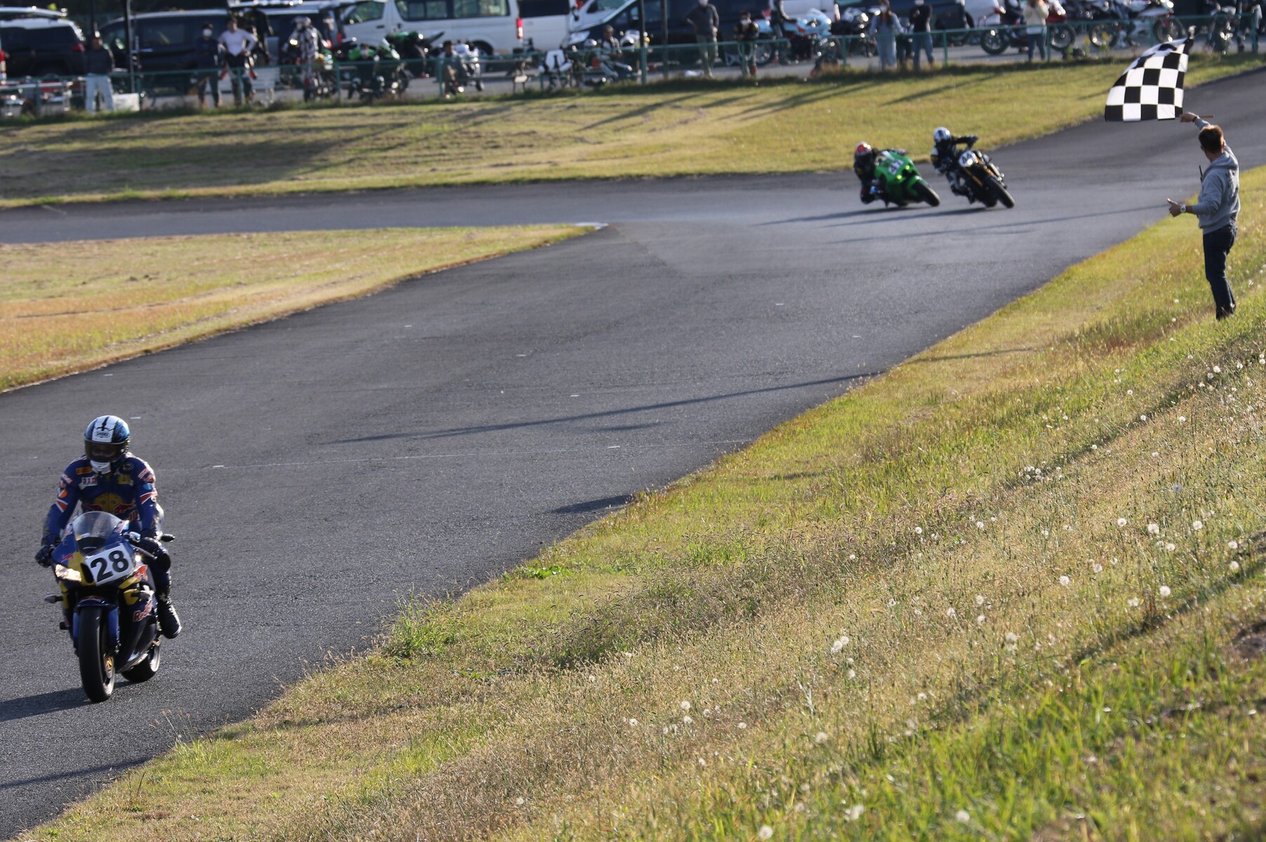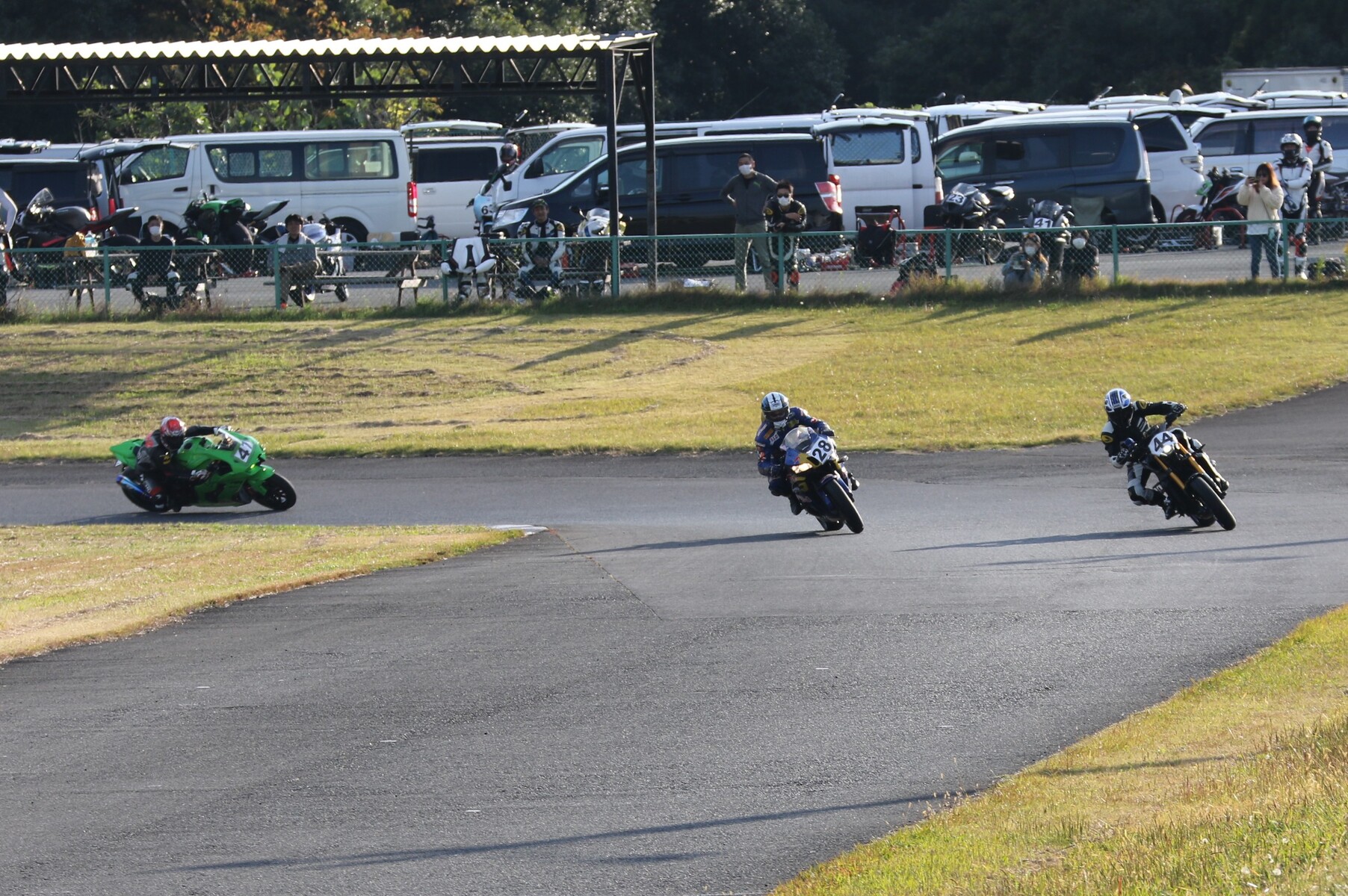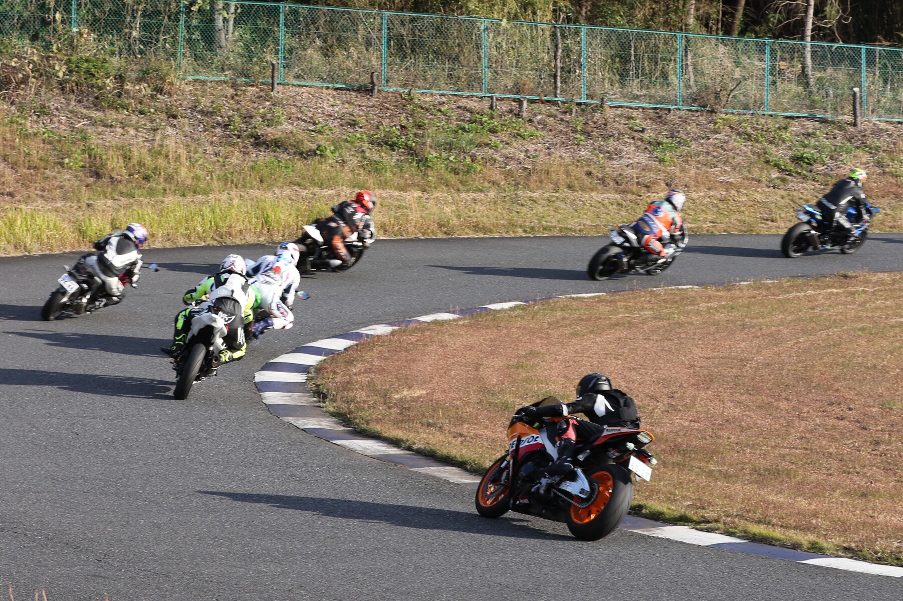 そのままホールショットを奪取。2番手に西村CBR600RR、3番手に二列目から上がってきた木村ZX10RR、4番手に服部GSXR1000R、5番手に菅原ZX6R、6番手に田北スピードトリプル1200RR………