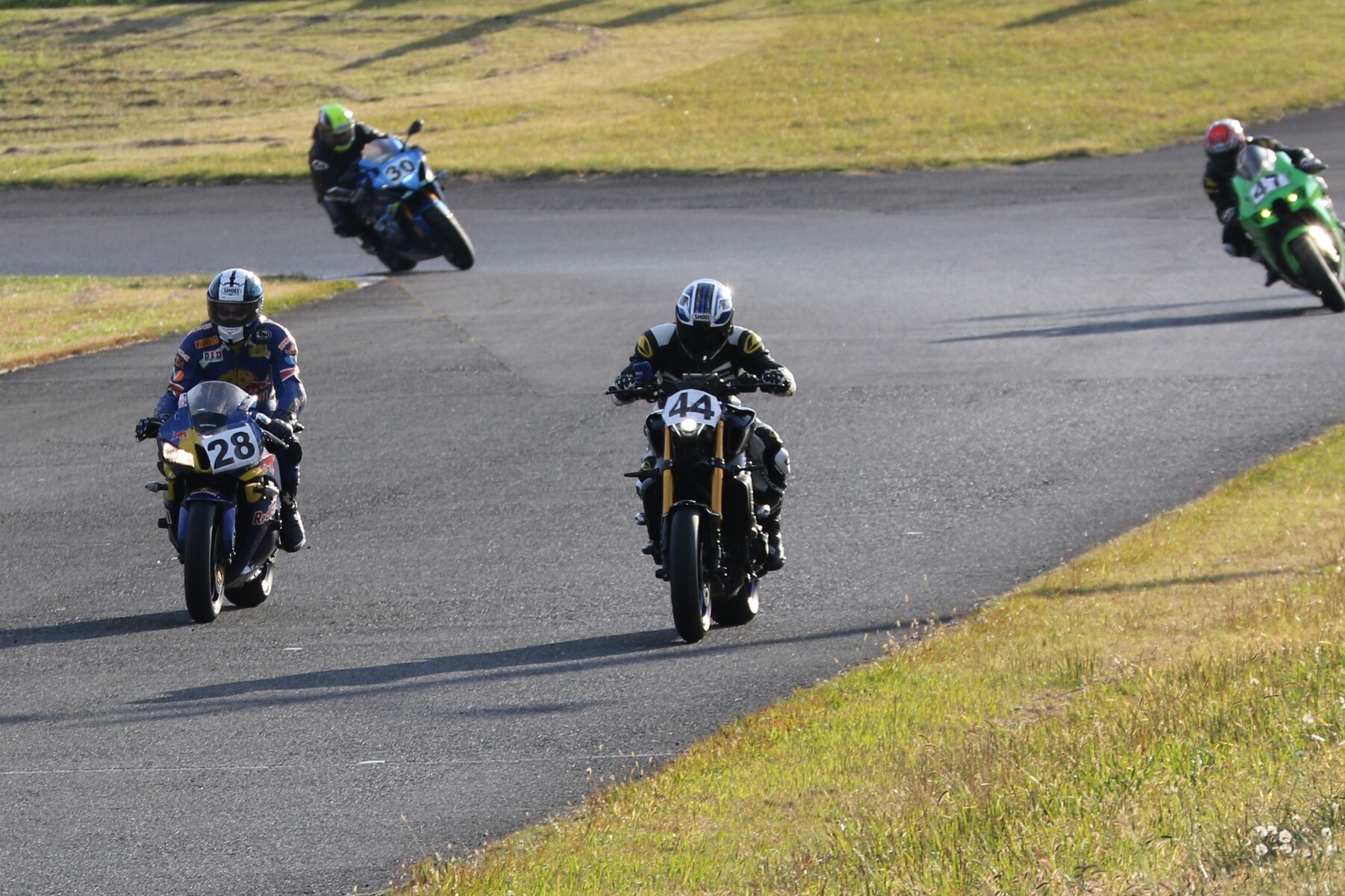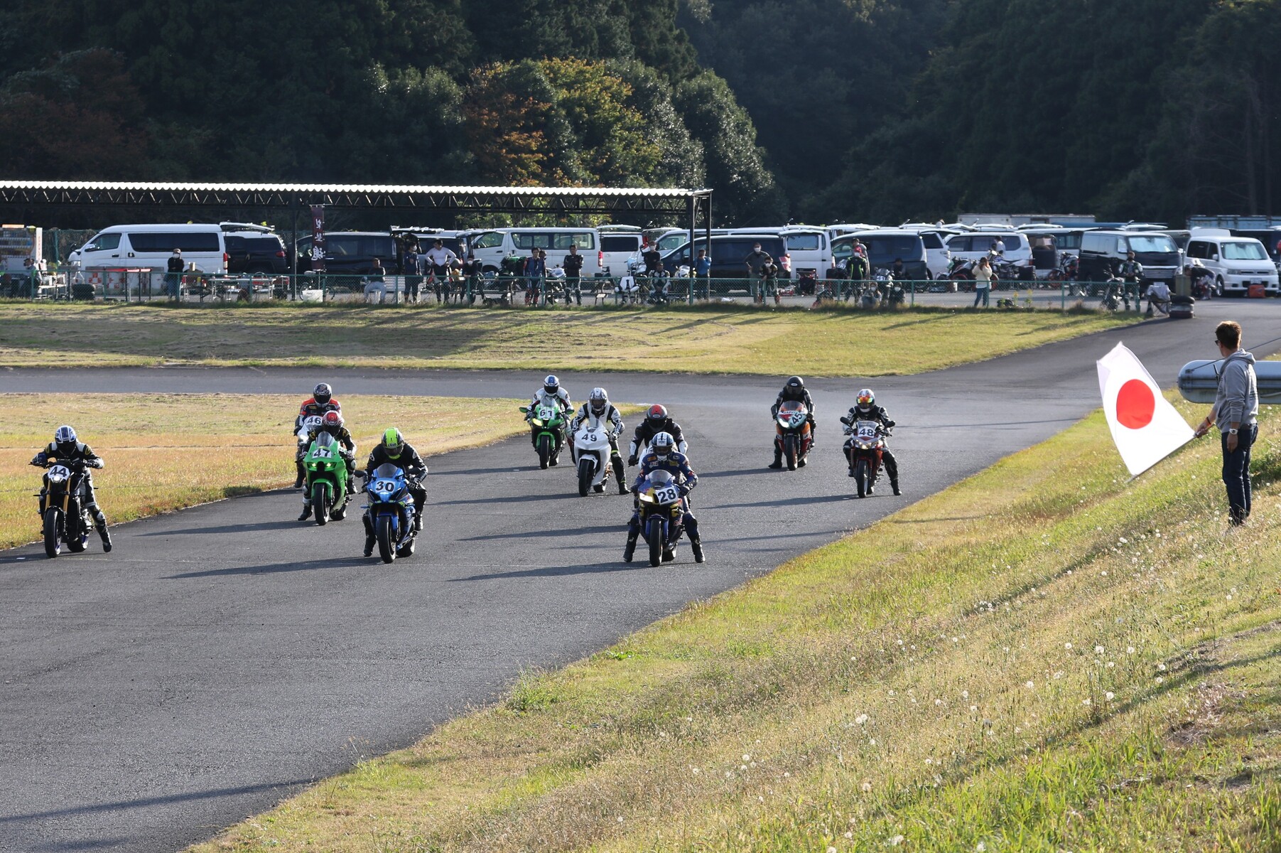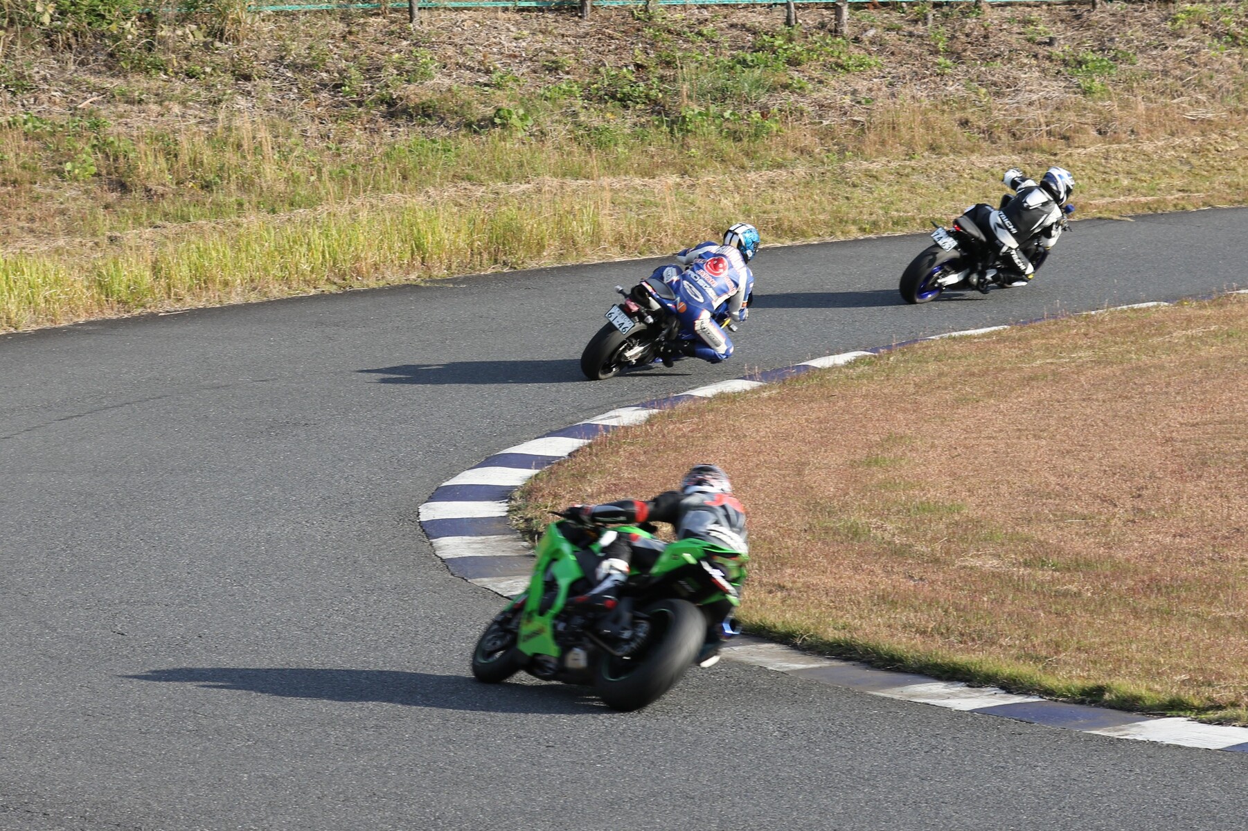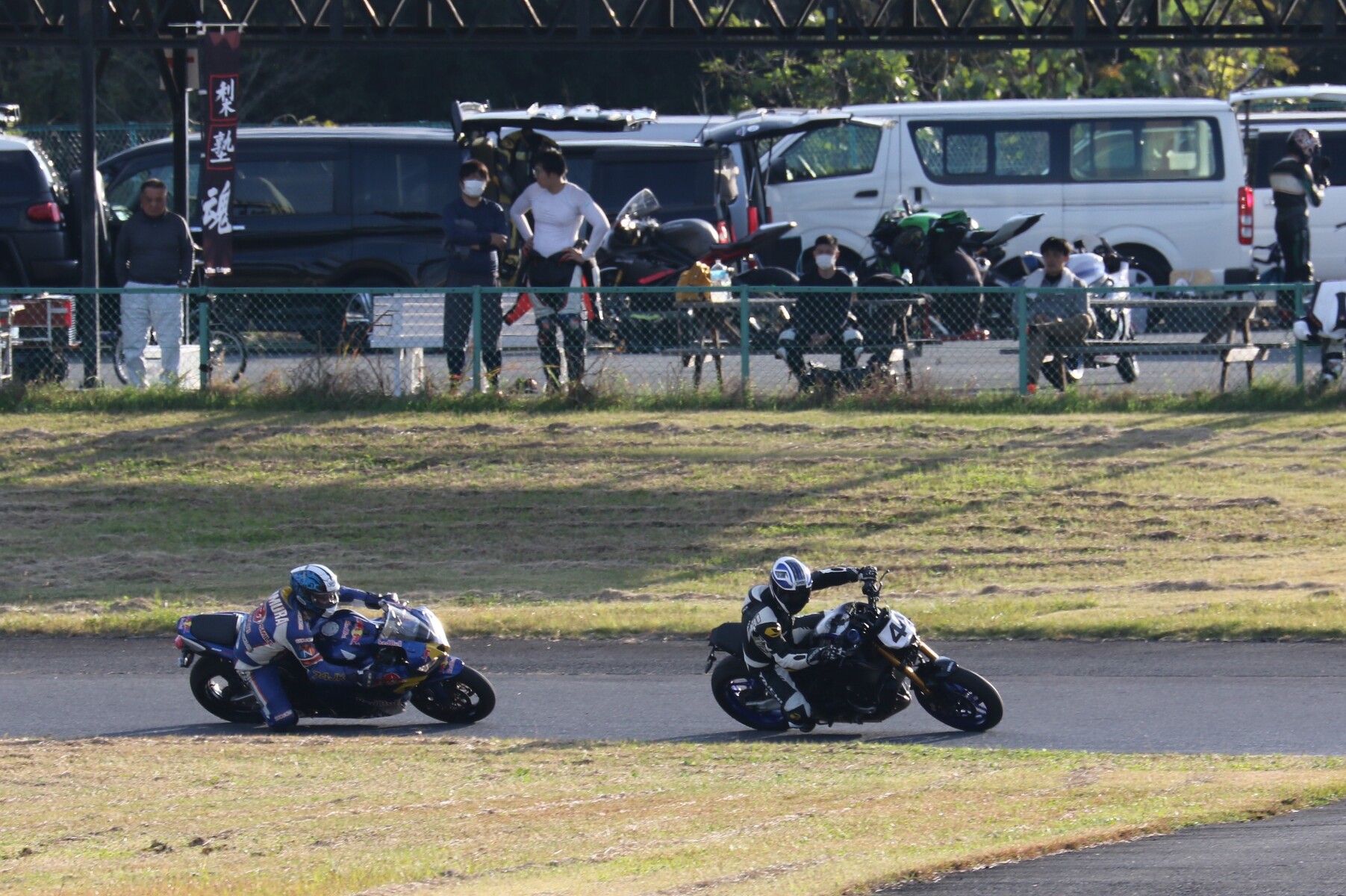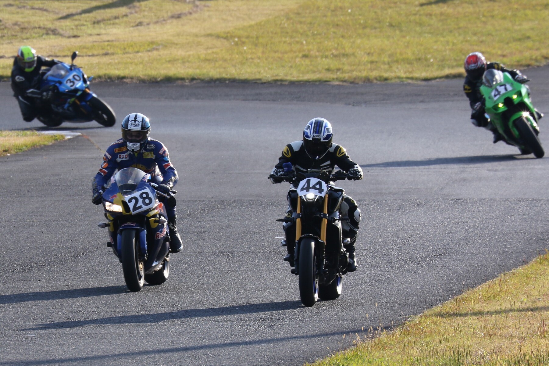 そのままホールショットを奪取。2番手に西村CBR600RR、3番手に二列目から上がってきた木村ZX10RR、4番手に服部GSXR1000R、5番手に菅原ZX6R、6番手に田北スピードトリプル1200RR………