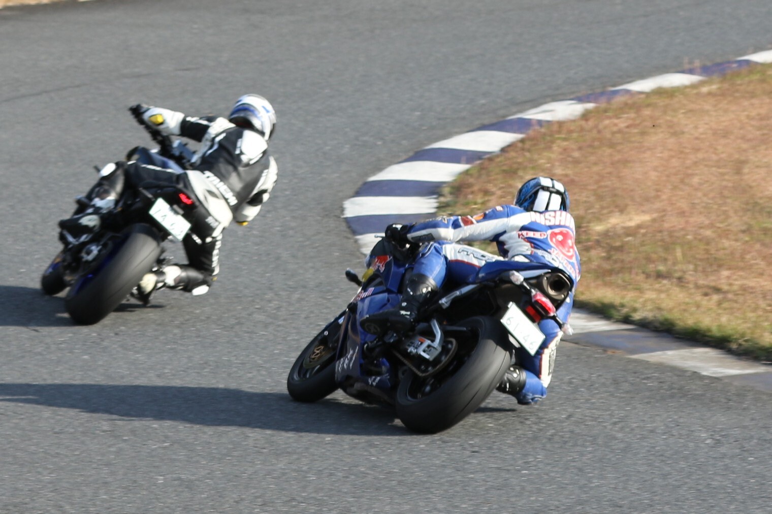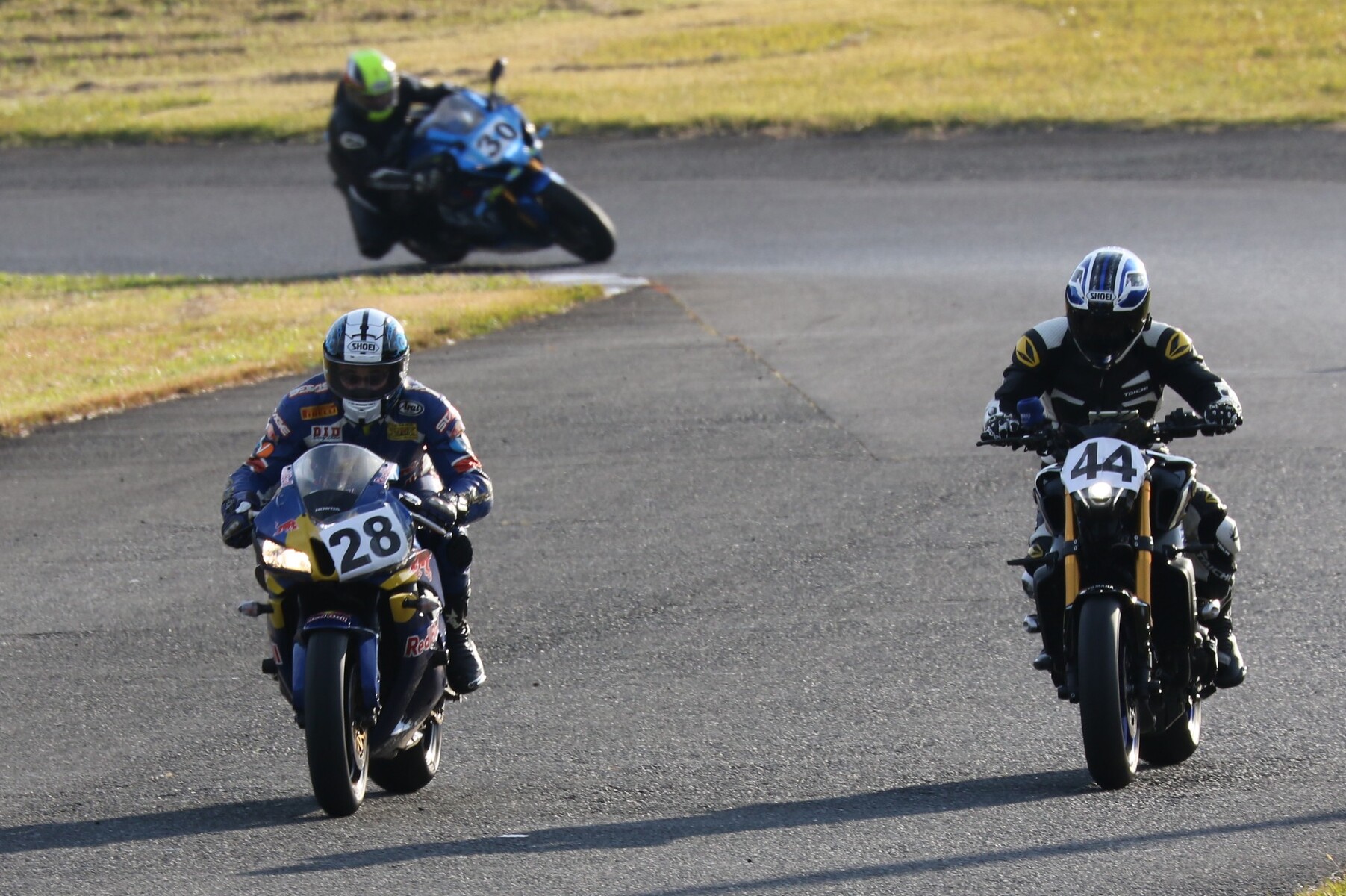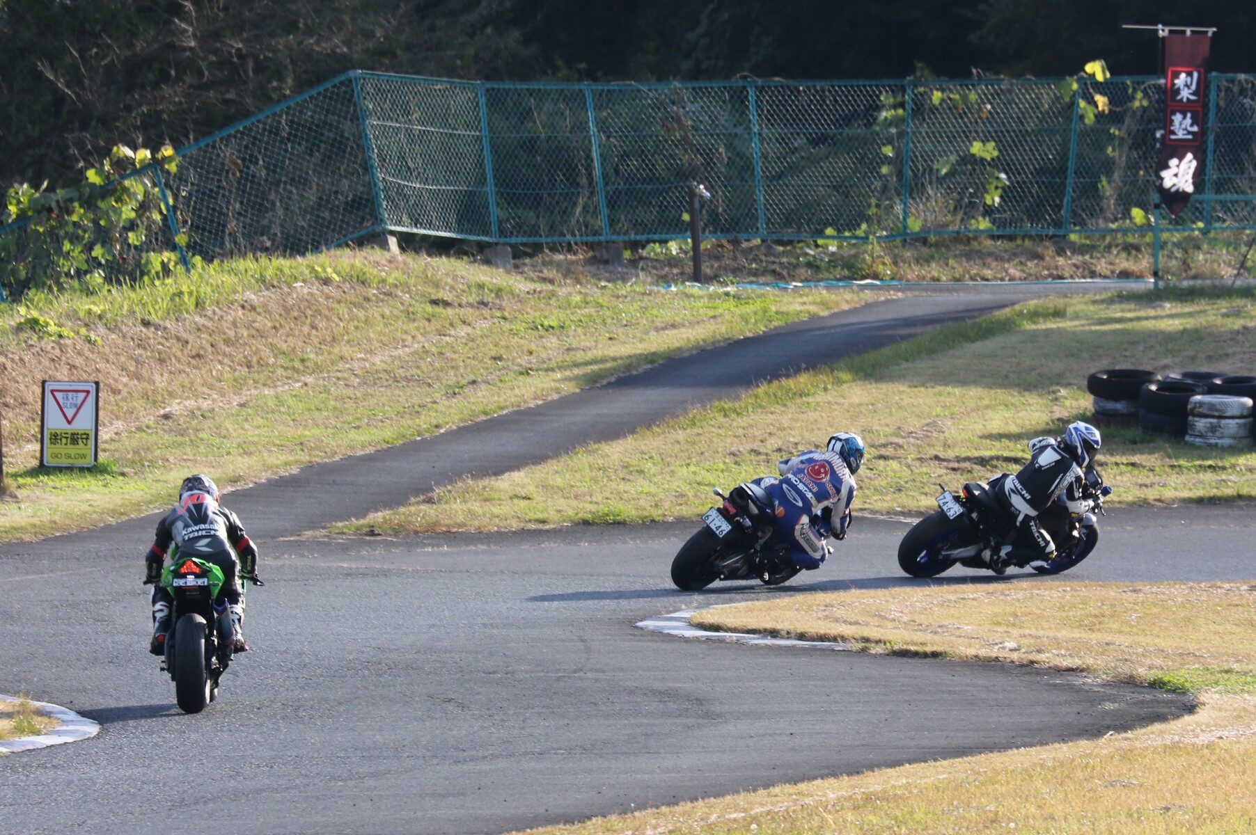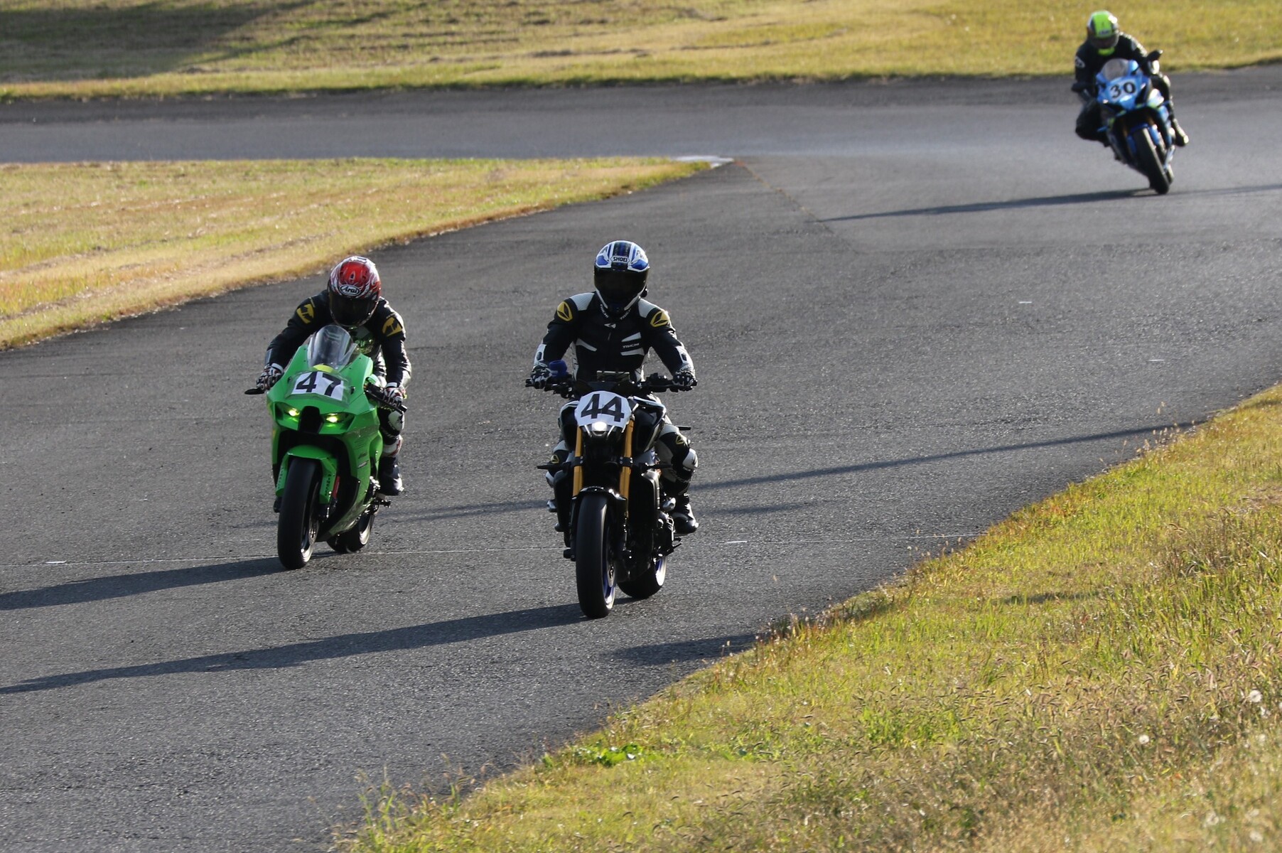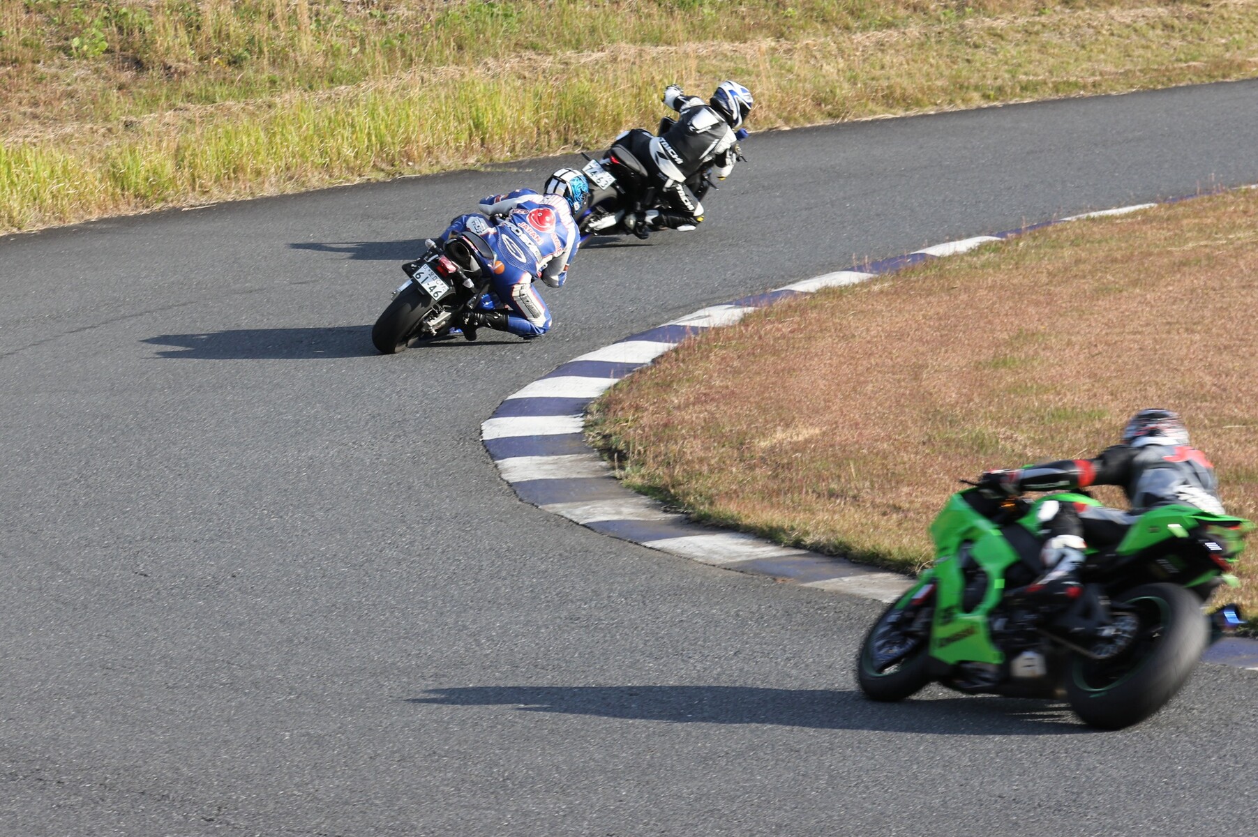 そのままホールショットを奪取。2番手に西村CBR600RR、3番手に二列目から上がってきた木村ZX10RR、4番手に服部GSXR1000R、5番手に菅原ZX6R、6番手に田北スピードトリプル1200RR………