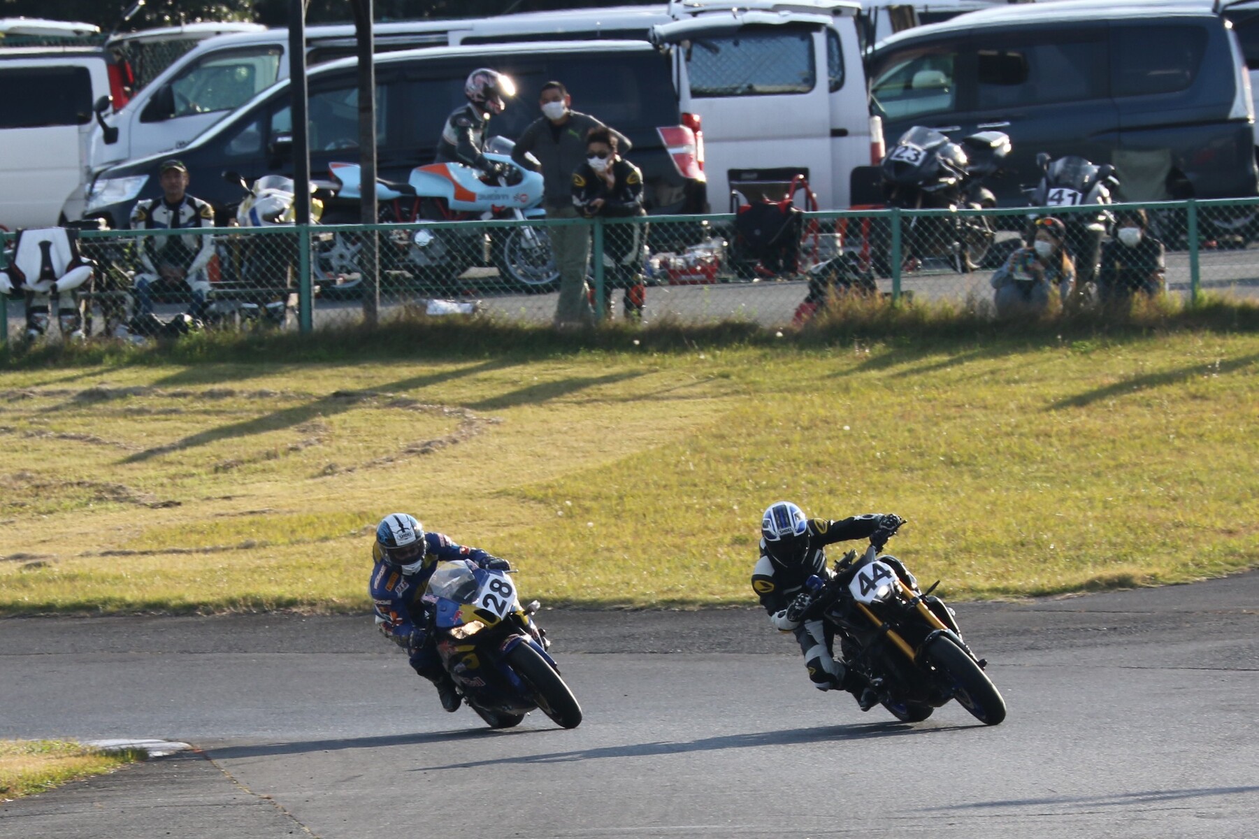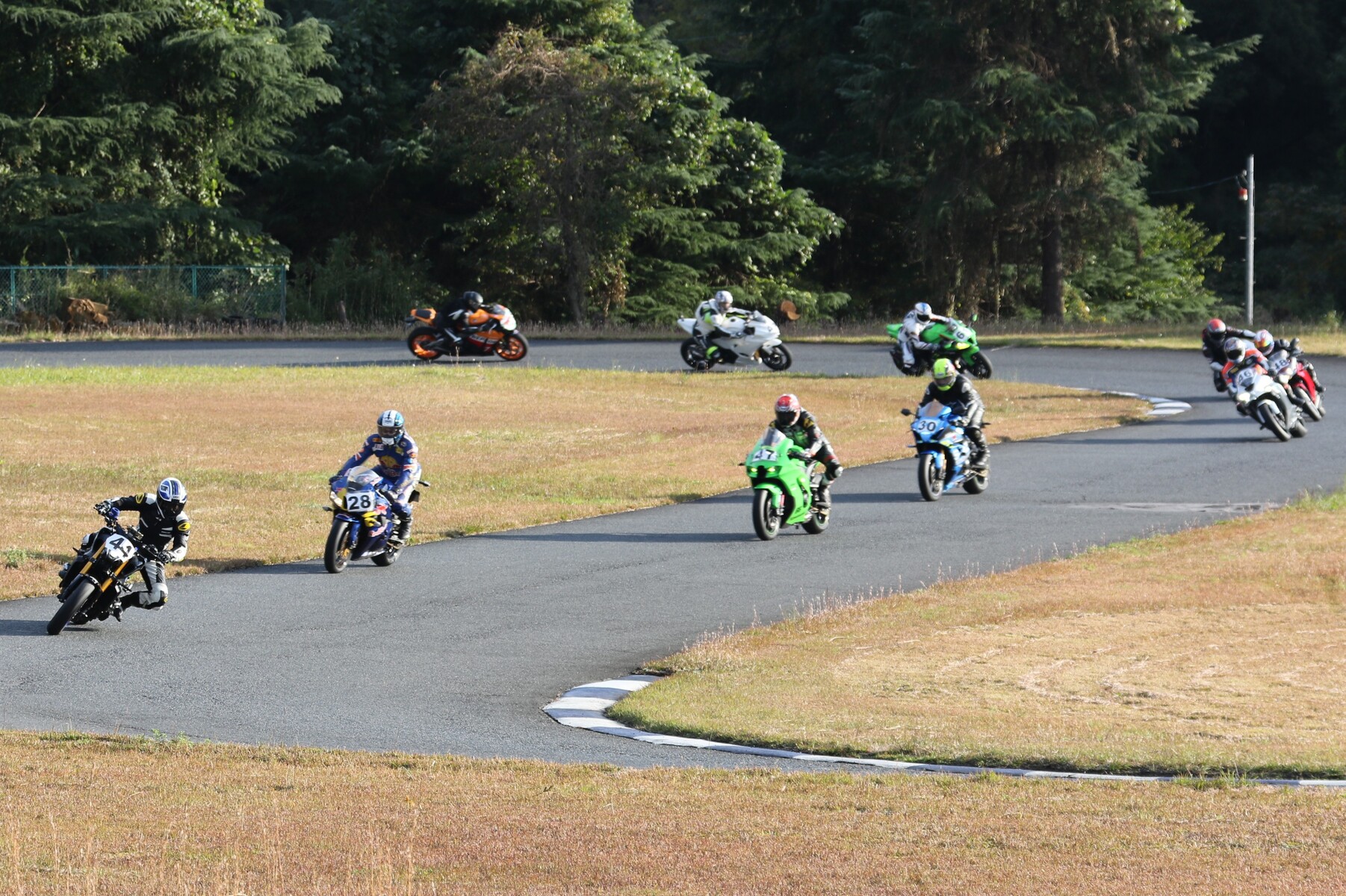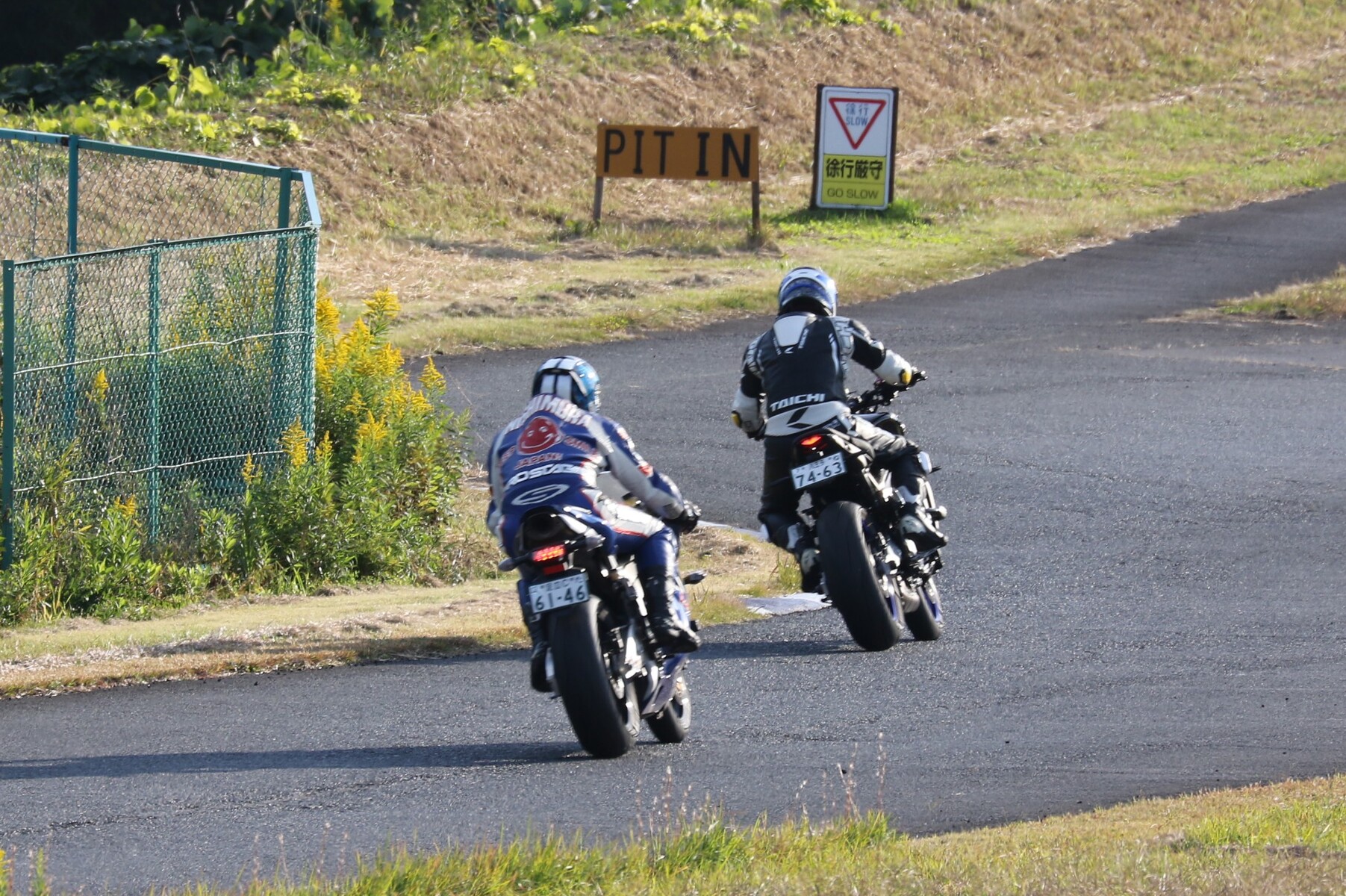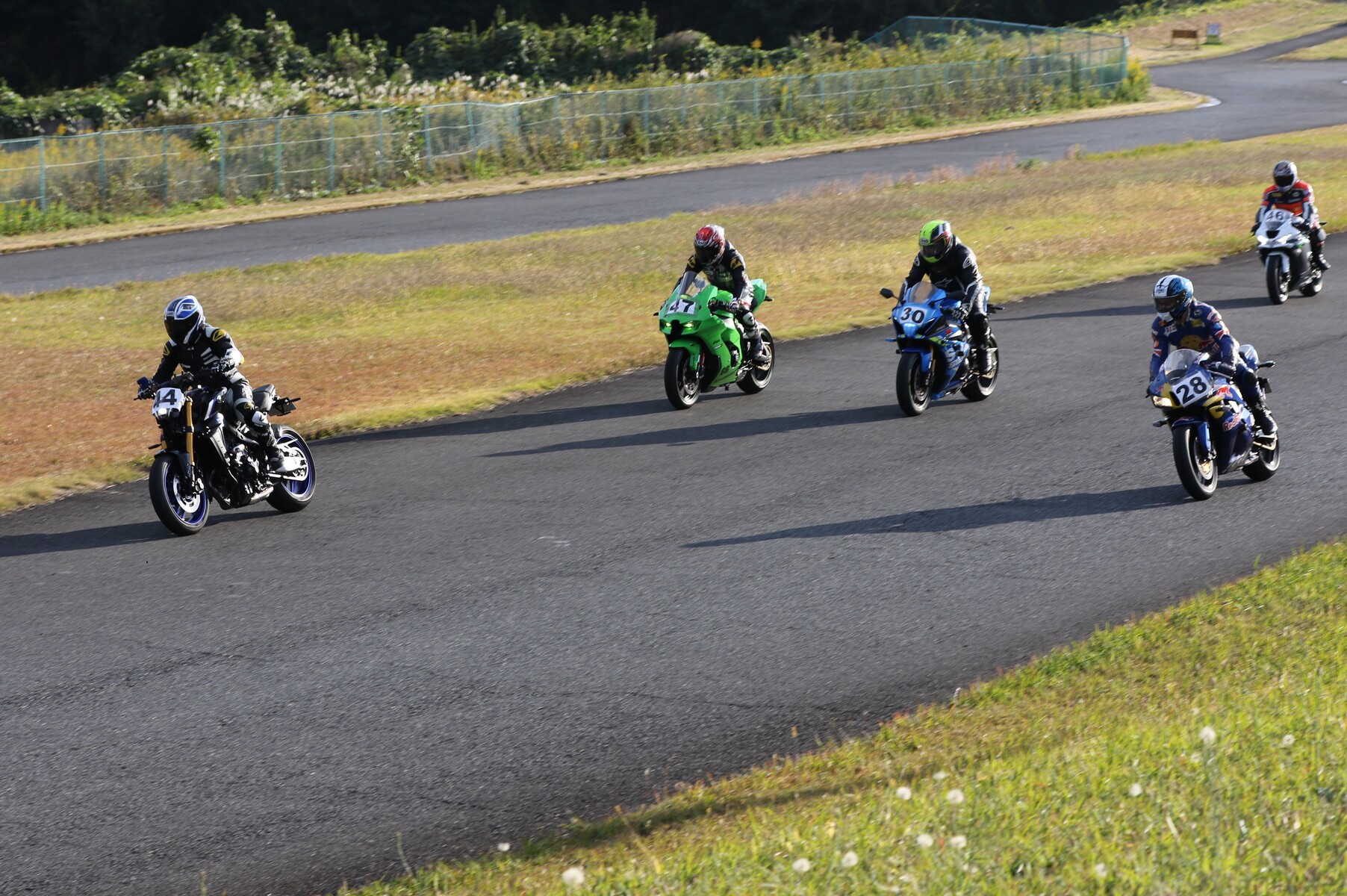 そのままホールショットを奪取。2番手に西村CBR600RR、3番手に二列目から上がってきた木村ZX10RR、4番手に服部GSXR1000R、5番手に菅原ZX6R、6番手に田北スピードトリプル1200RR………