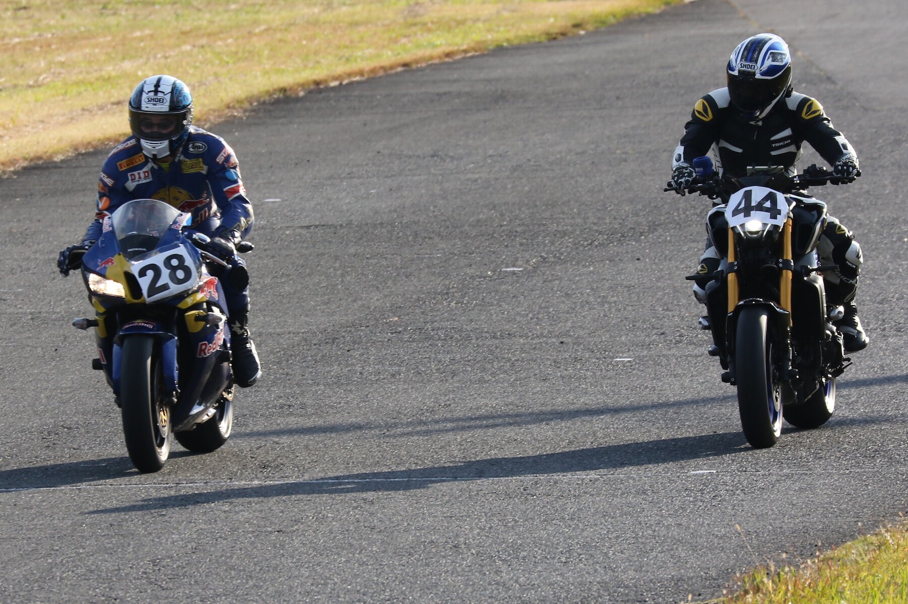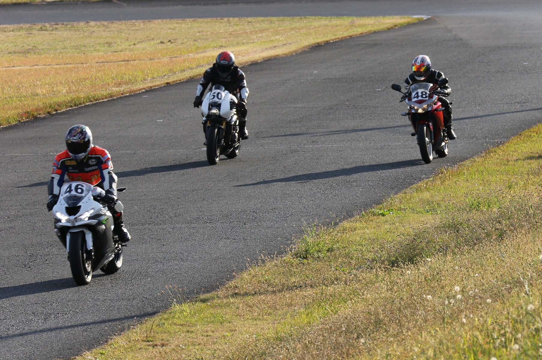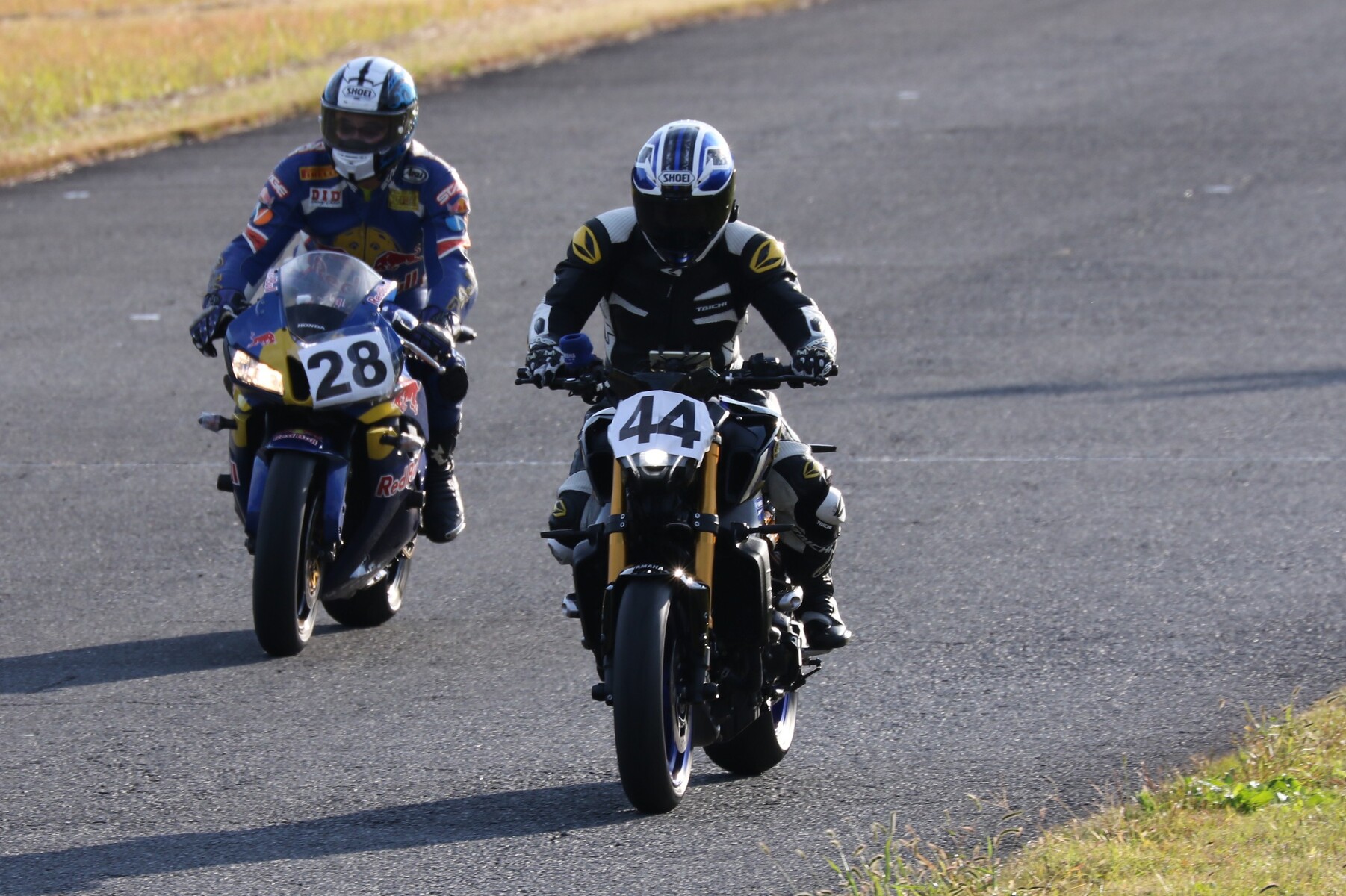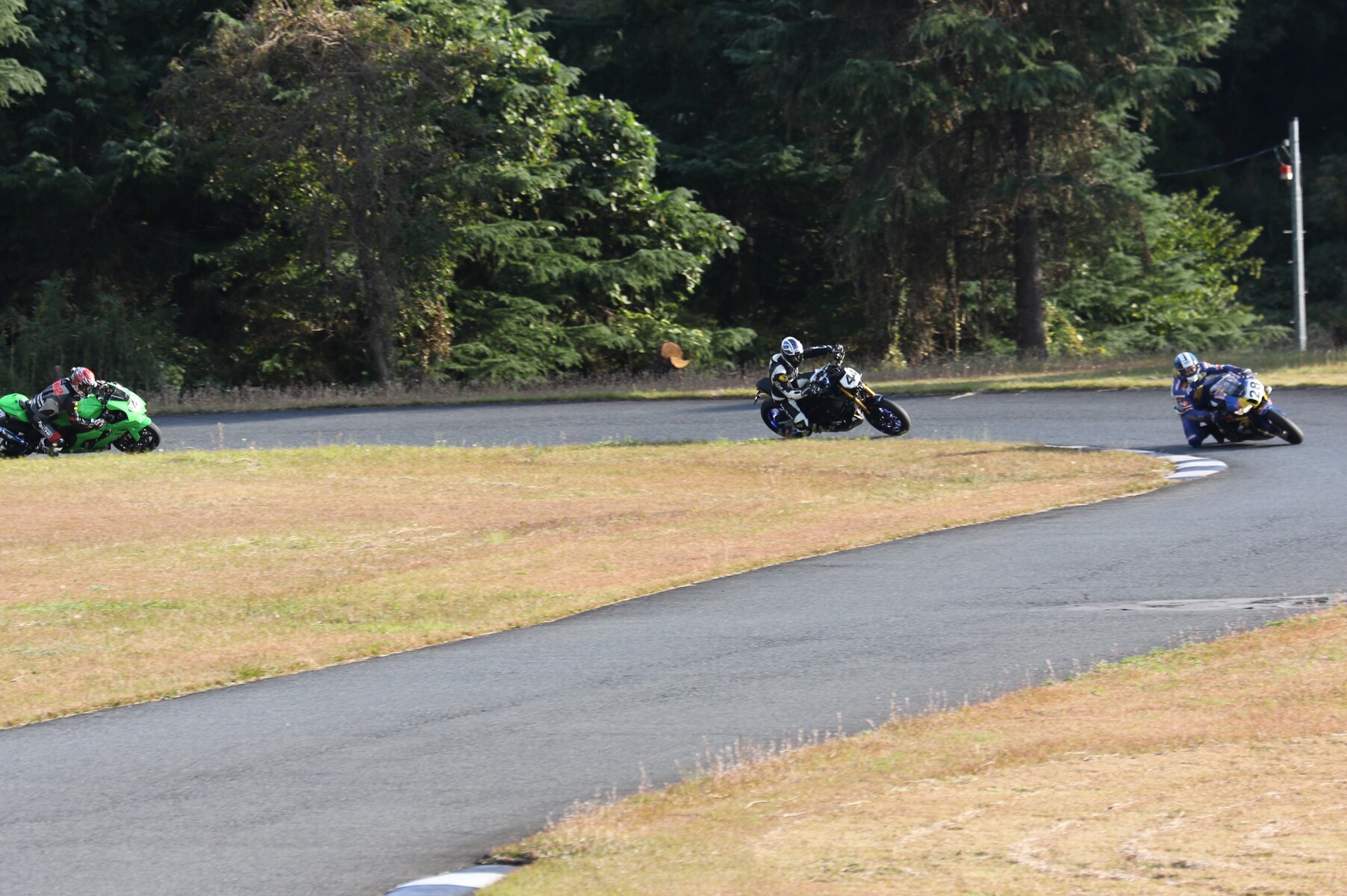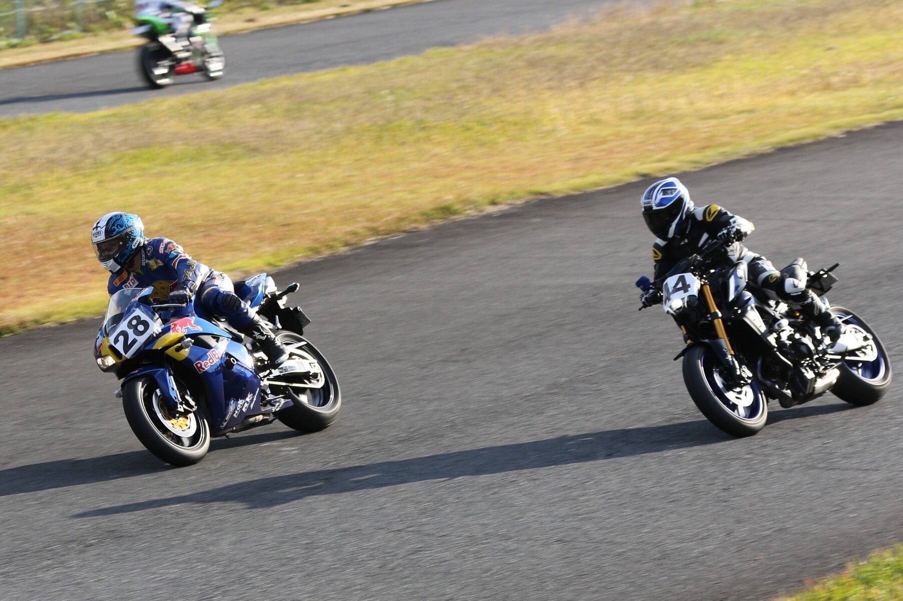 そのままホールショットを奪取。2番手に西村CBR600RR、3番手に二列目から上がってきた木村ZX10RR、4番手に服部GSXR1000R、5番手に菅原ZX6R、6番手に田北スピードトリプル1200RR………