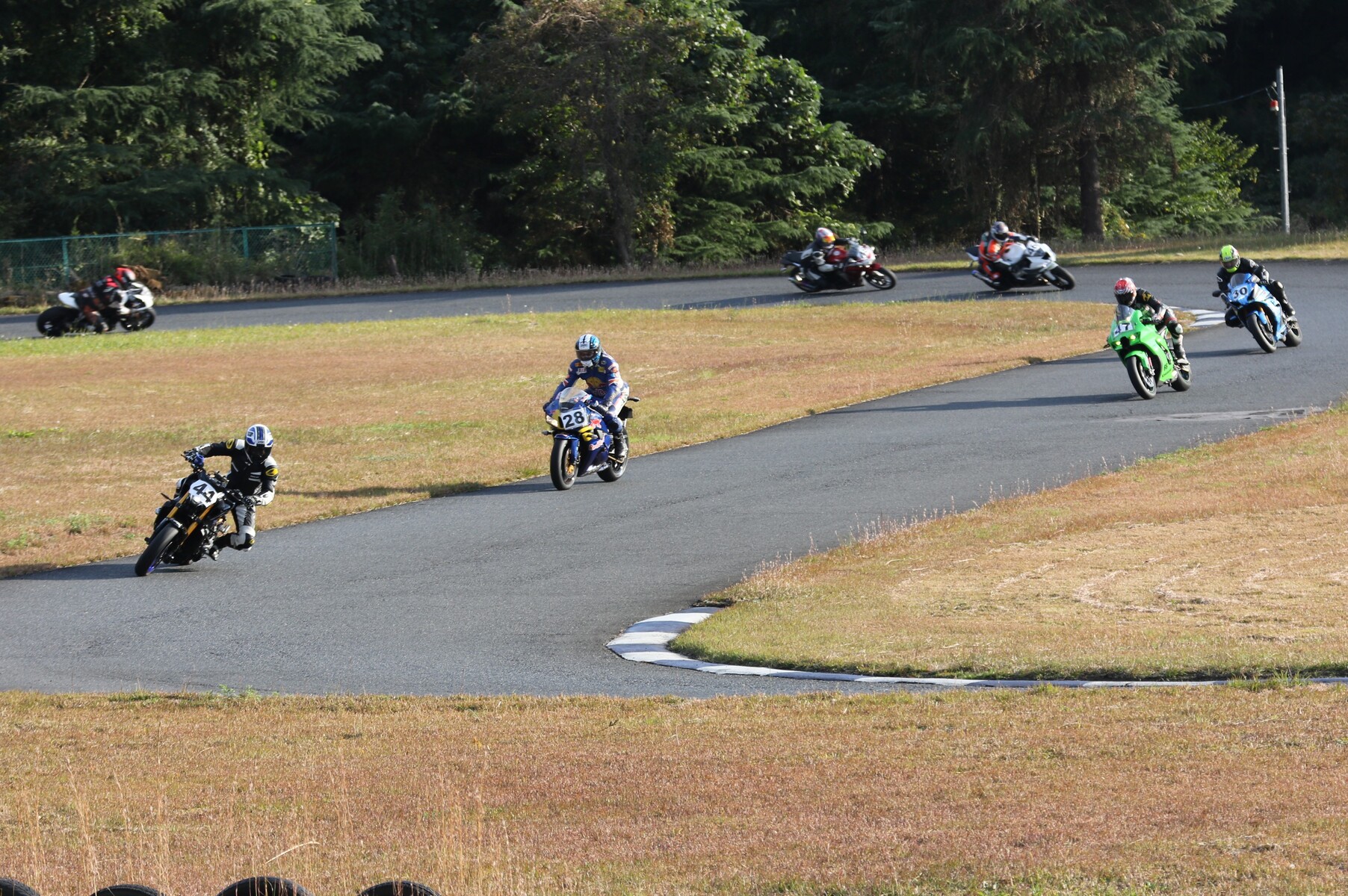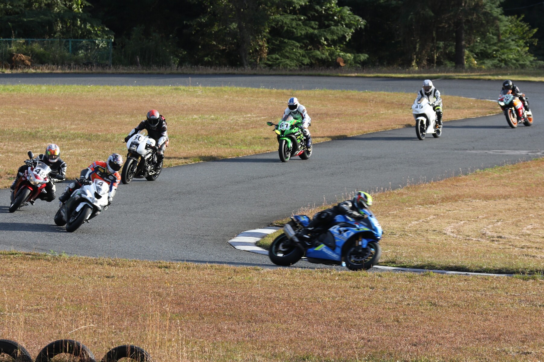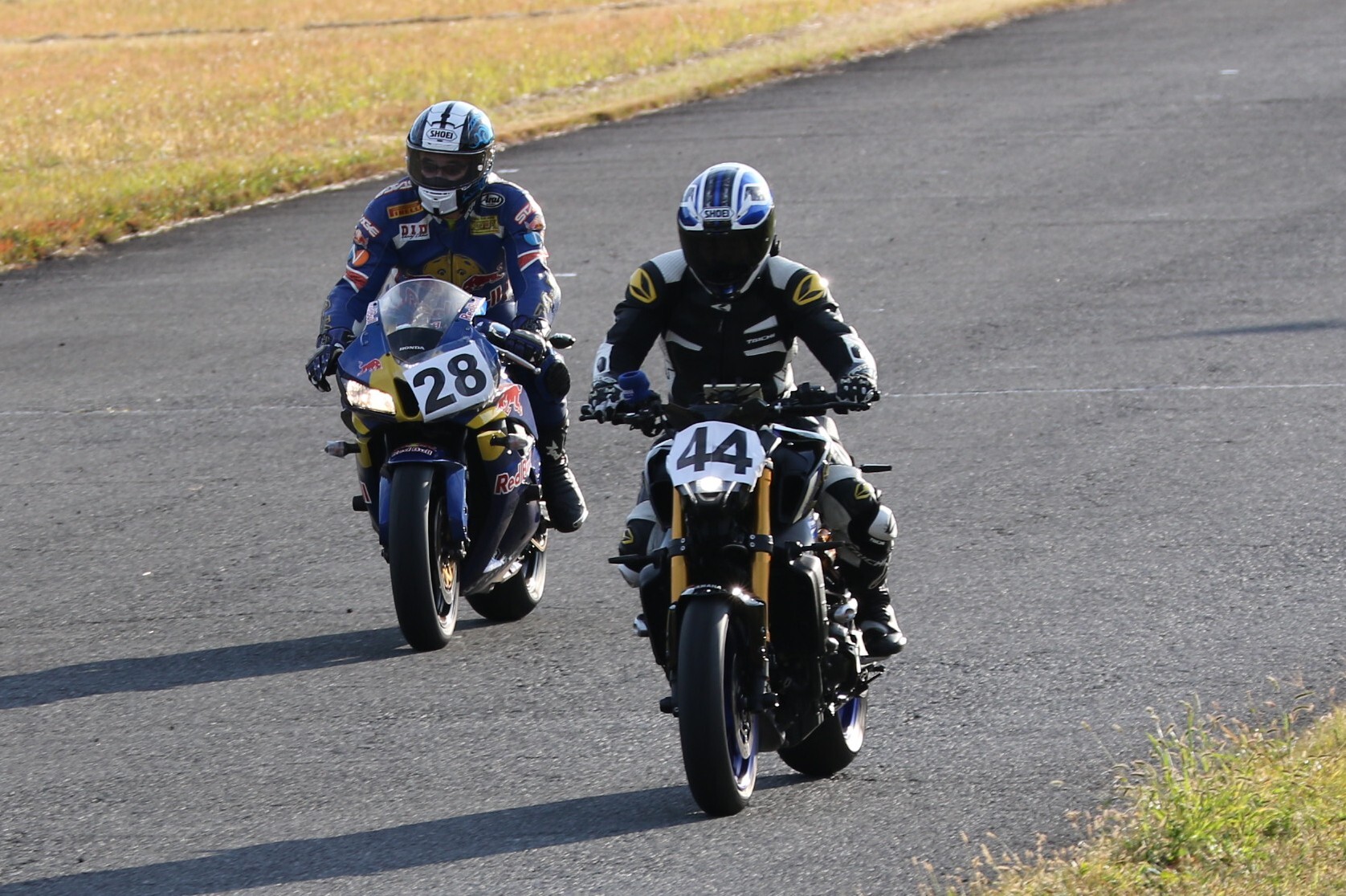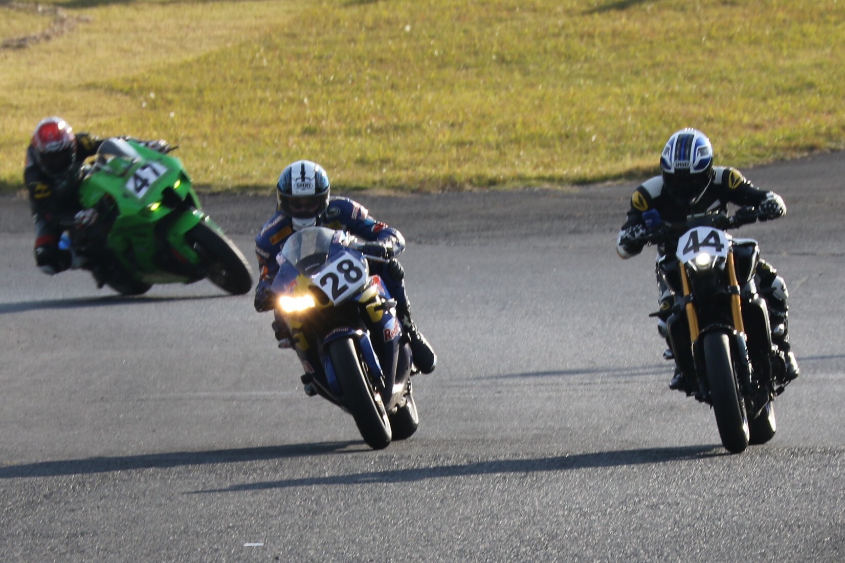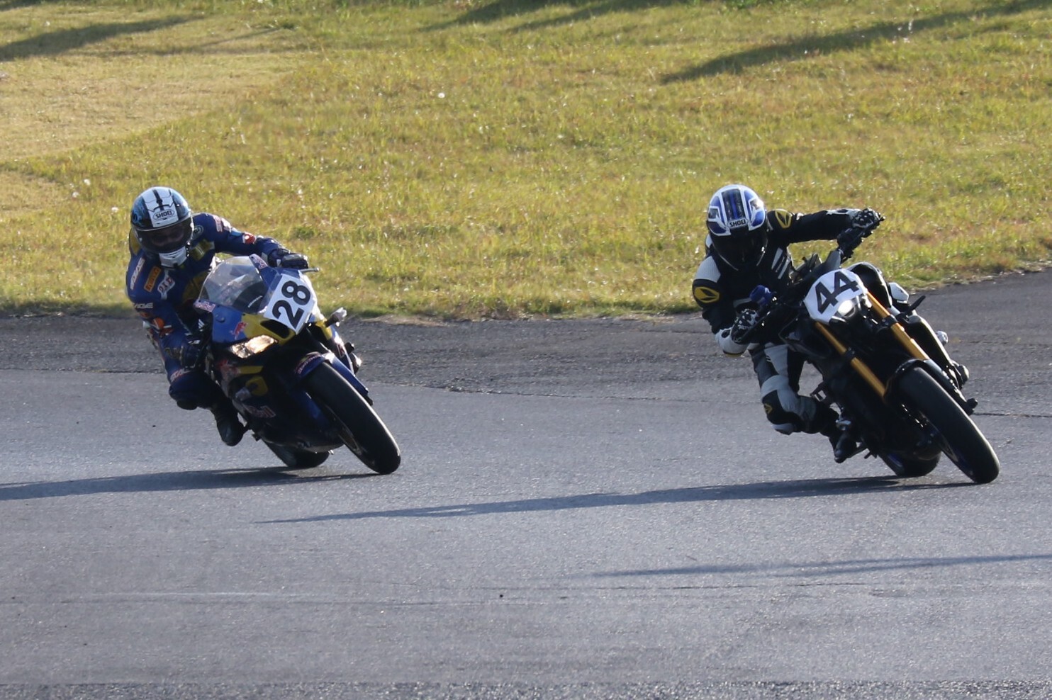 そのままホールショットを奪取。2番手に西村CBR600RR、3番手に二列目から上がってきた木村ZX10RR、4番手に服部GSXR1000R、5番手に菅原ZX6R、6番手に田北スピードトリプル1200RR………
