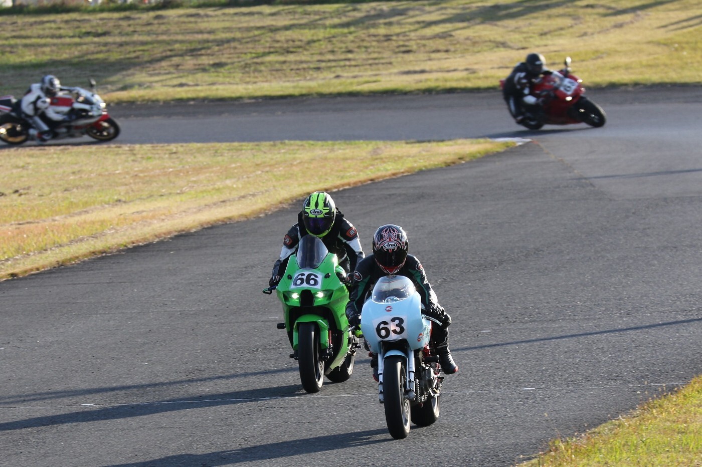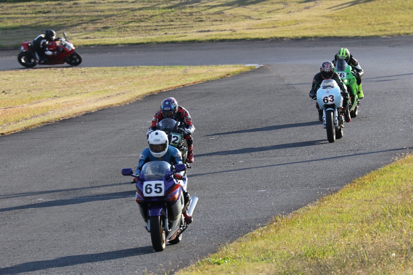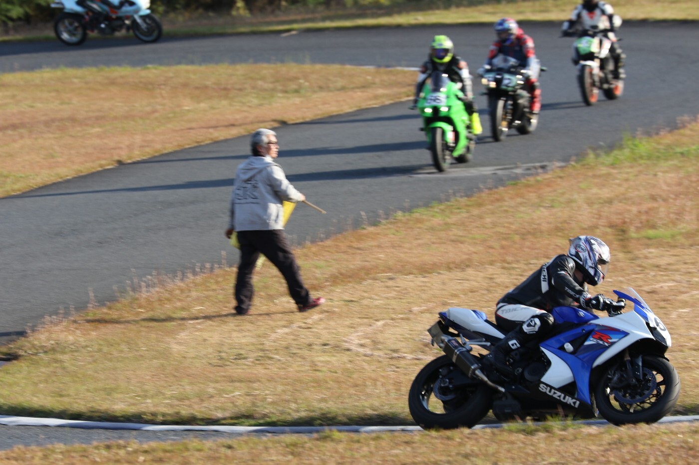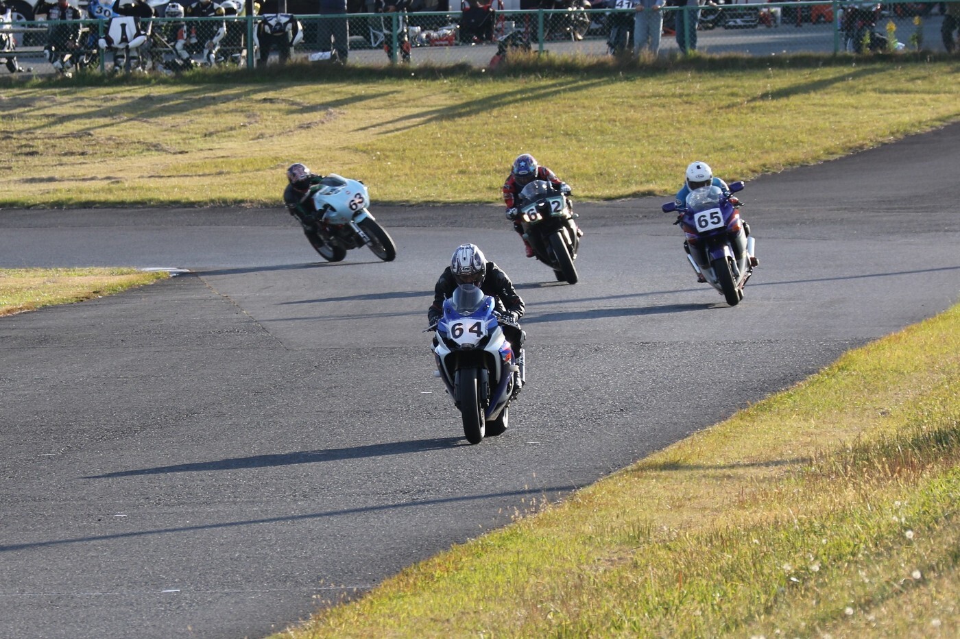 予選2番手から出た生田GSXR1000、そして二列目5番手からダッシュした小見ZZR600。ポールポジションスタートの関坂CBR600RRは3番手に陥落、4番手に吉川号MH900E………