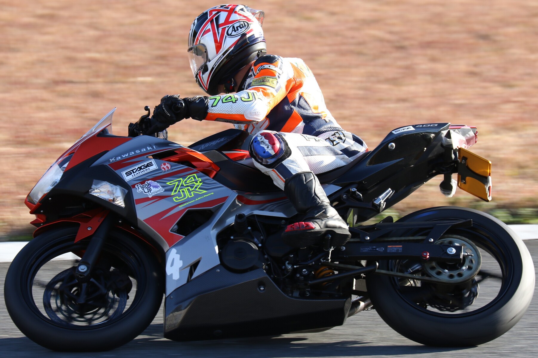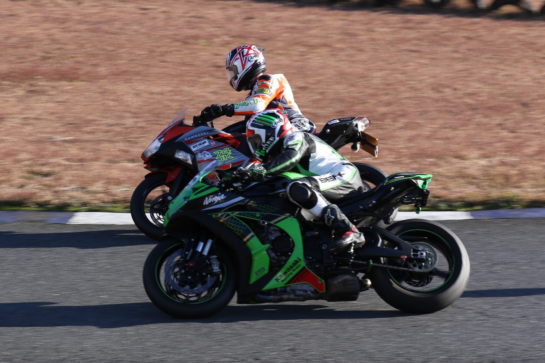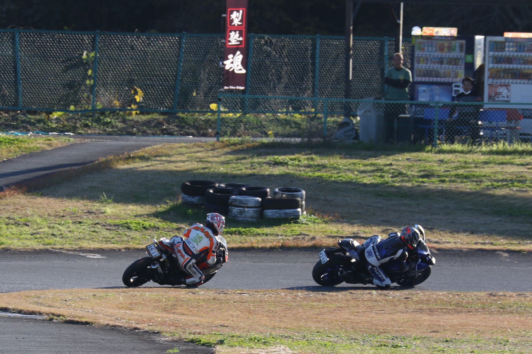 濱にプレッシャーをかけて行く。嶋村のマシンは、こちらでも話題のNinja400梨塾ガレージコンプリート、その初号機である。ファイナルラップに逆転なるか。