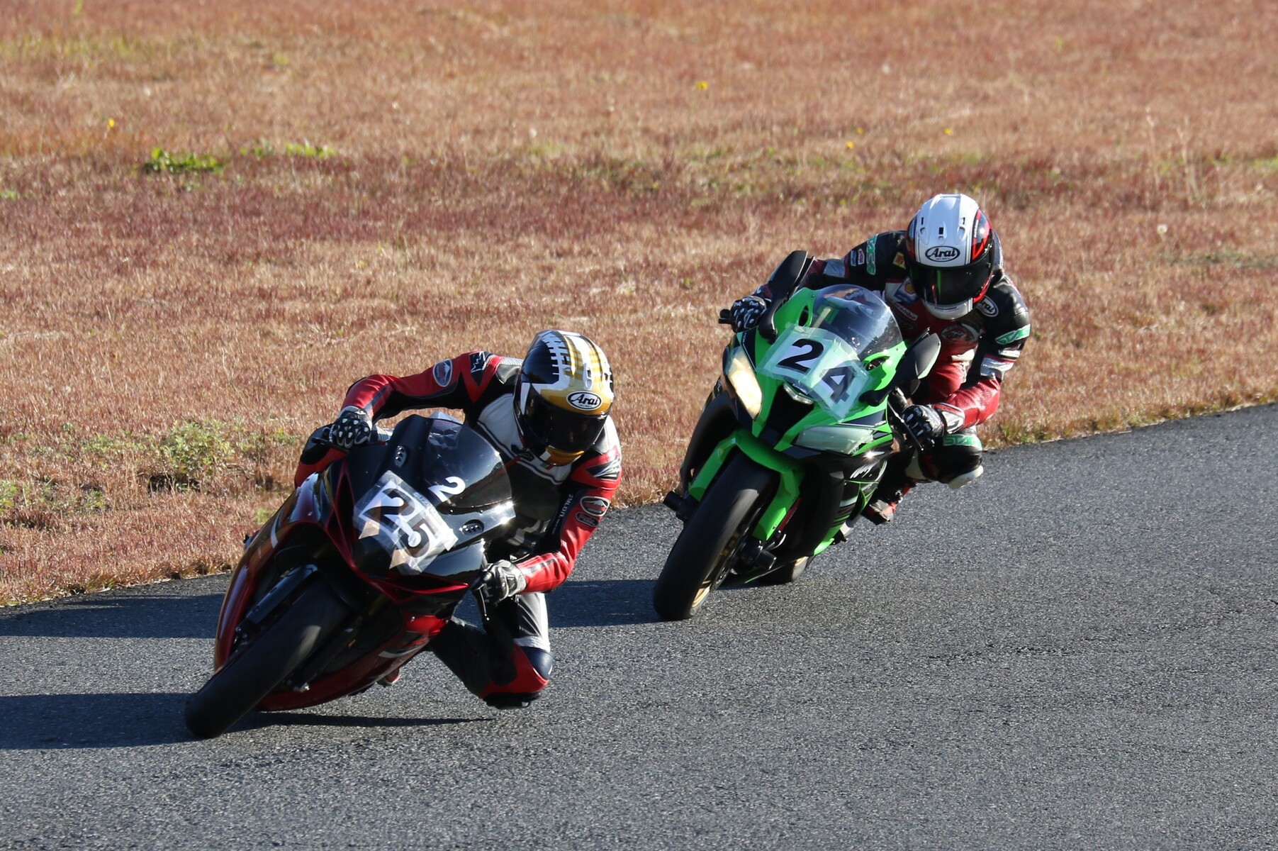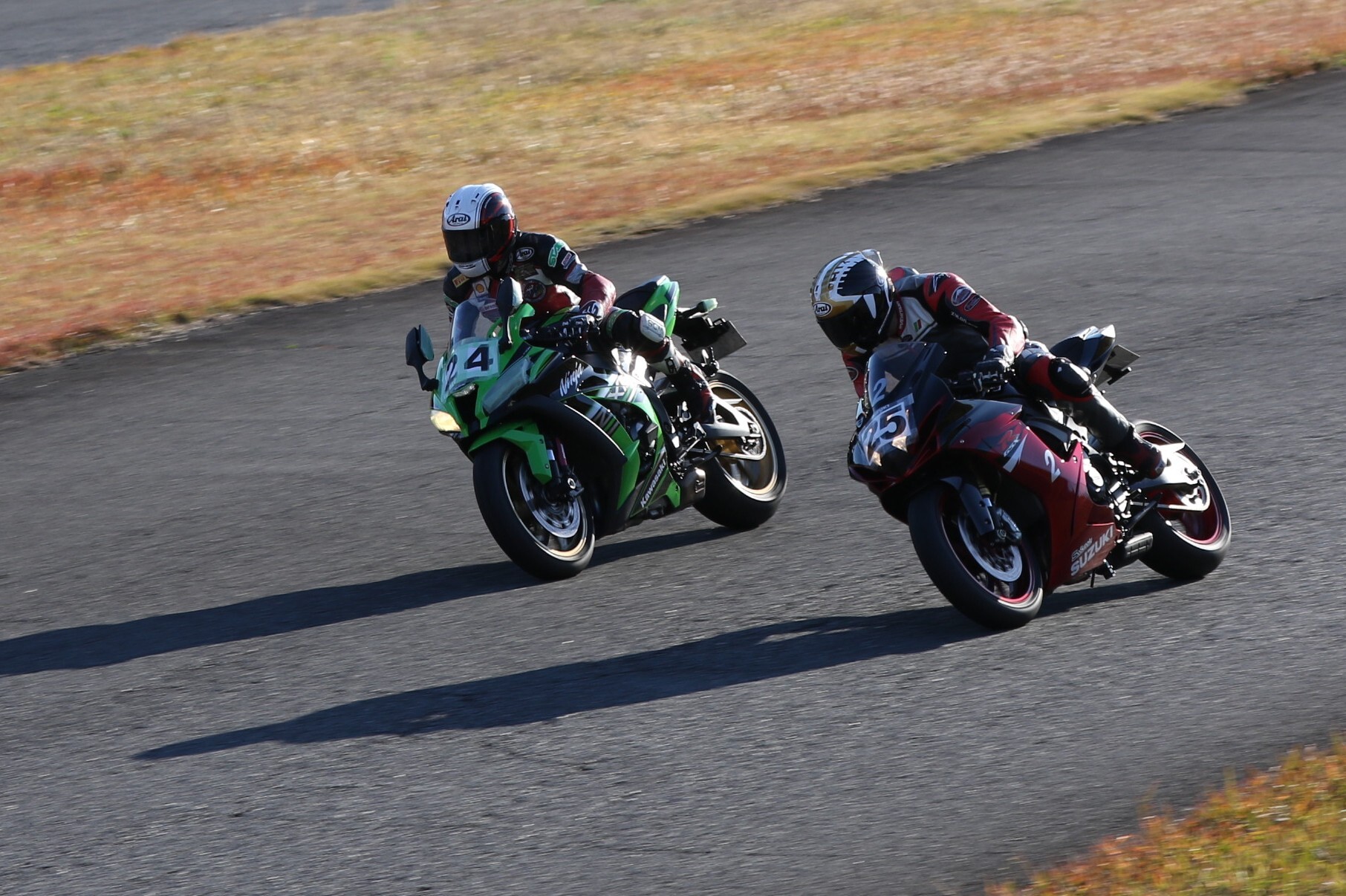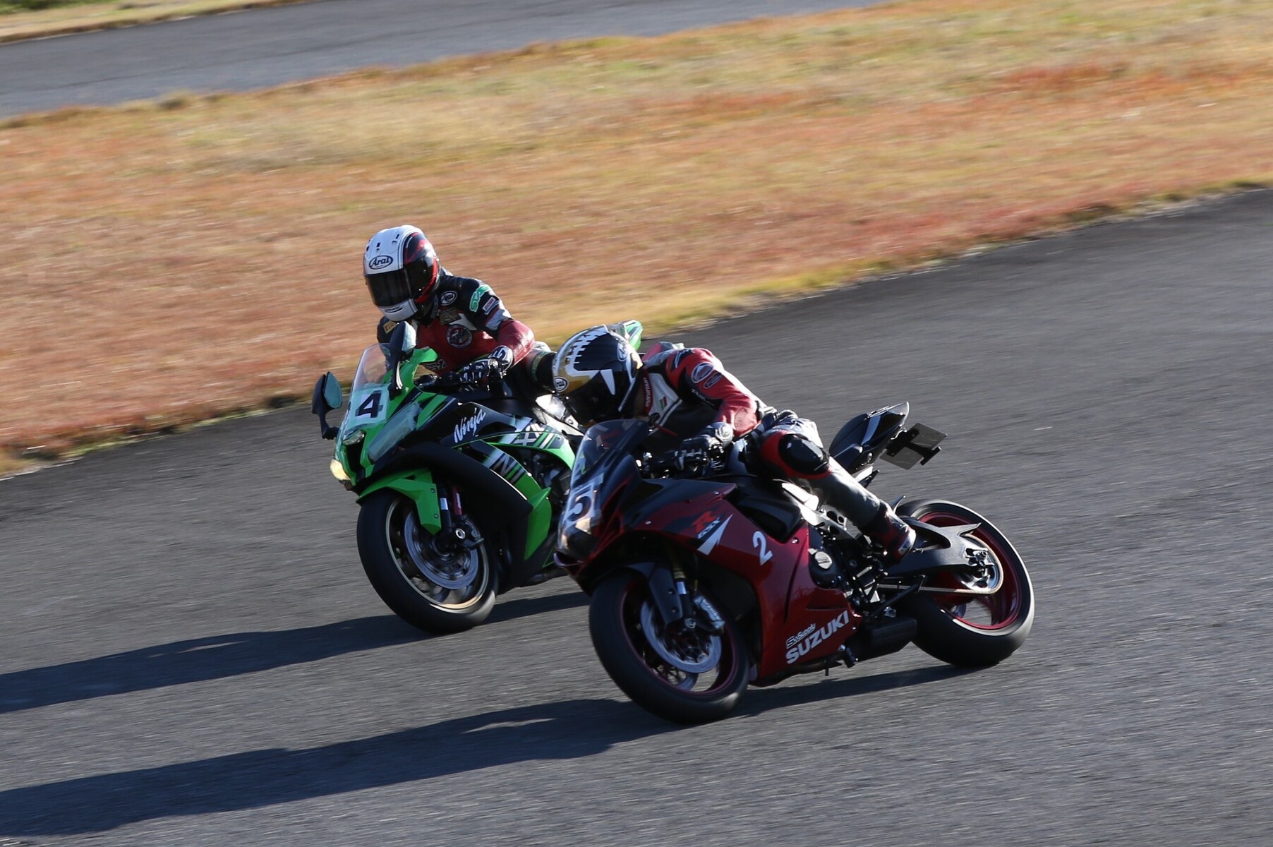 濱にプレッシャーをかけて行く。嶋村のマシンは、こちらでも話題のNinja400梨塾ガレージコンプリート、その初号機である。ファイナルラップに逆転なるか。