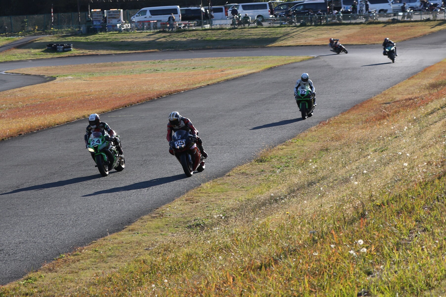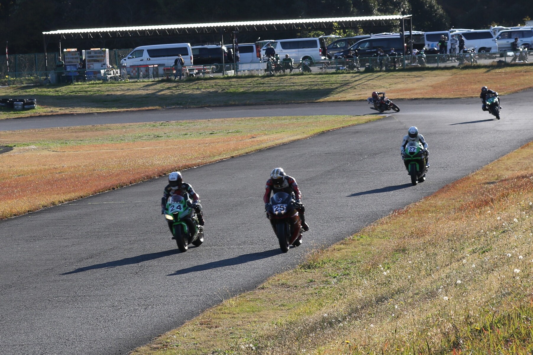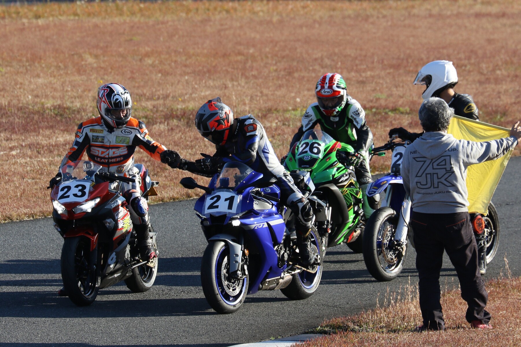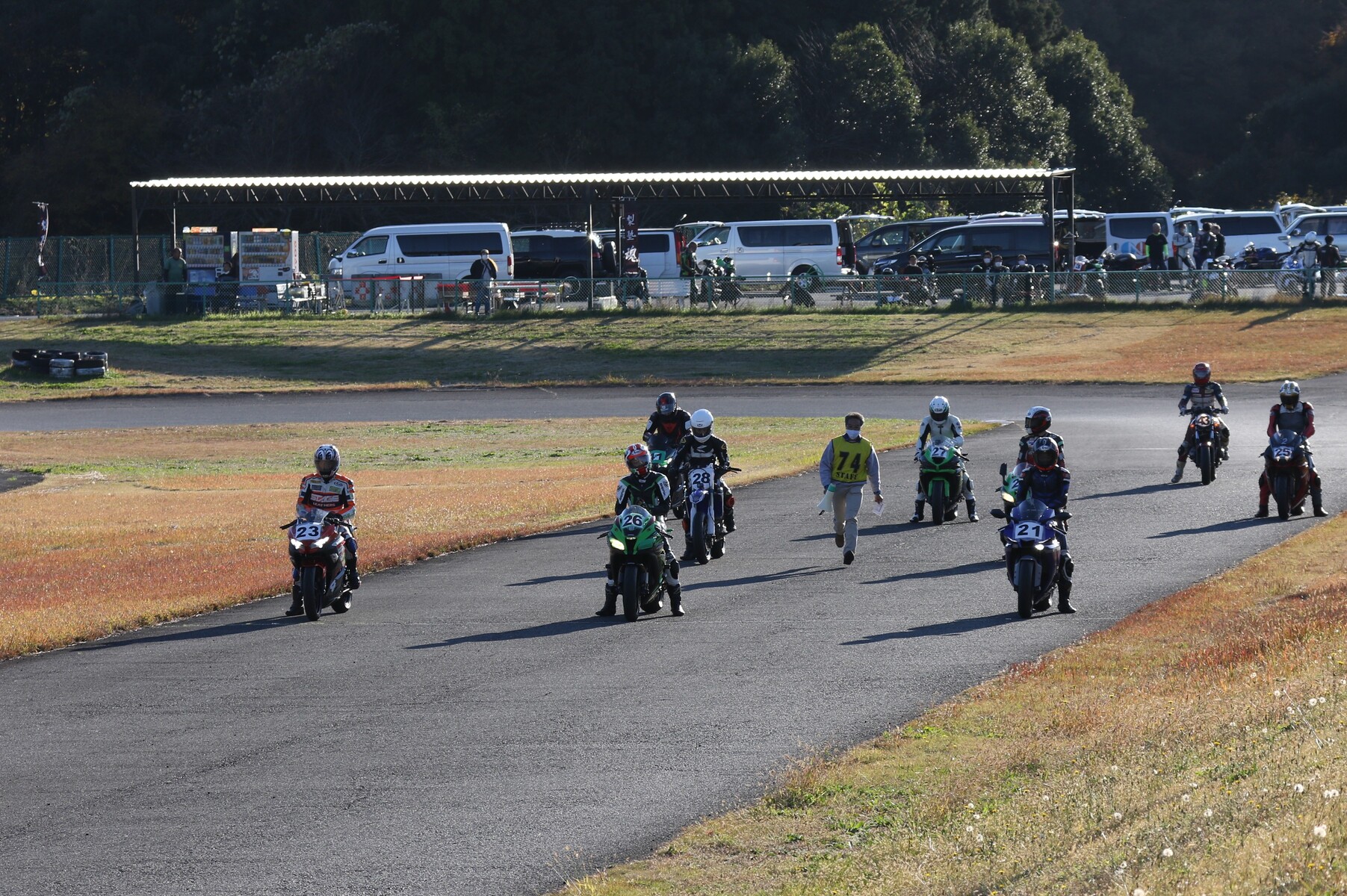 グリッドに整列。フロントローにはR1、ZX10R、そして梨塾ガレージコンプリートのNinja400が並ぶ。ポールポジションタイムは27秒343、ボーダータイムは29秒015。