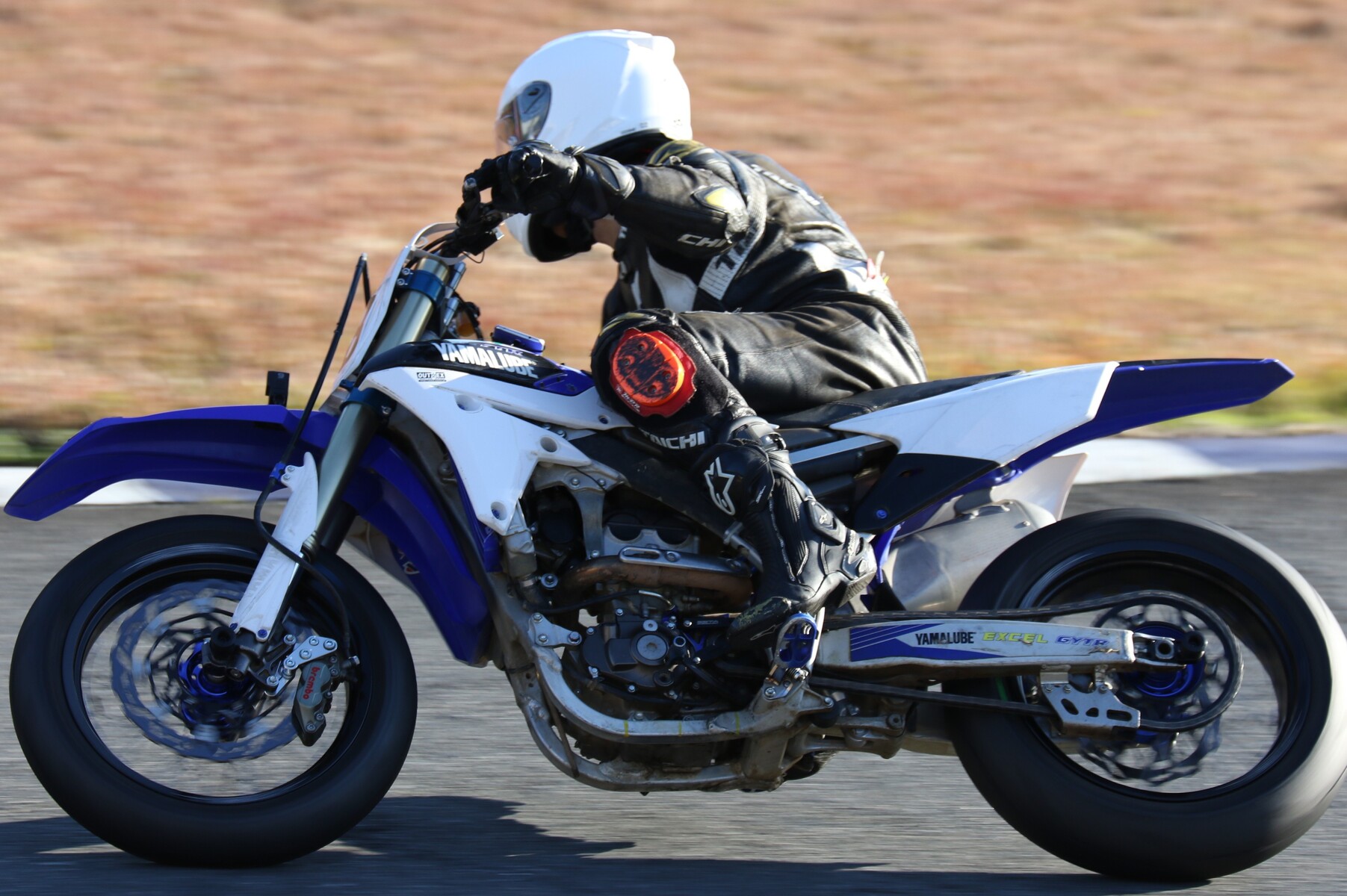 250ccのモタード仕様ながらも、力走するトシチョウ。