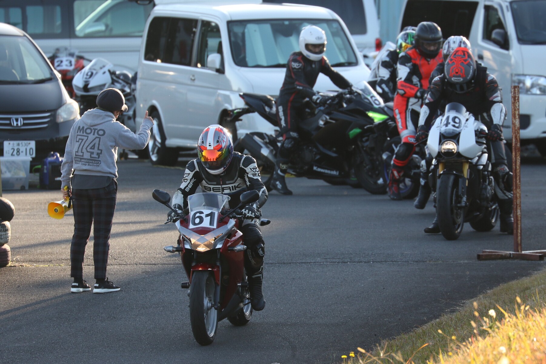 ポールポジションの佐藤CBR250R。レーススタートで、もっともやってはいけない「ポールポジションのエンスト」という失態。しかし後続はすぐにこれに気付いて………