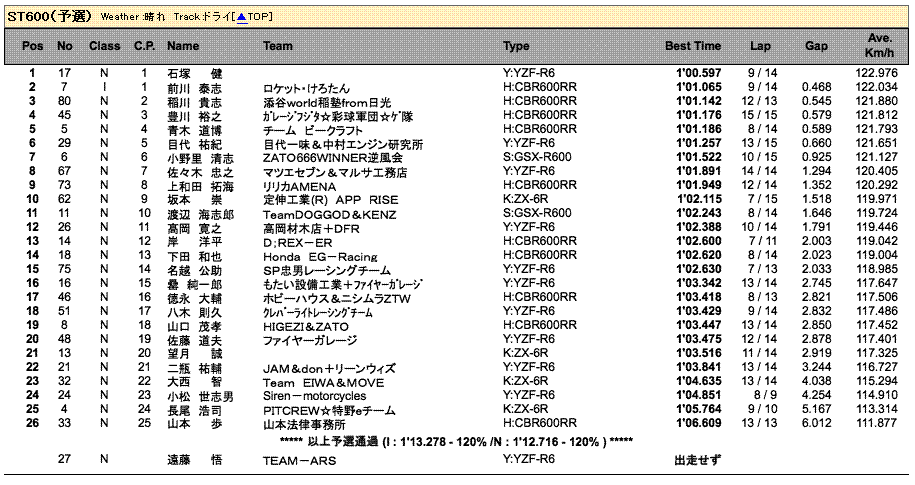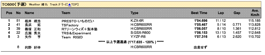 TC600結果。やはりベストタイムからは1秒以上も開いてしまった。決勝ではどうなるだろうか。