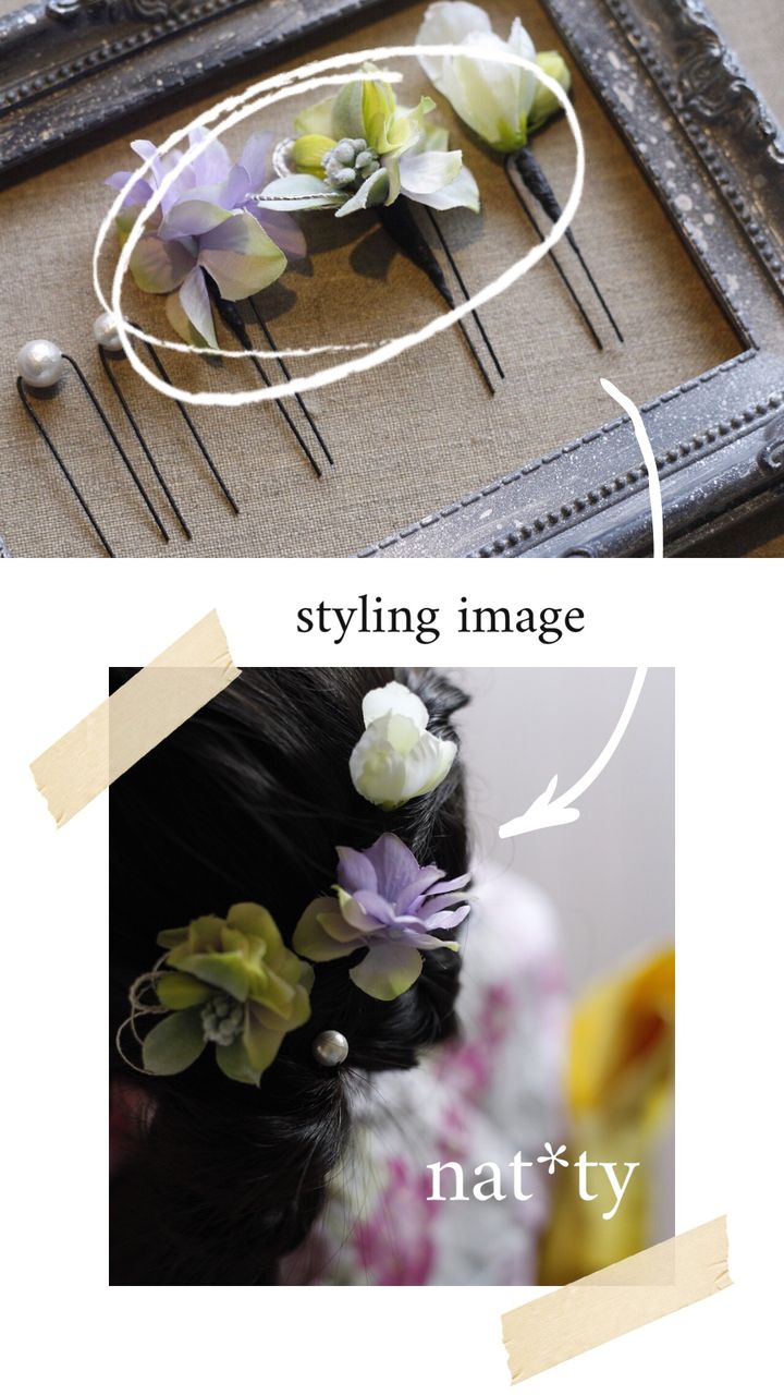 セルフアレンジヘアに髪飾りをつけるだけで、浴衣スタイルが華やかに決まります。髪型に合わせて、お花をまとめてつけたり、散らしてつけたりとアレンジをお楽しみください(^^)