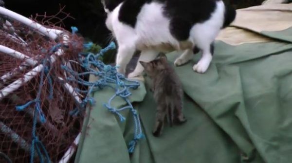 近くにある踏切の音を警戒しながら、親猫は子猫のもとへ戻ります。