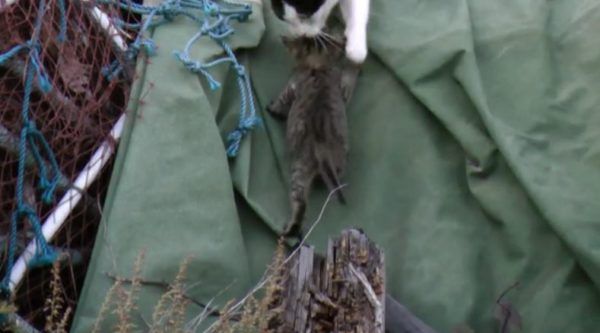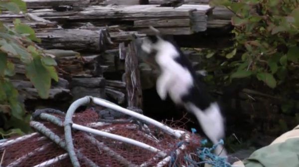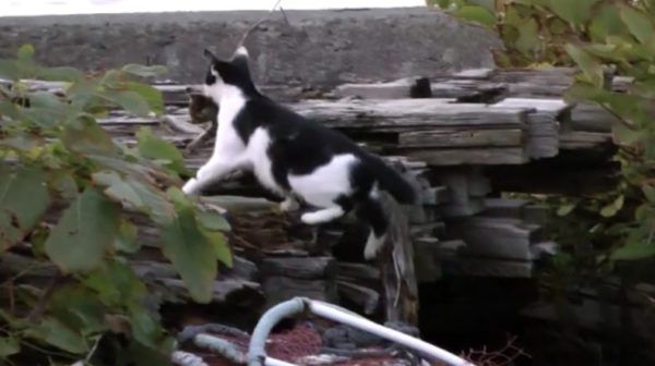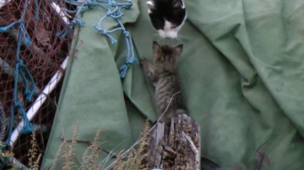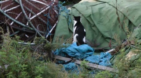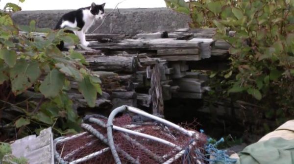 海辺の資材置き場のような場所。画面真ん中に白と黒の猫がいます。ミャーミャーと子猫の声も聞こえてきます。