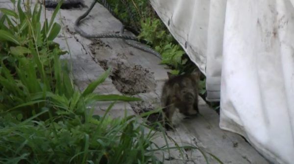 草むらからよちよちと子猫があらわれました。鳴きながら親猫を追いかけます。
