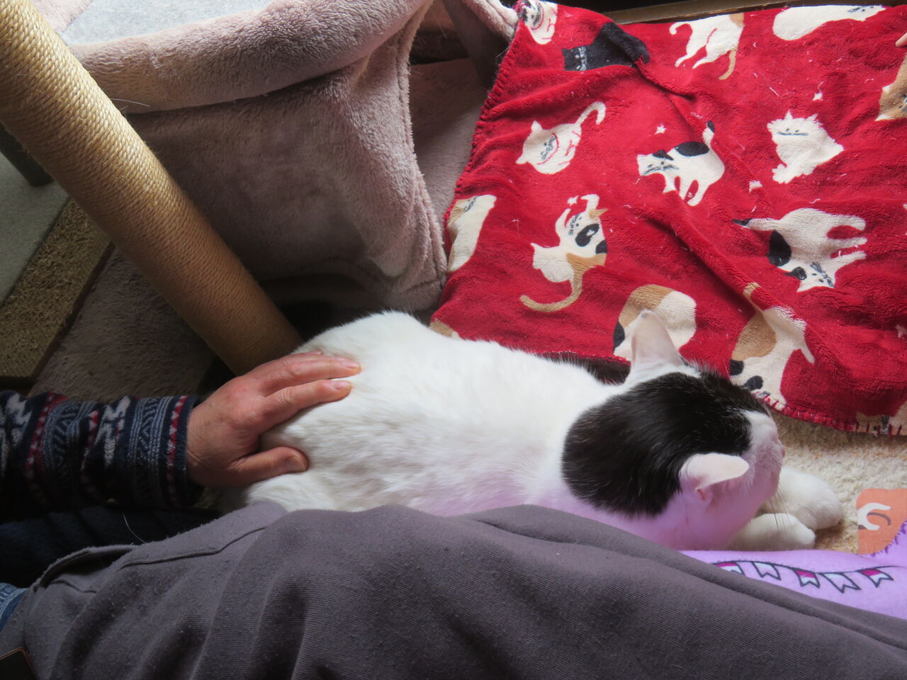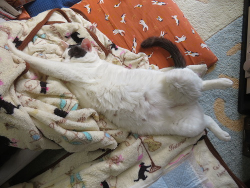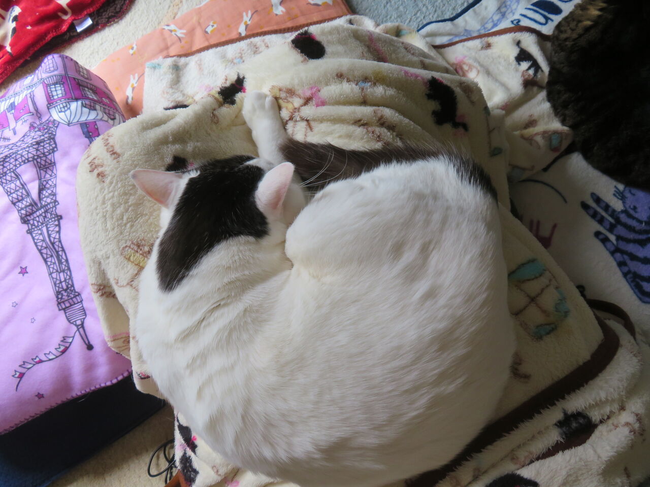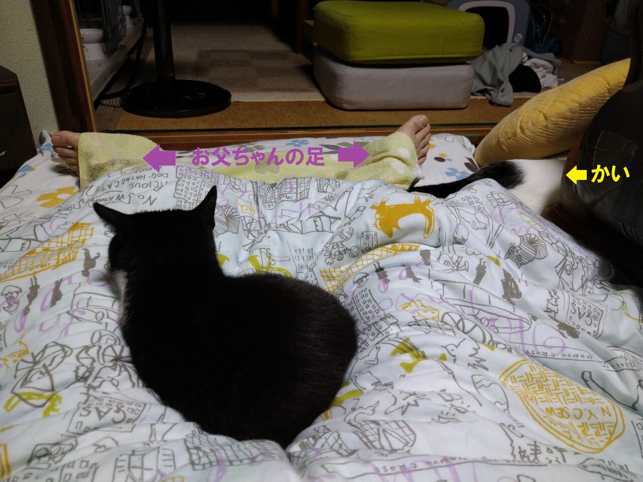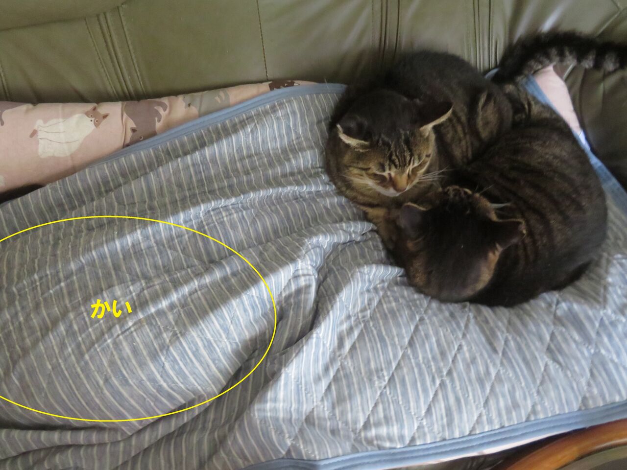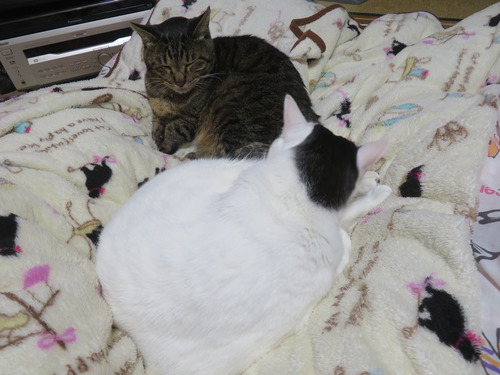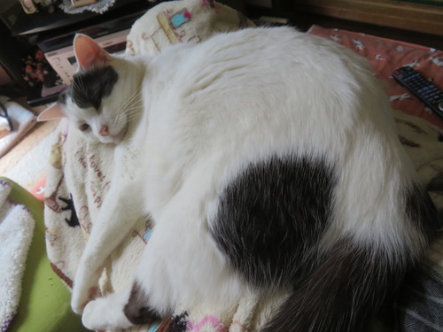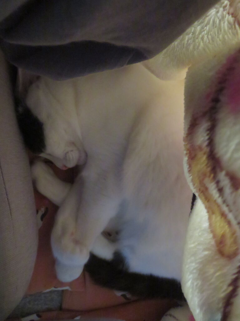 16時少し前、毛布をかけてマッタリすると、足の間を陣取った”かい”、そこへ・・・