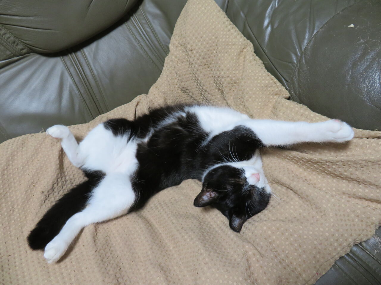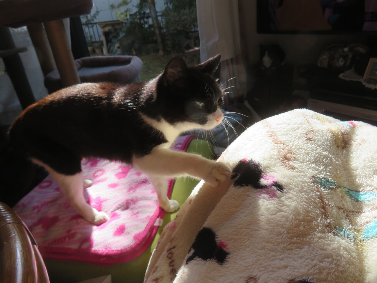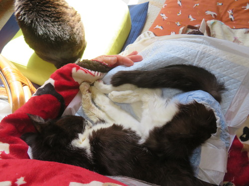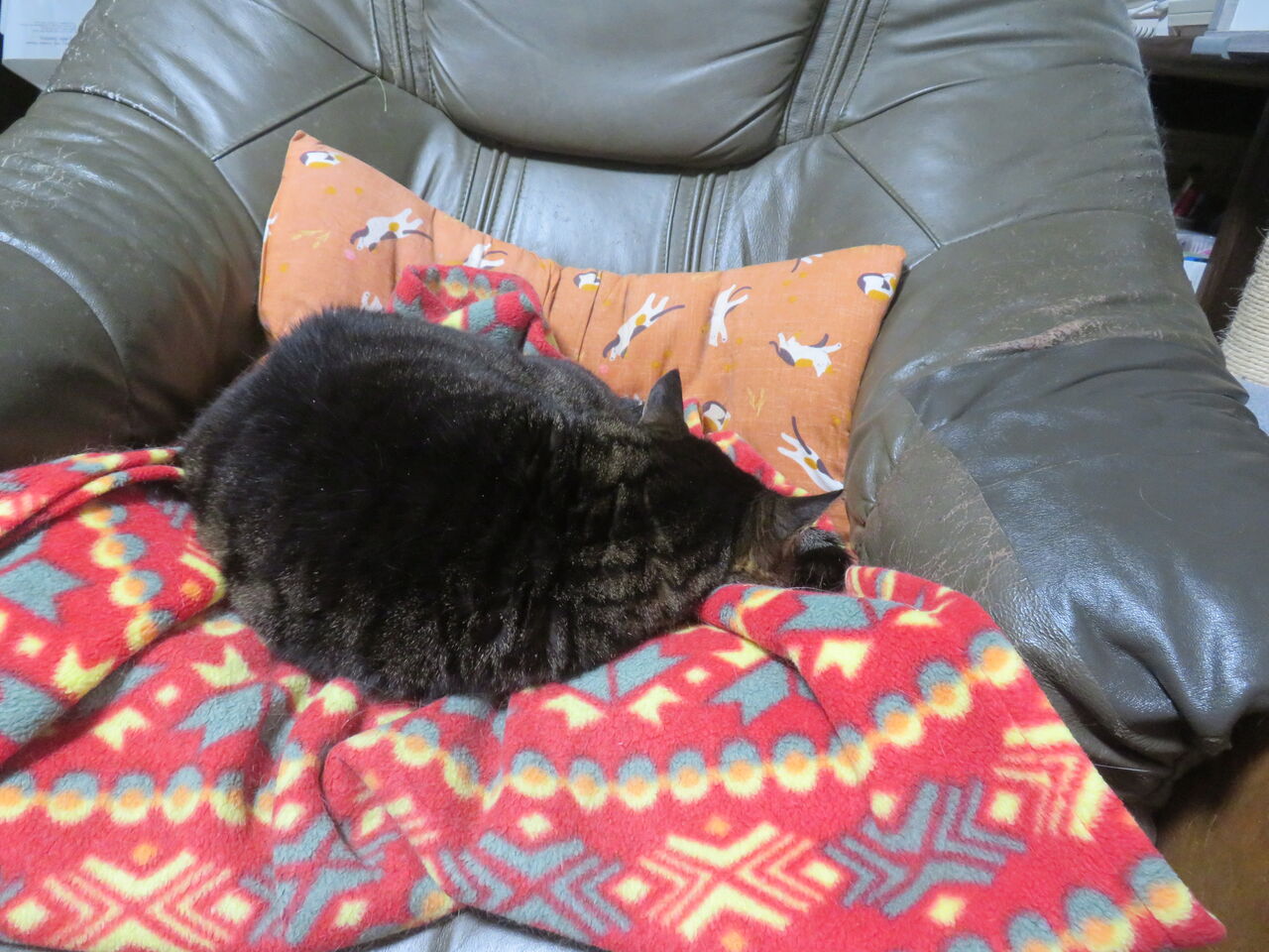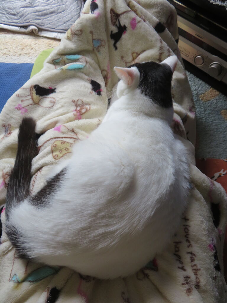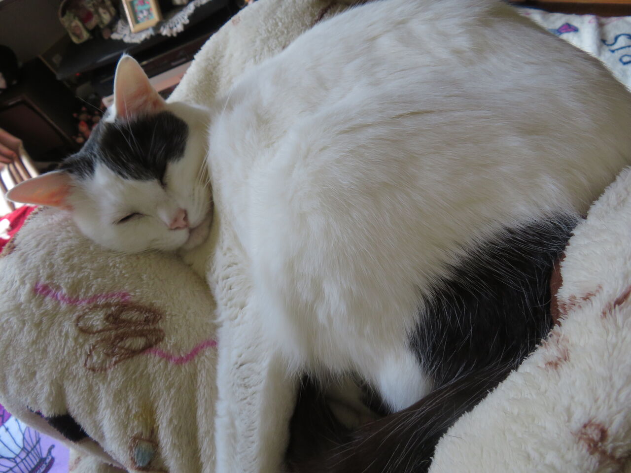 16時少し前、毛布をかけてマッタリすると、足の間を陣取った”かい”、そこへ・・・