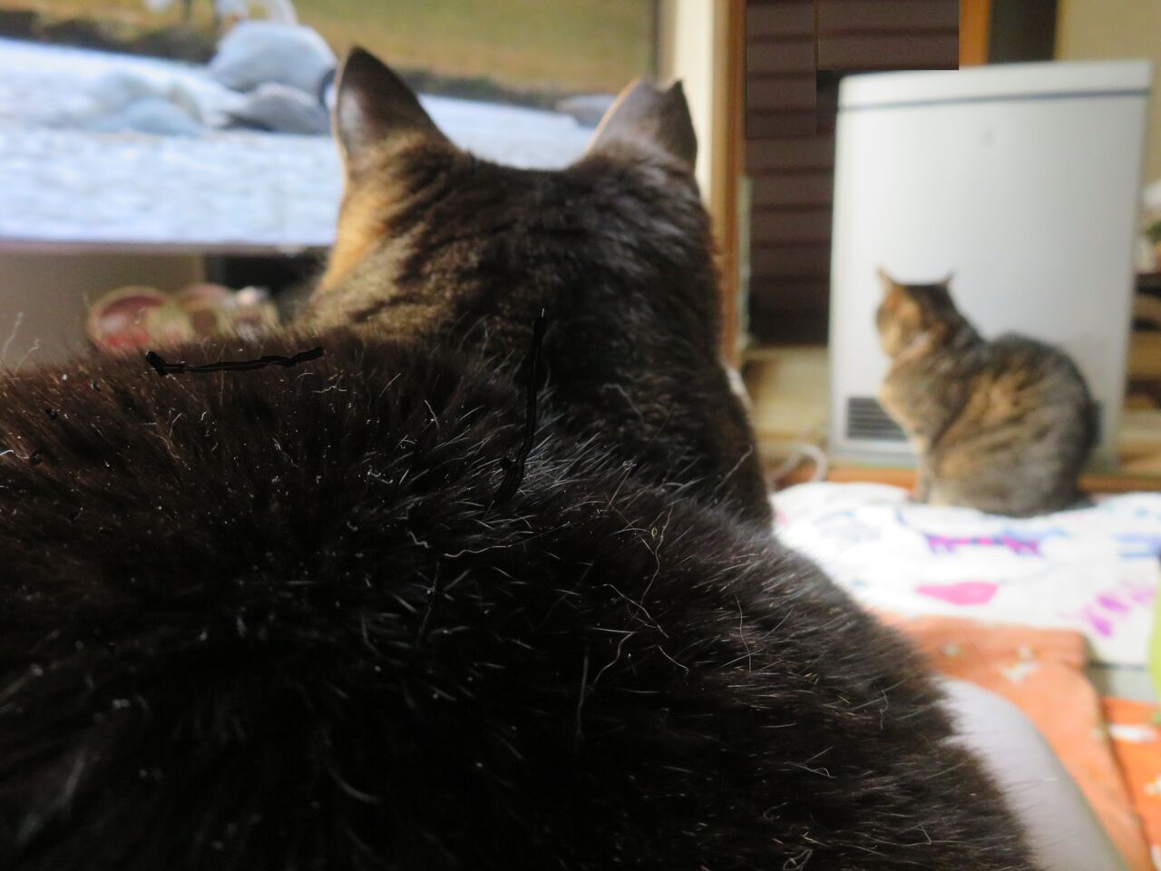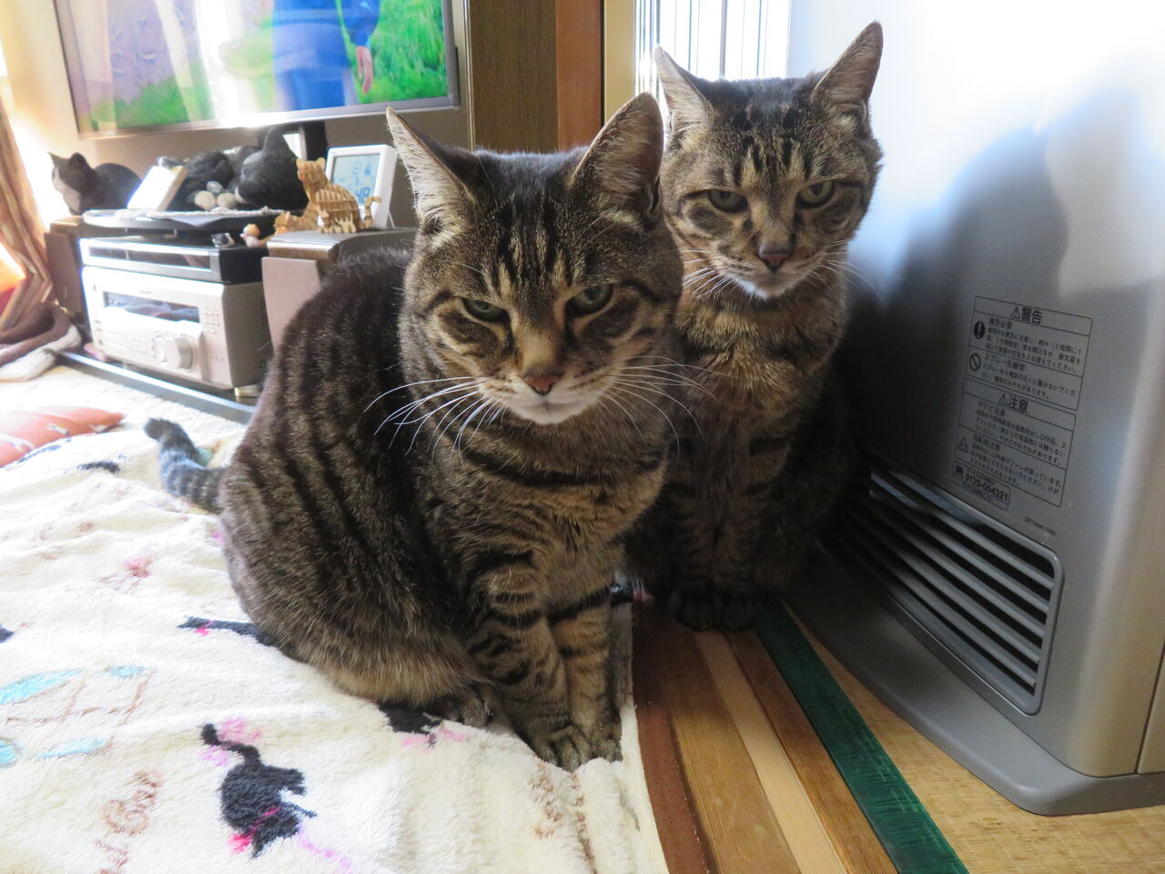 ストーブ前にいる”うみ”を見ている”たくみ”、いつもと違うのがわかるのかな?