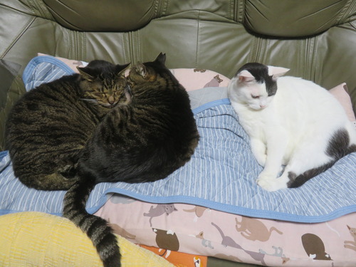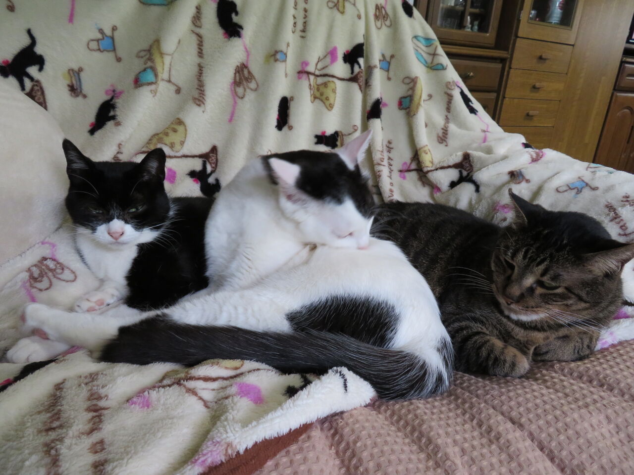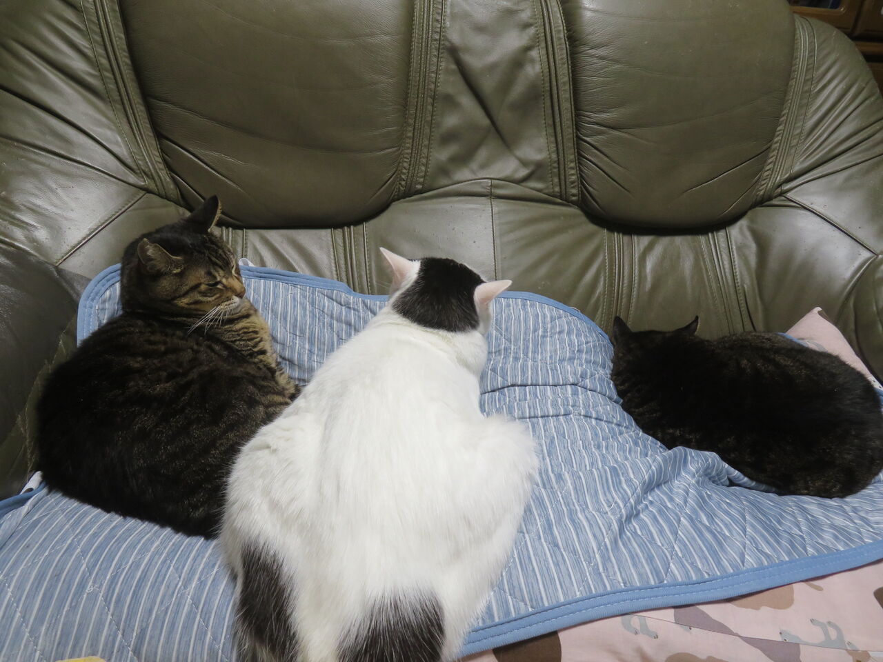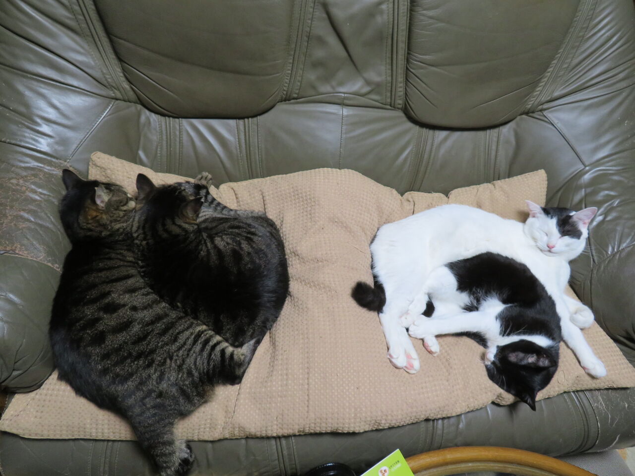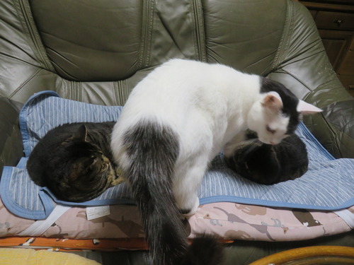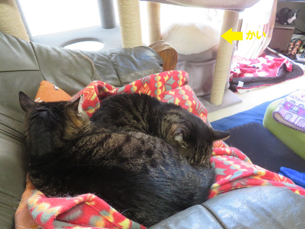 ”かい”もソファで寝たかったようですが、”なな&たく”の間に入れなくて居る”かい”を見て、「おいで」と声をかけると、膝の上に乗ってきました