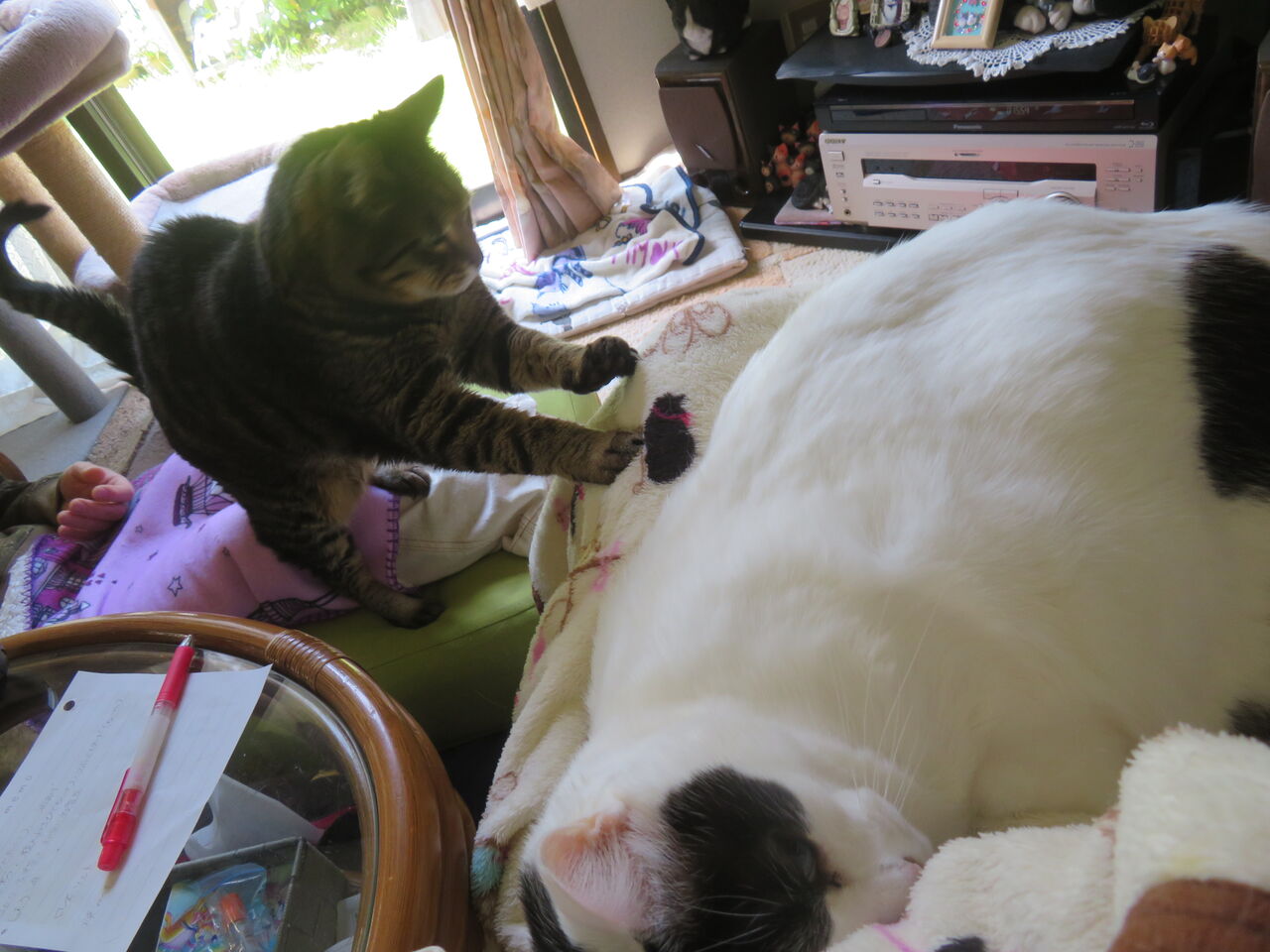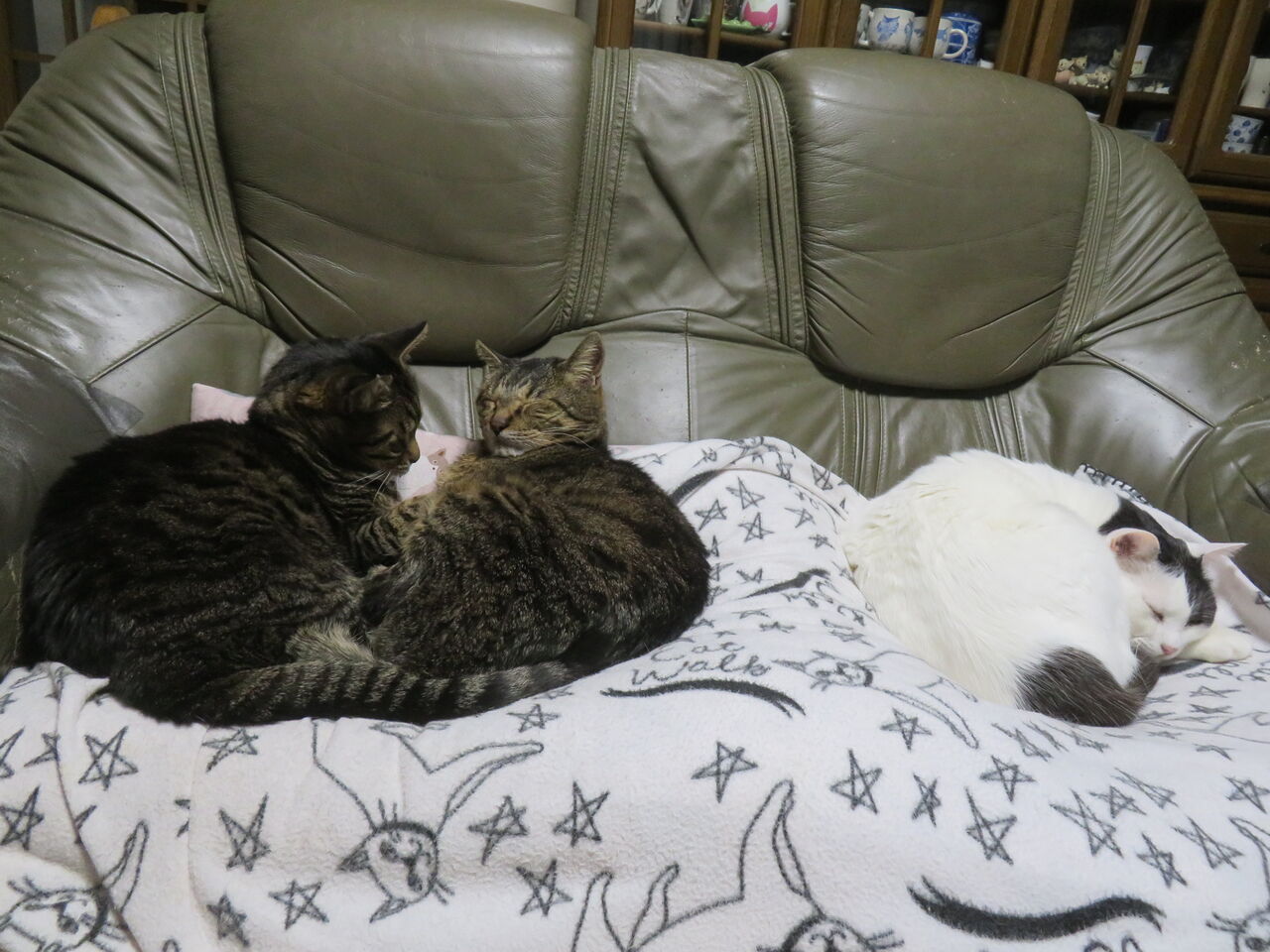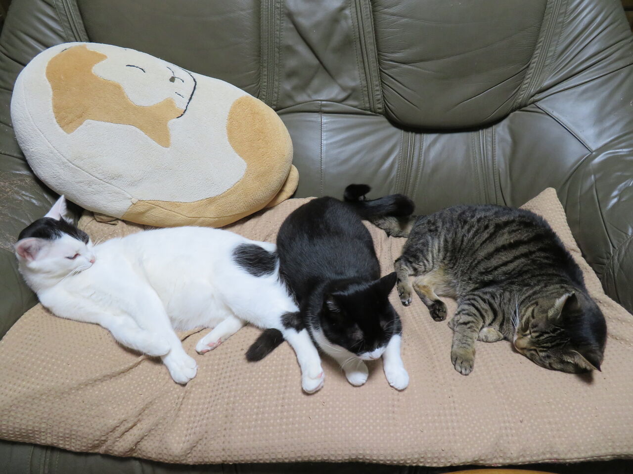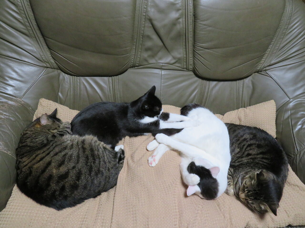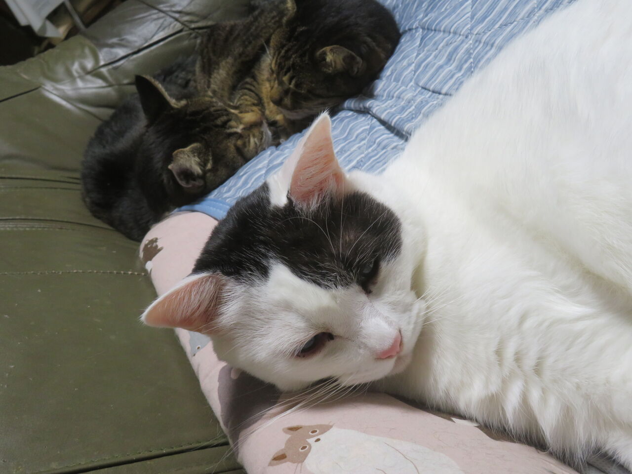 ”かい”もソファで寝たかったようですが、”なな&たく”の間に入れなくて居る”かい”を見て、「おいで」と声をかけると、膝の上に乗ってきました