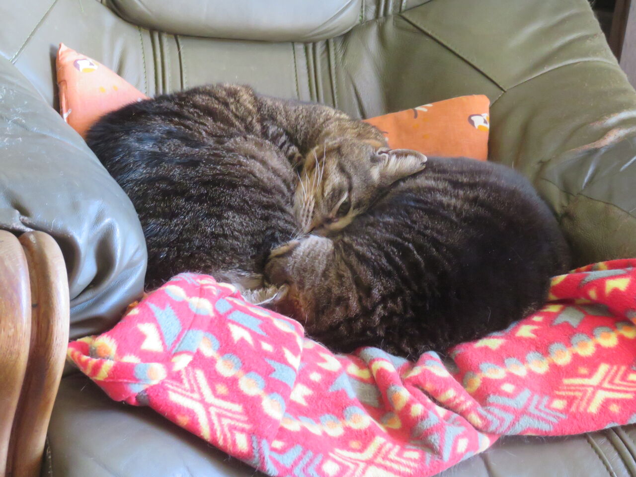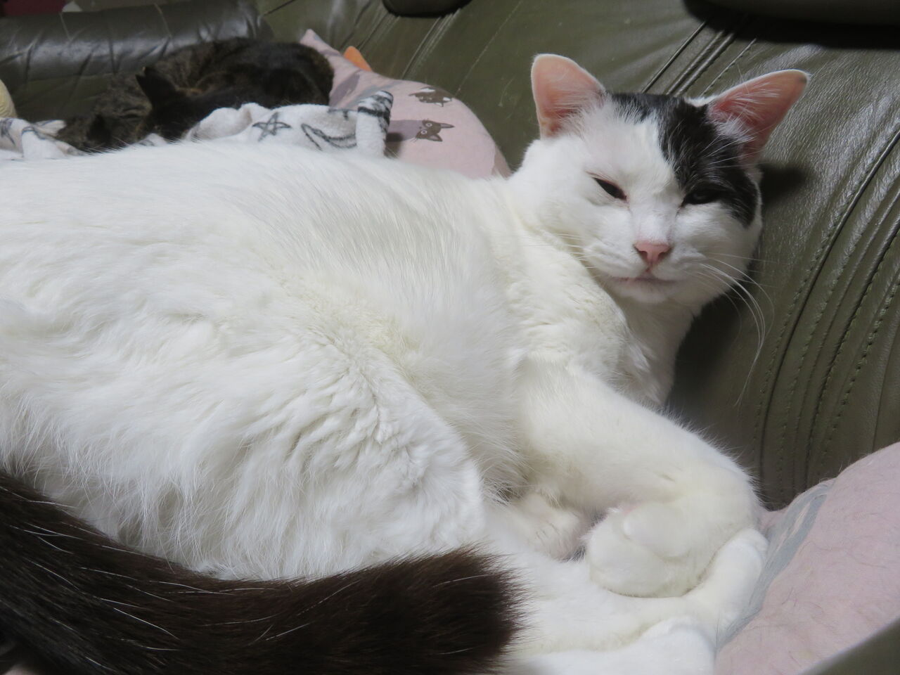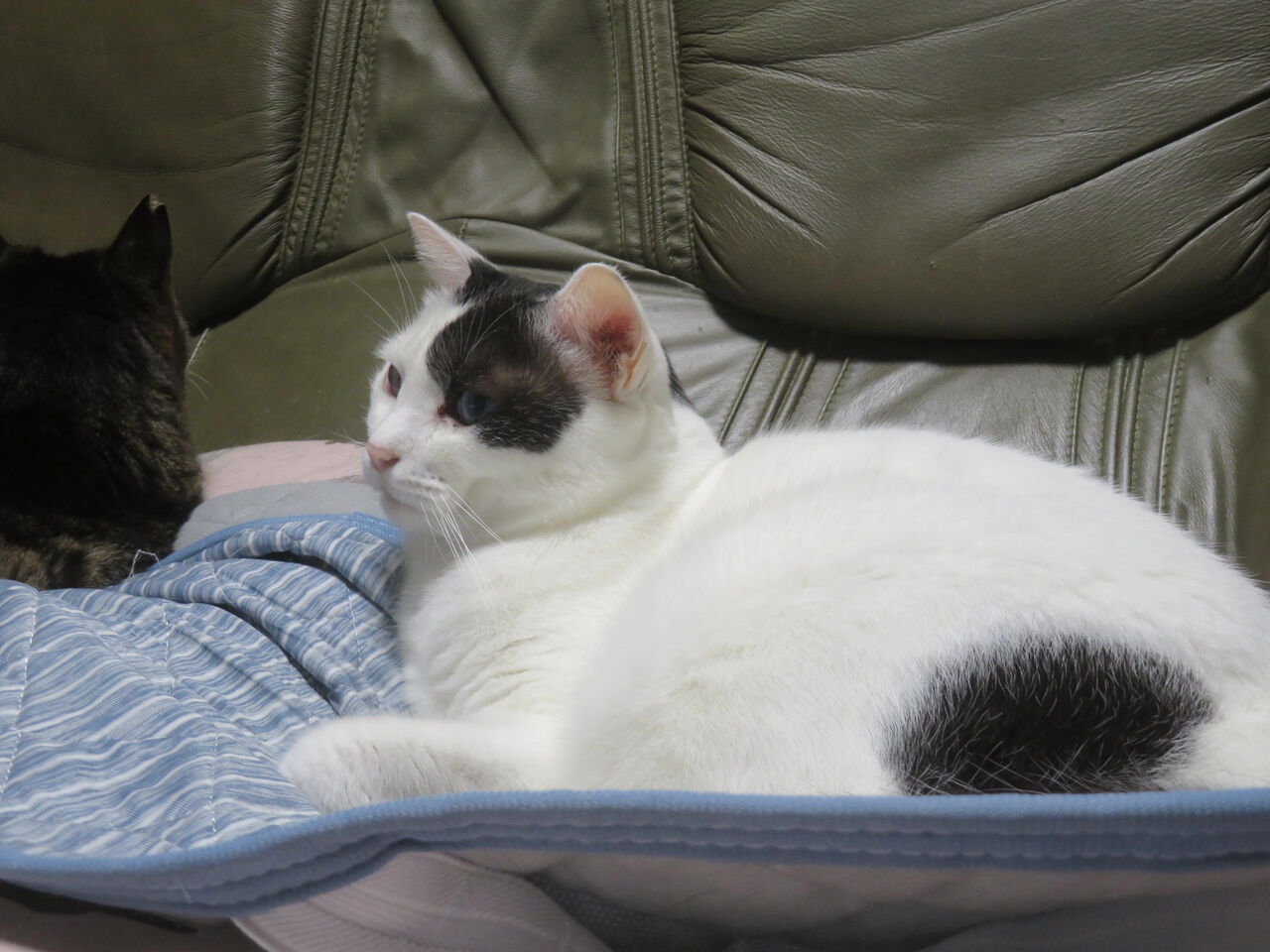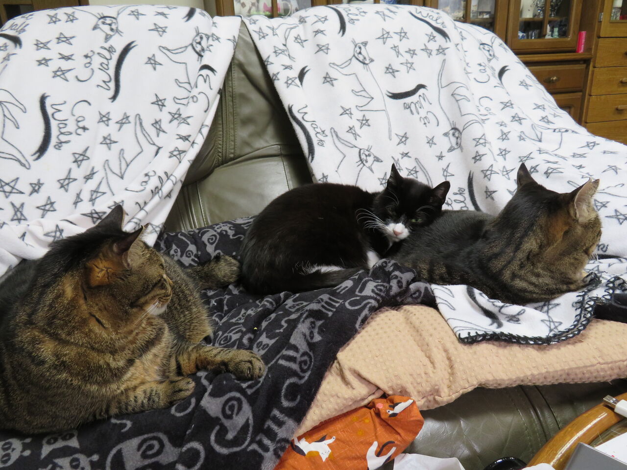 ”かい”もソファで寝たかったようですが、”なな&たく”の間に入れなくて居る”かい”を見て、「おいで」と声をかけると、膝の上に乗ってきました