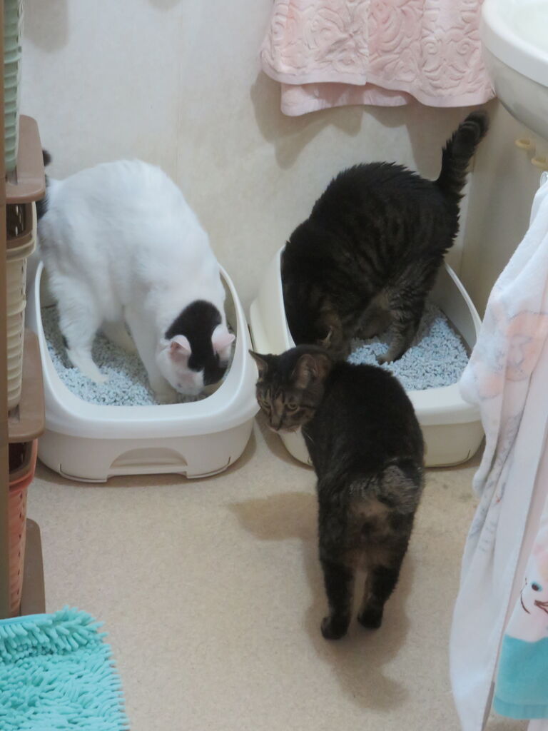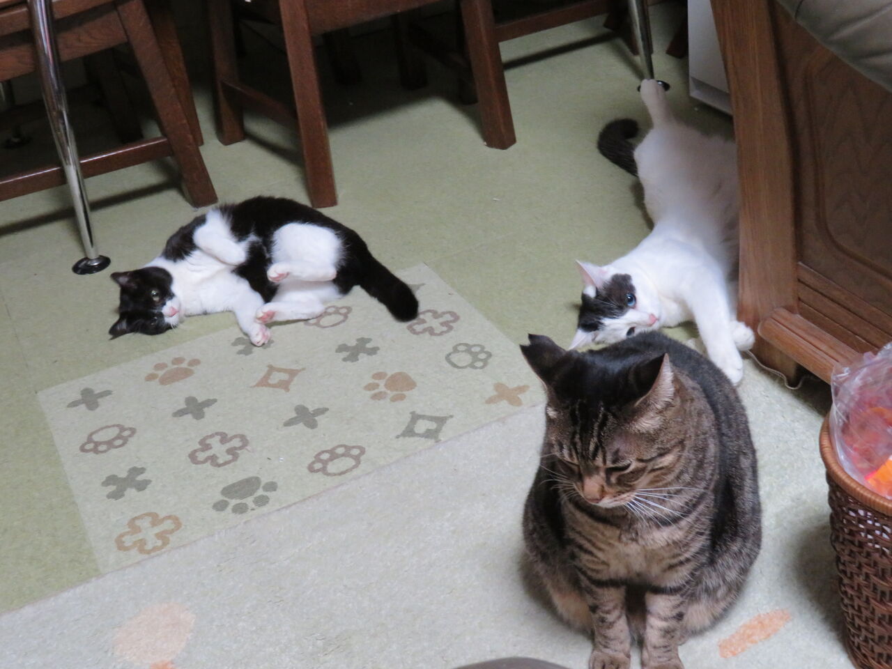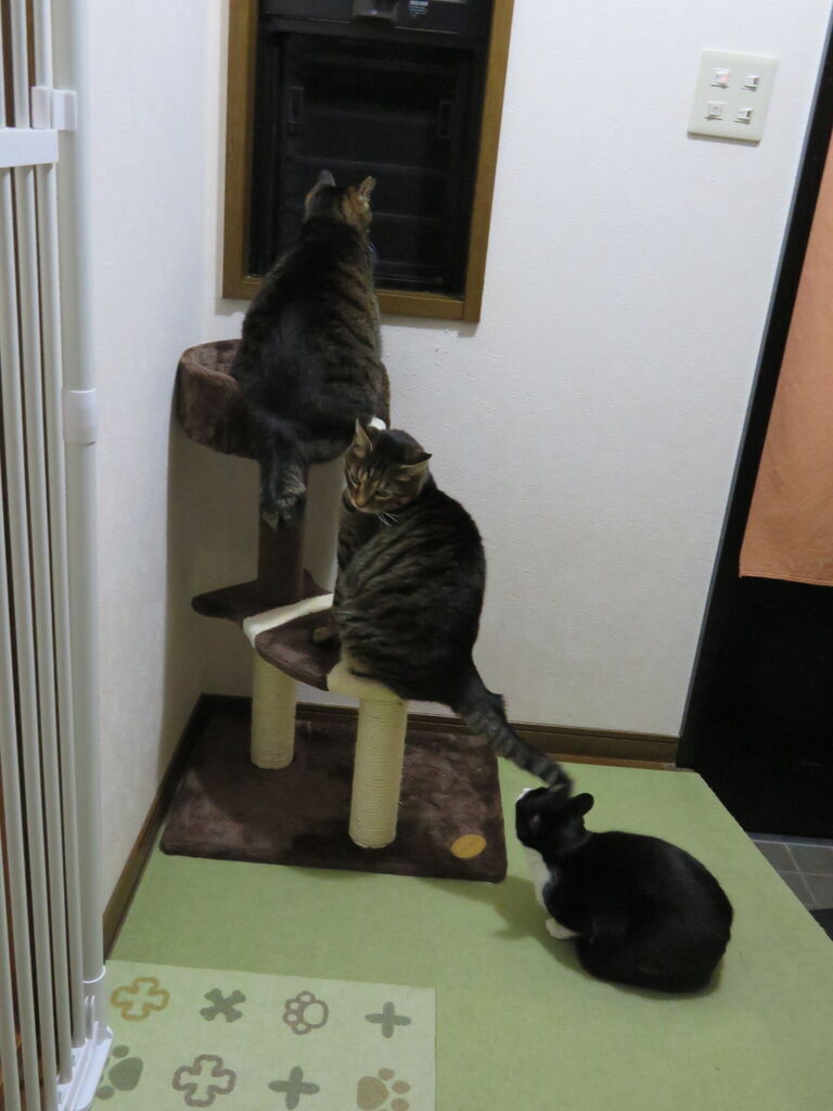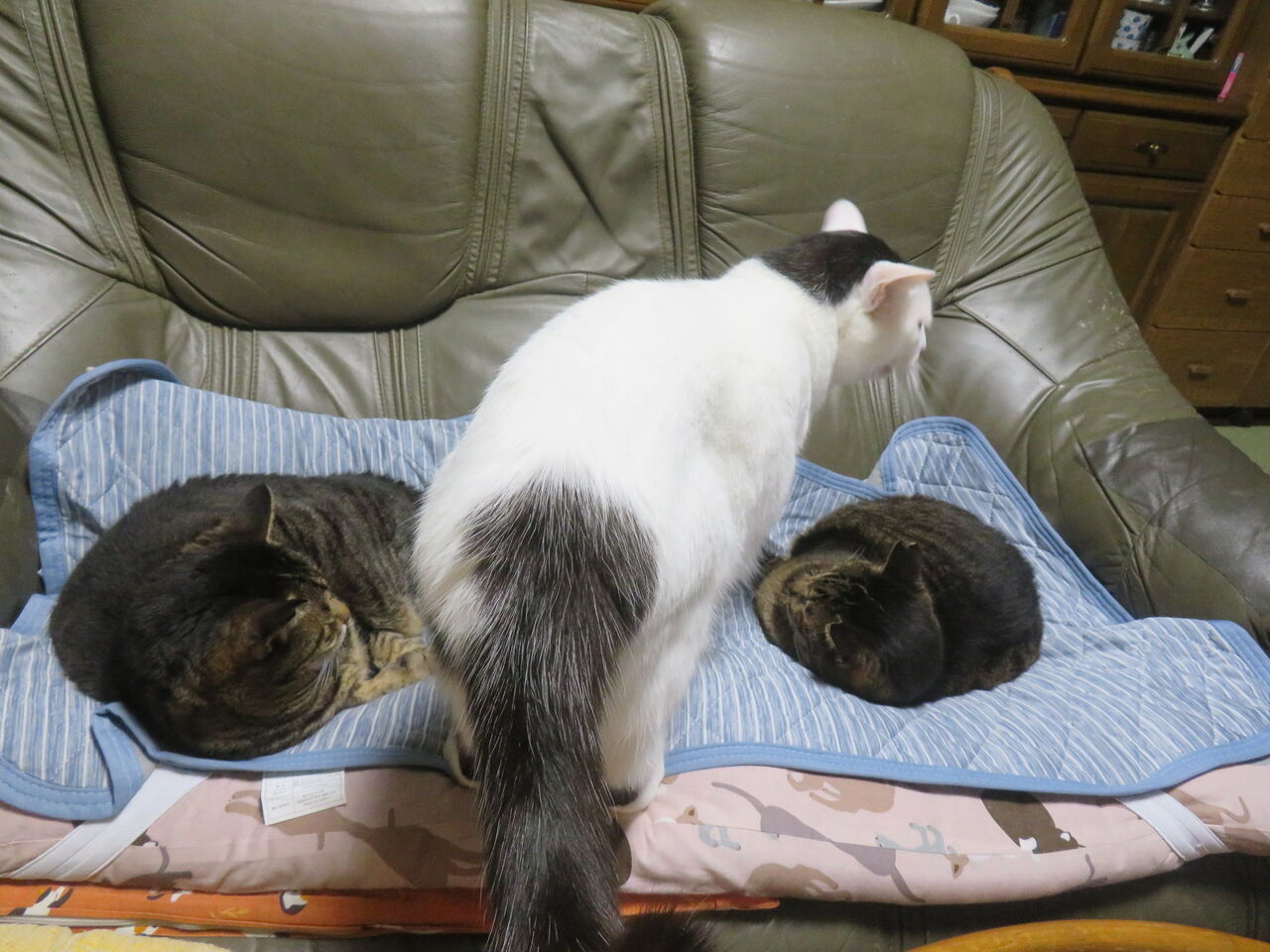 いつもの朝の光景ですが、後から思えば、この3ショットになる前、いつもと違かったのは、”うみ”がキューブベットから起きて来るのが遅かったのよね。