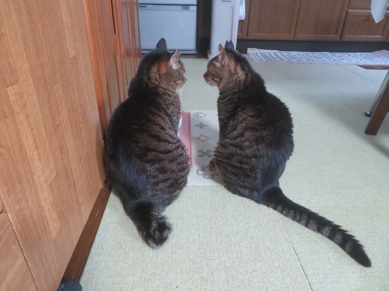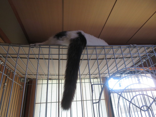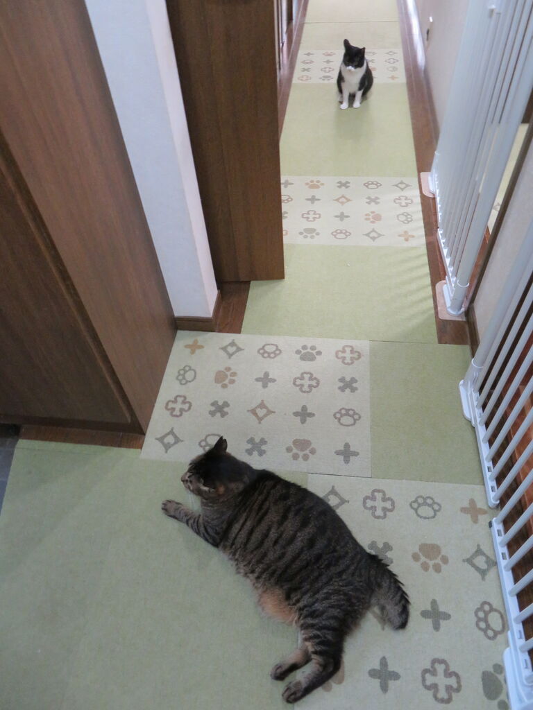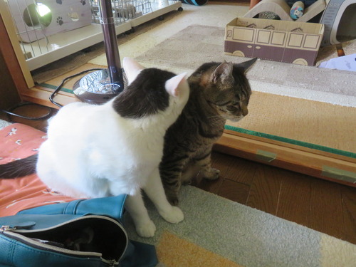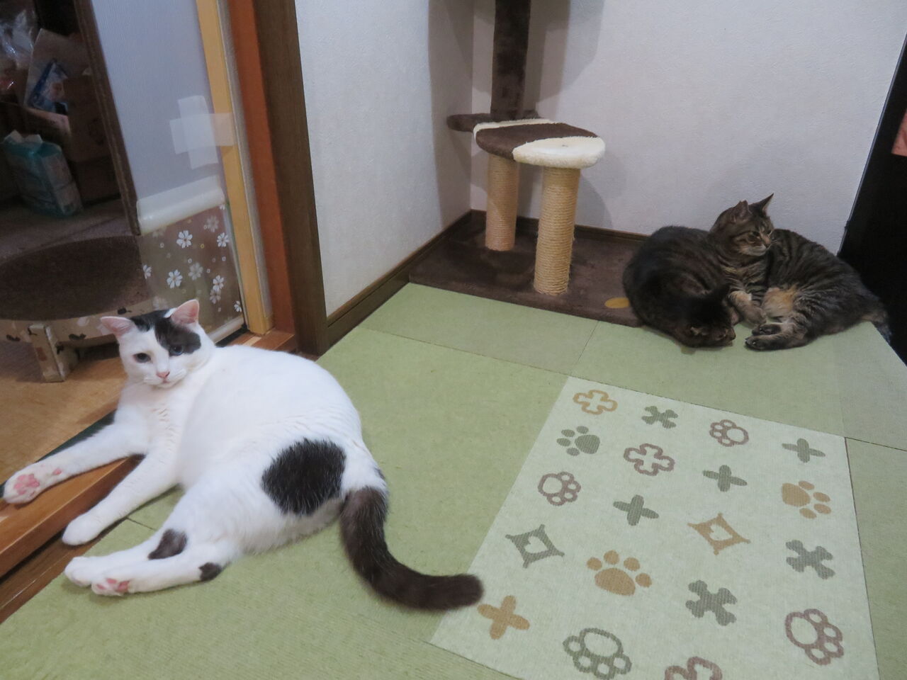 いつもの朝の光景ですが、後から思えば、この3ショットになる前、いつもと違かったのは、”うみ”がキューブベットから起きて来るのが遅かったのよね。