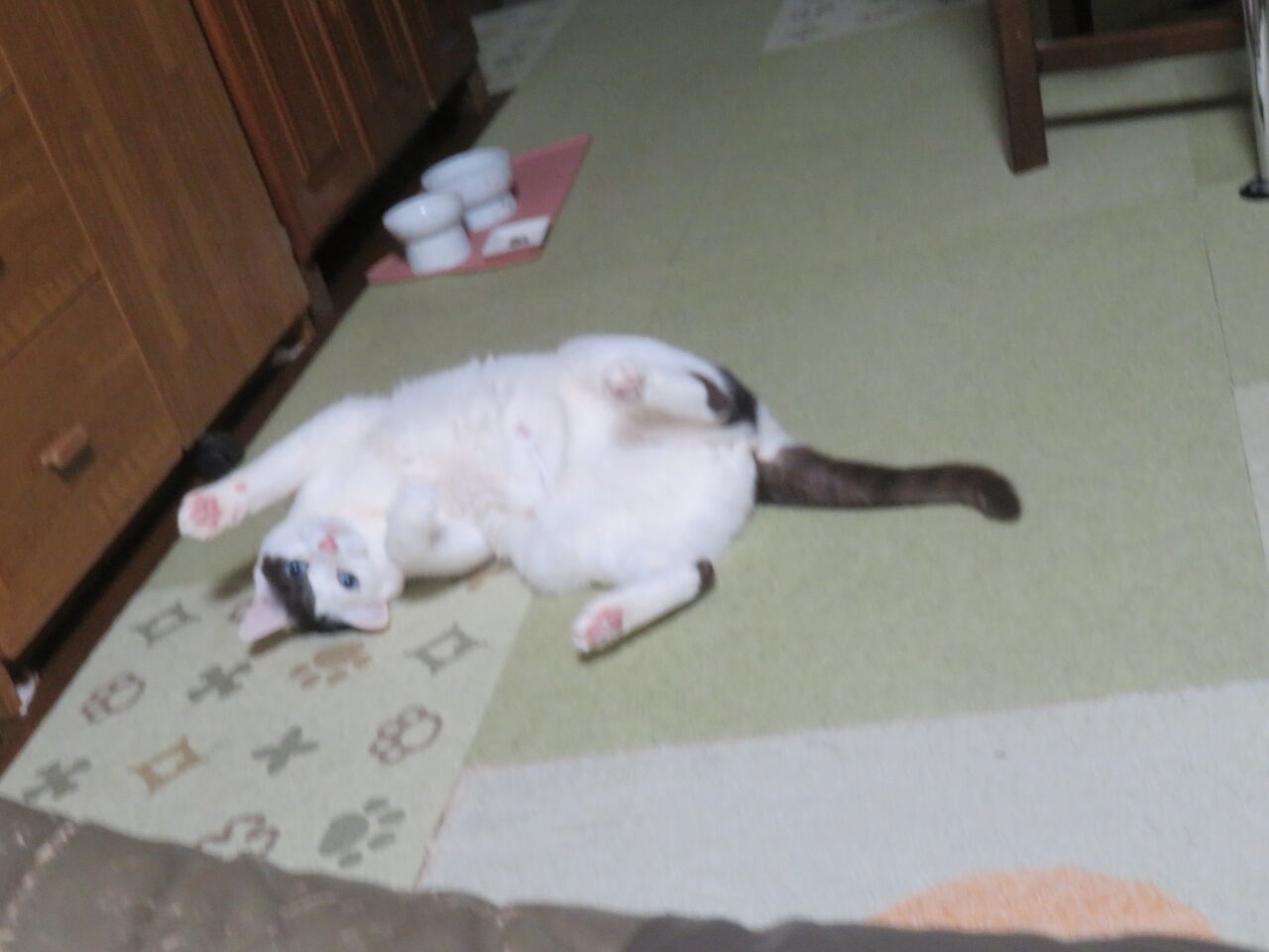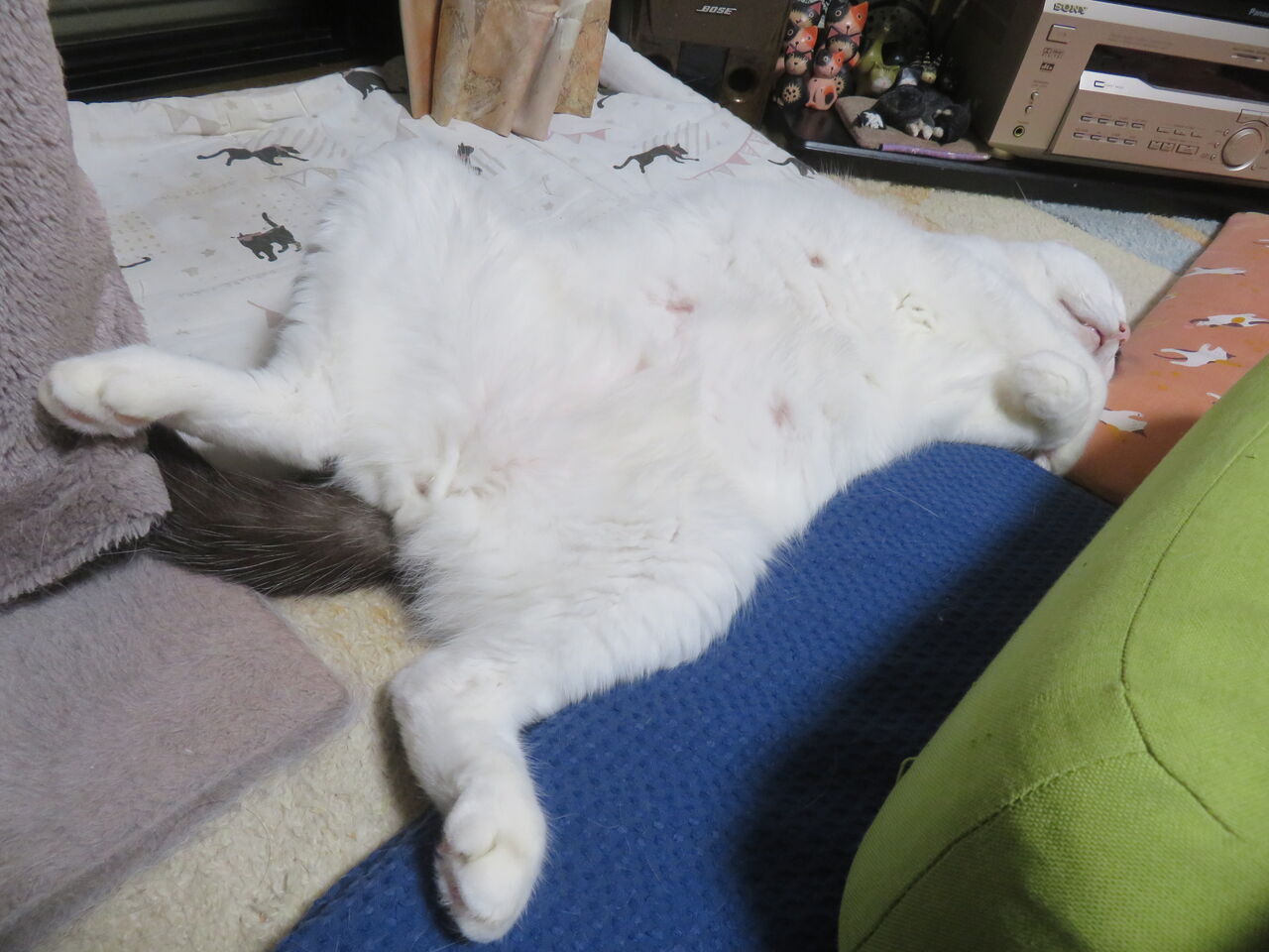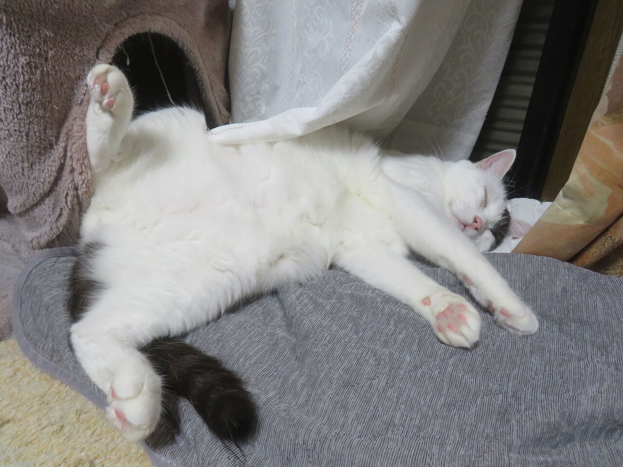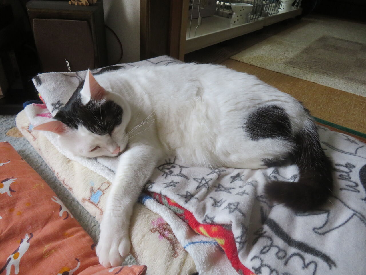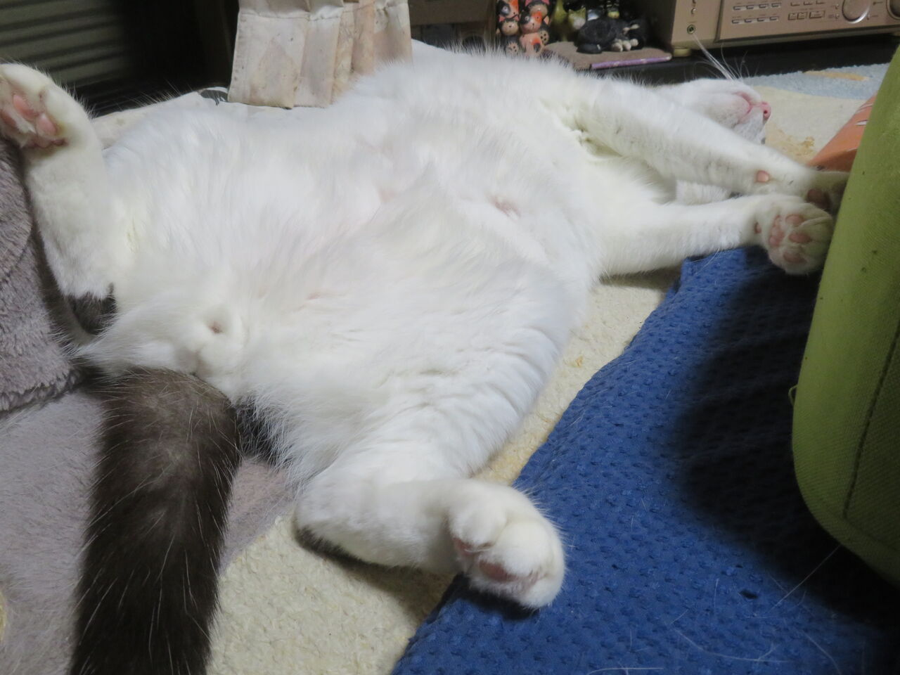 お母ちゃんの毛布の上でへそ天寝の”かい”
