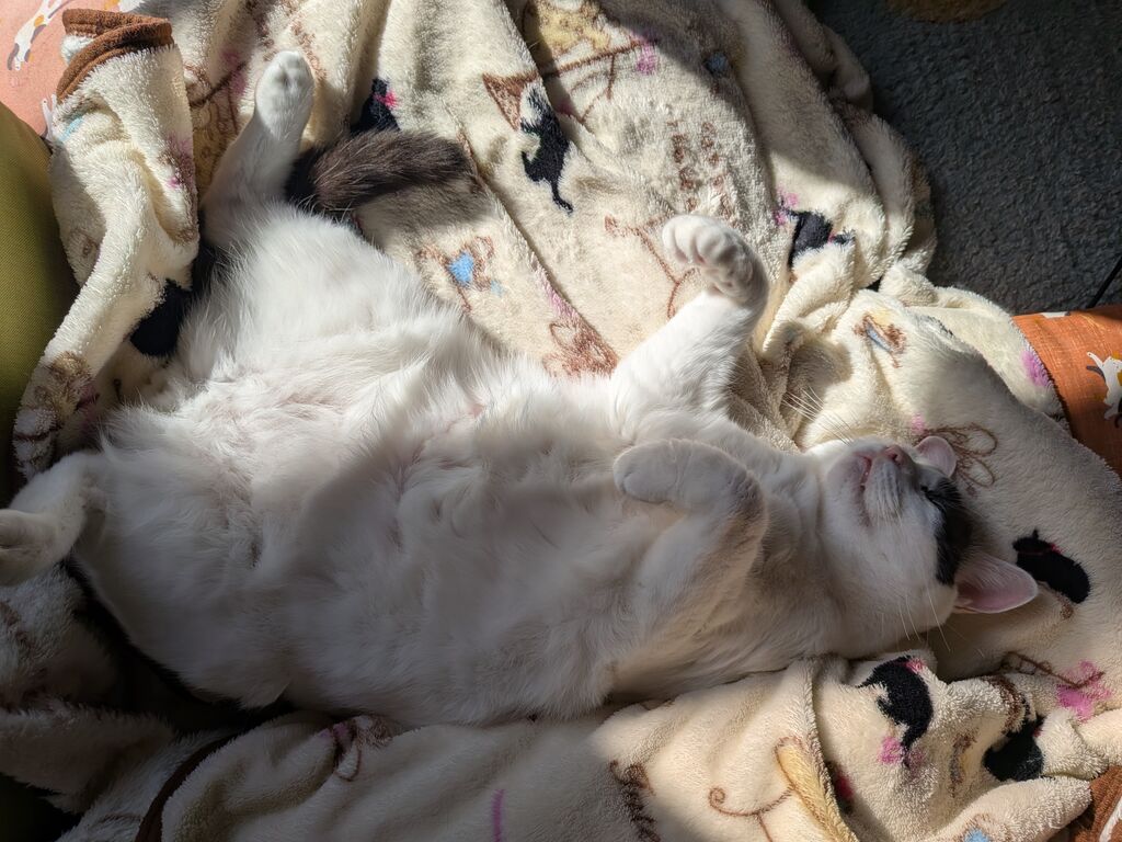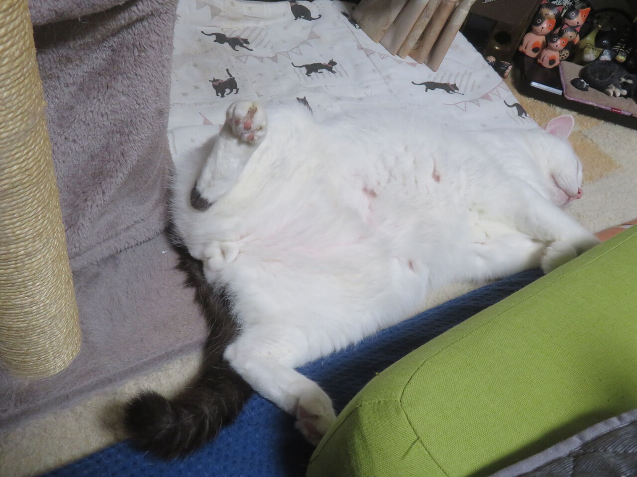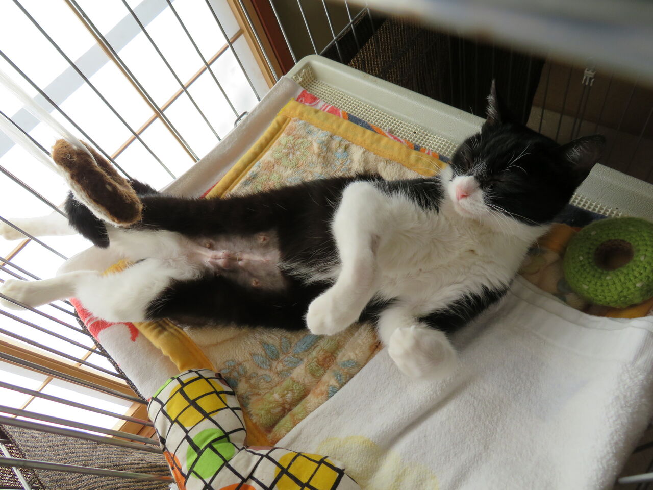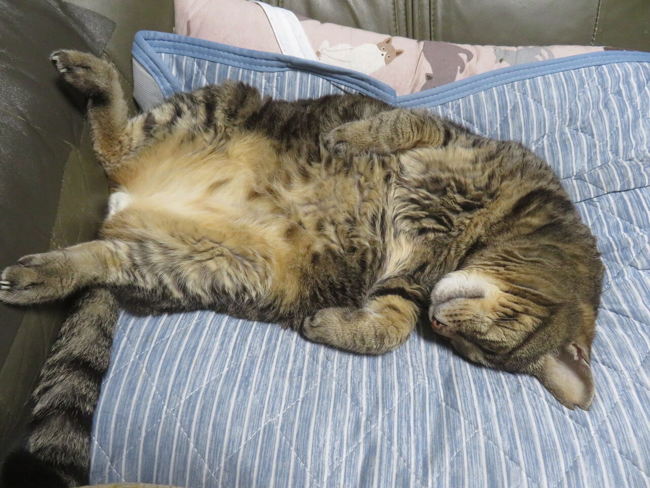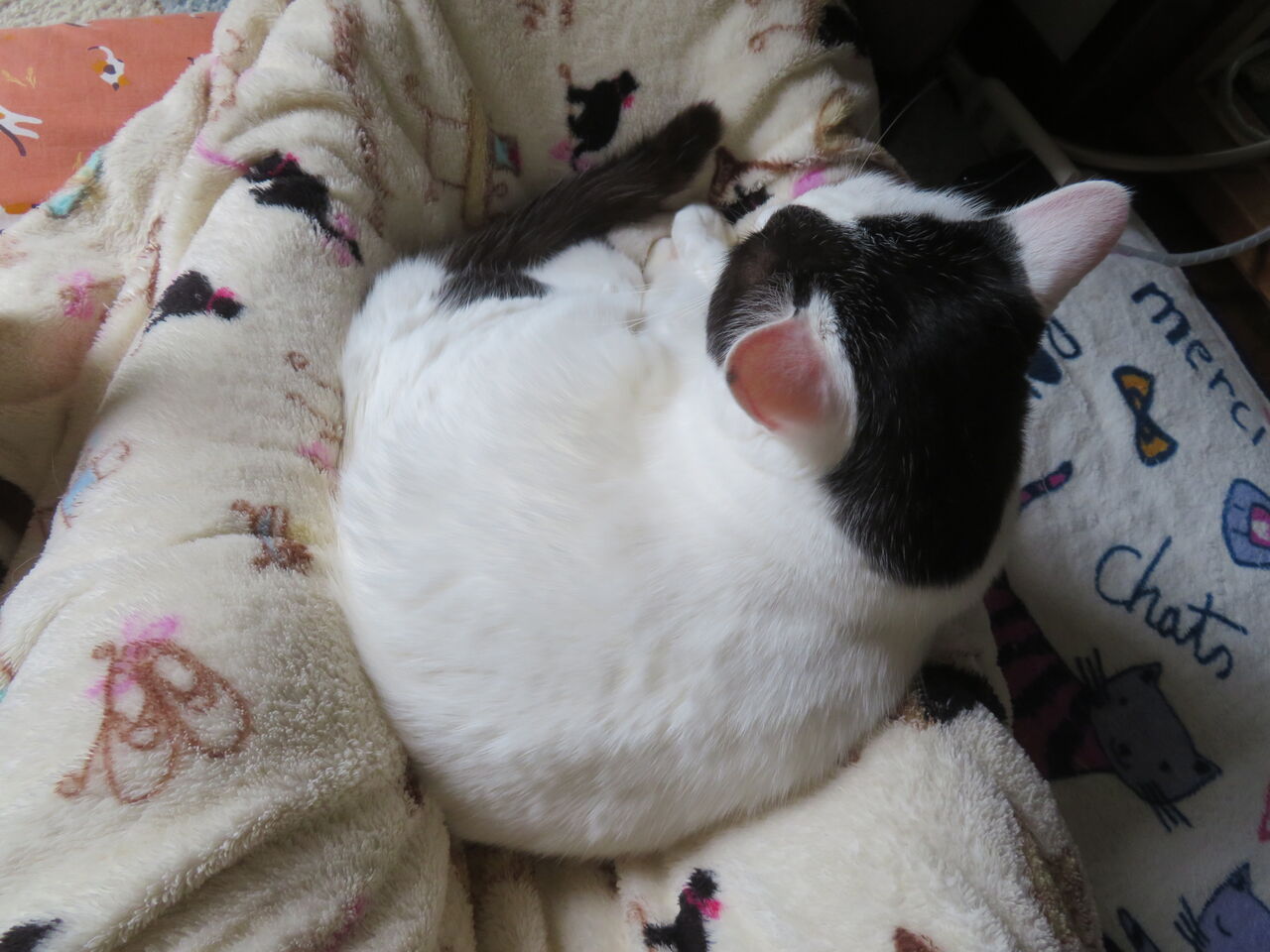 お母ちゃんの毛布の上でへそ天寝の”かい”