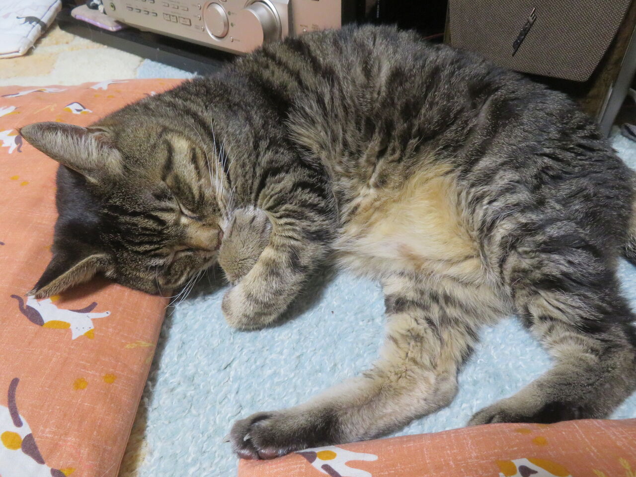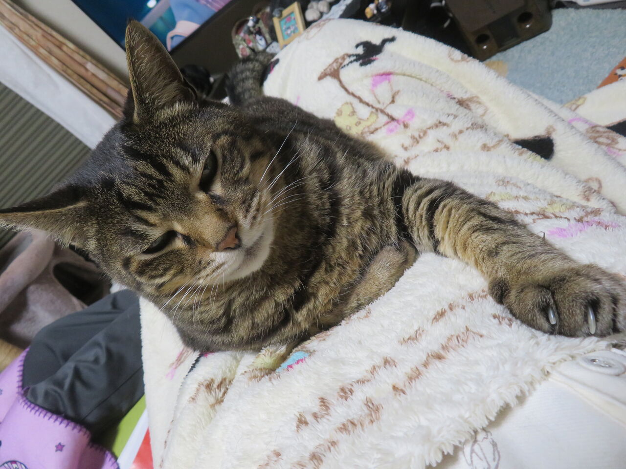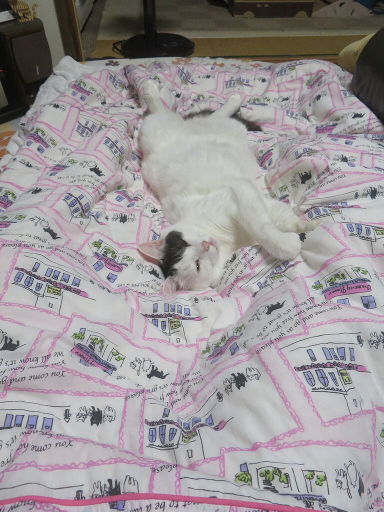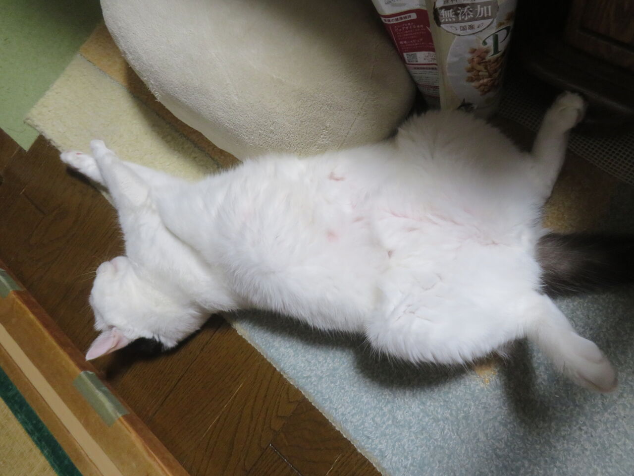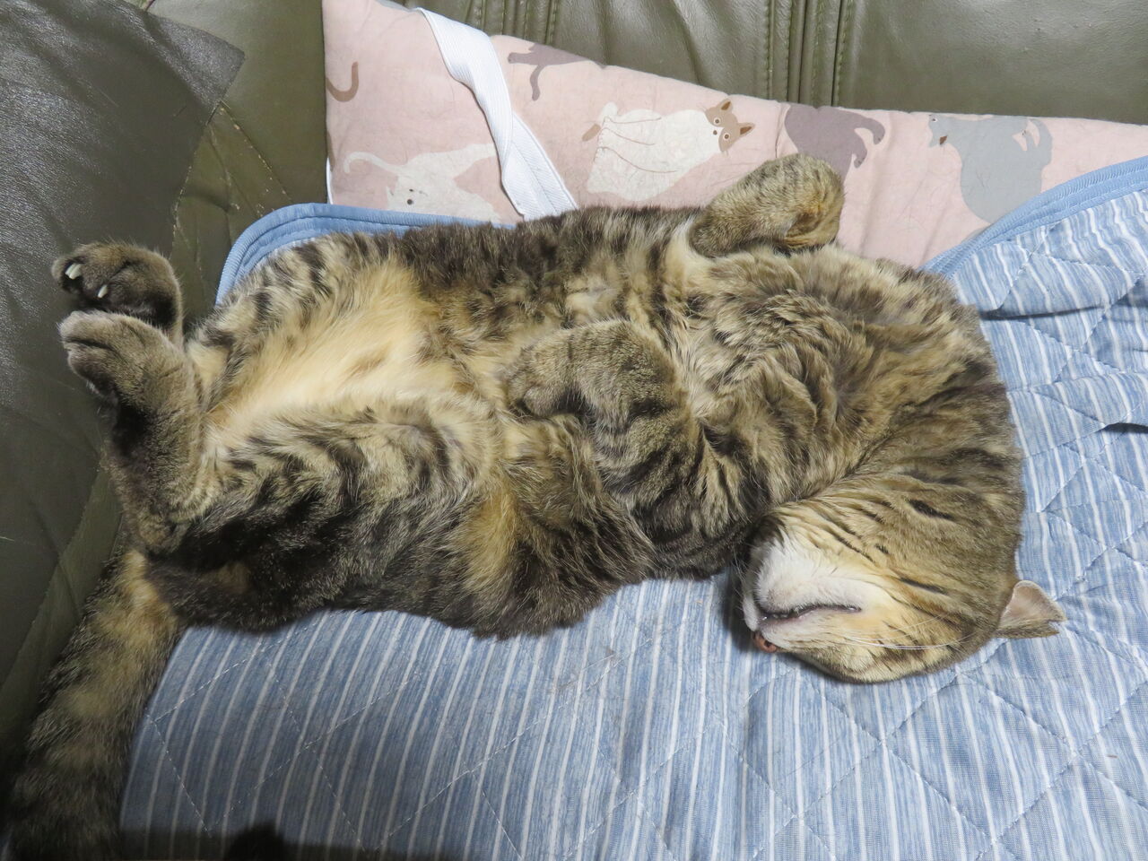 お母ちゃんの毛布の上でへそ天寝の”かい”