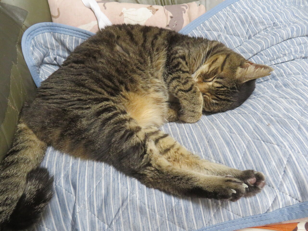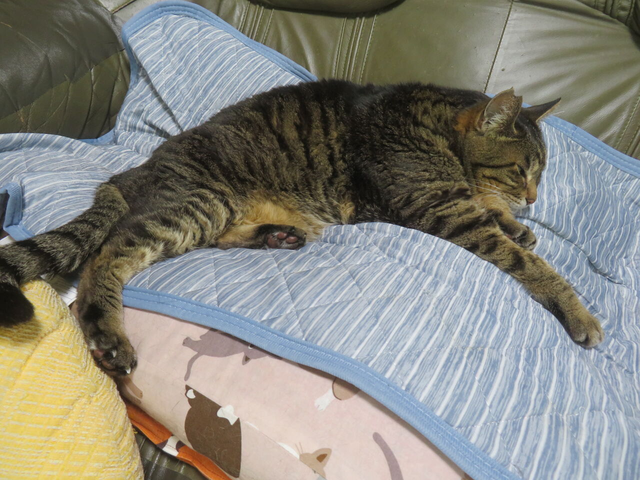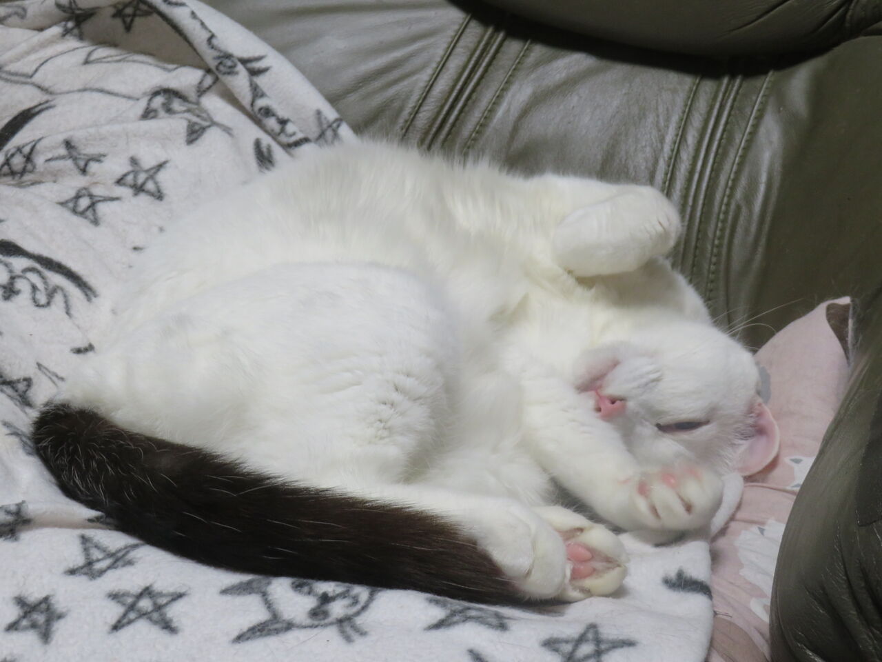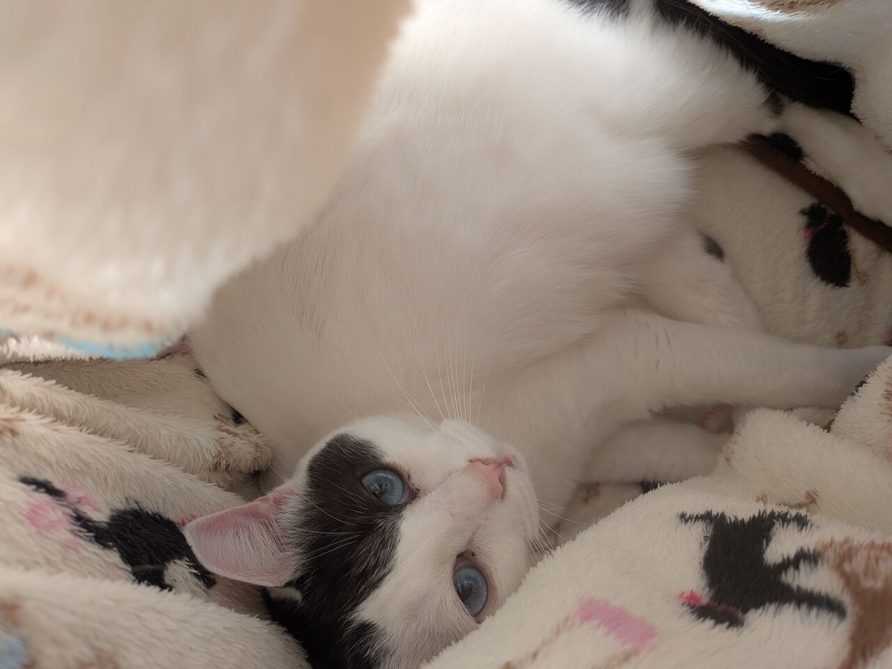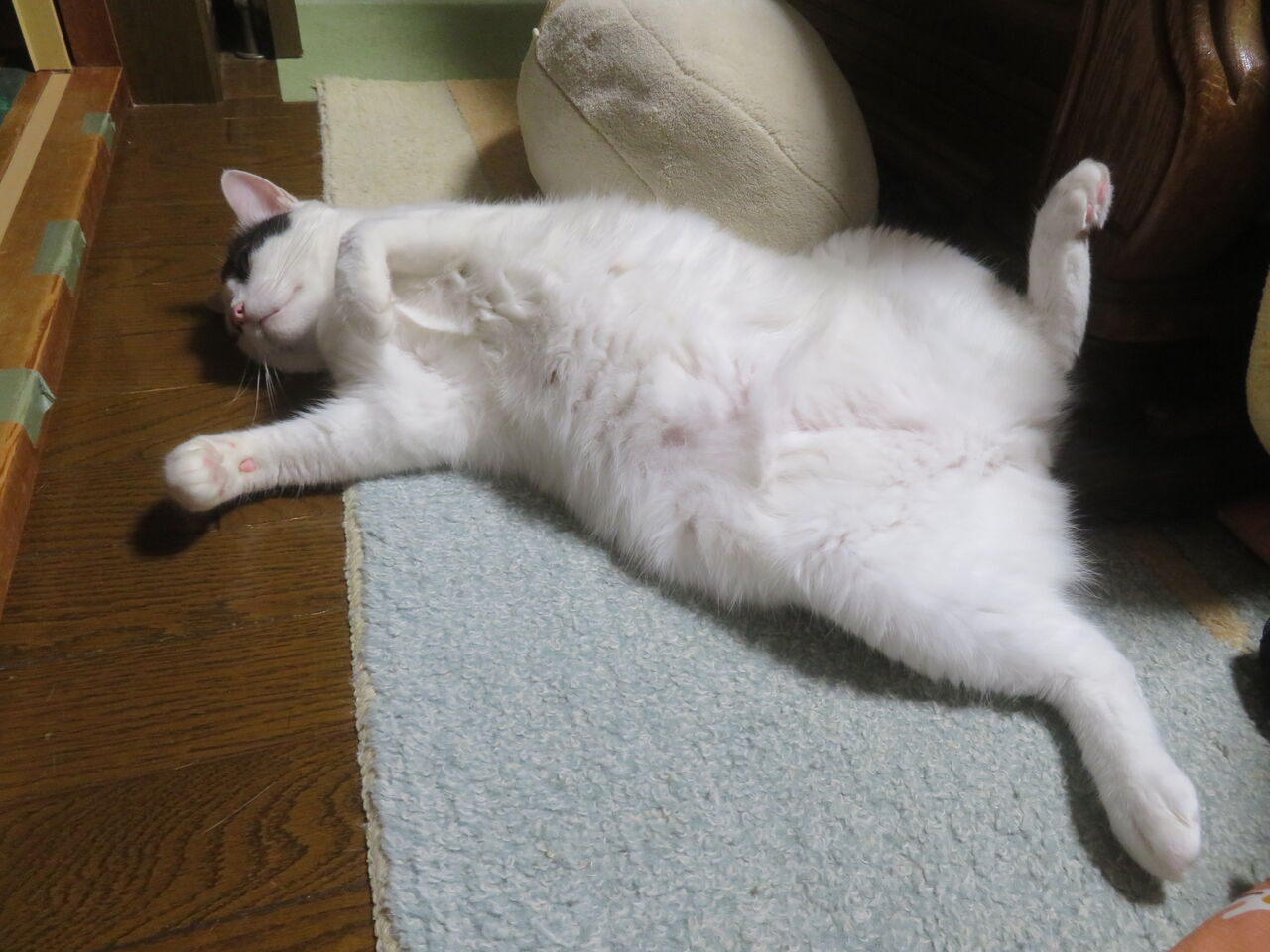 お母ちゃんの毛布の上でへそ天寝の”かい”