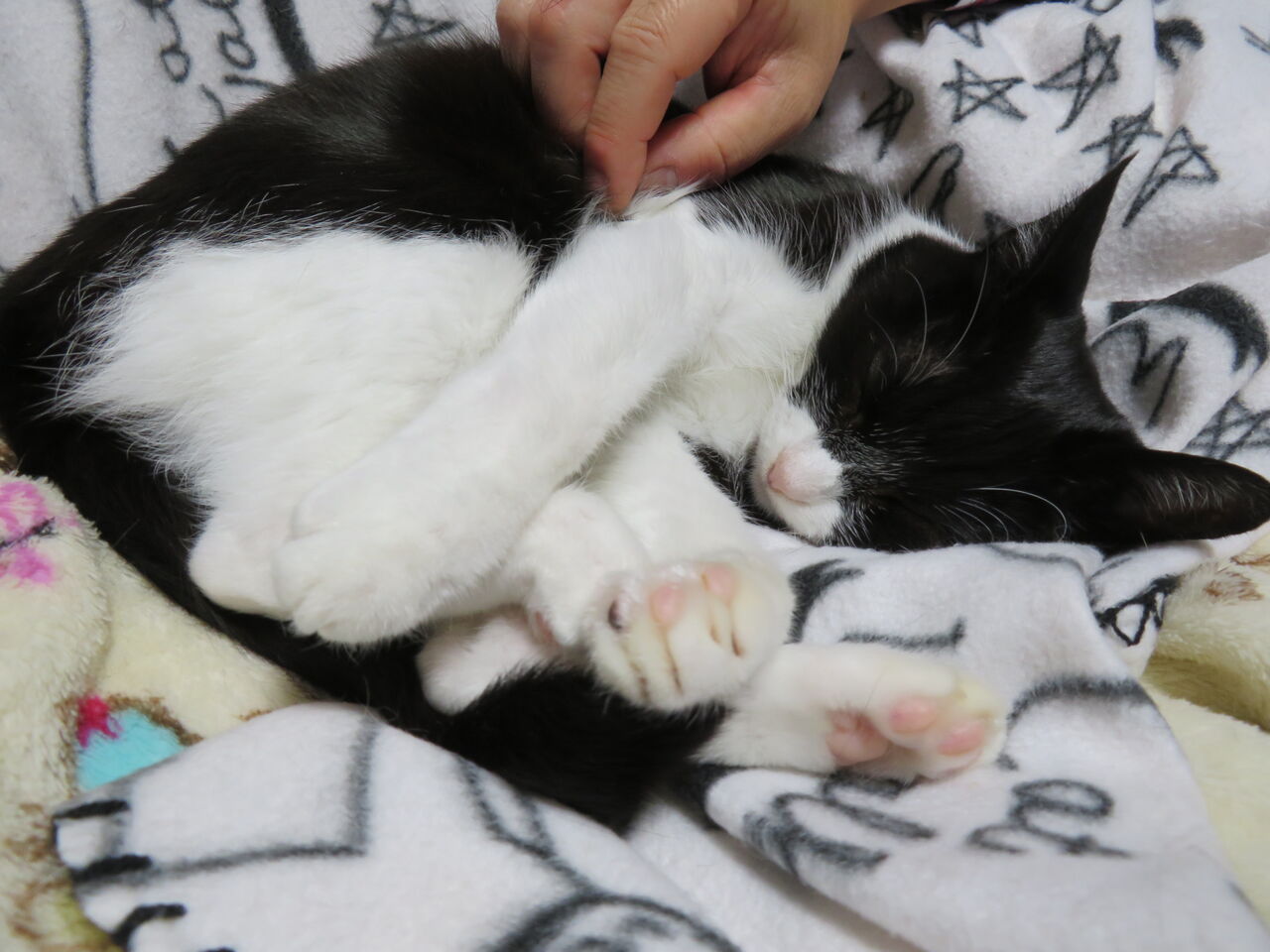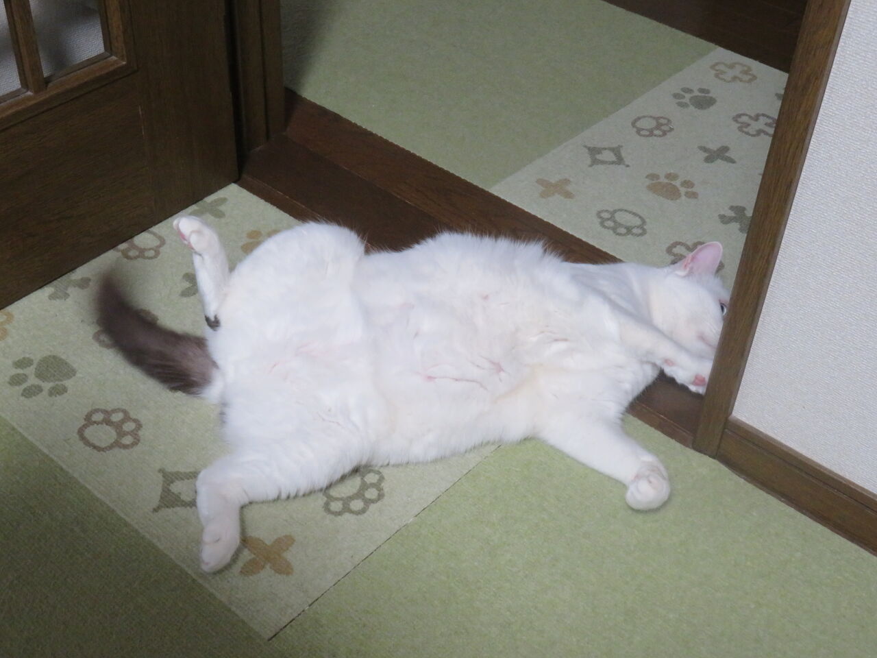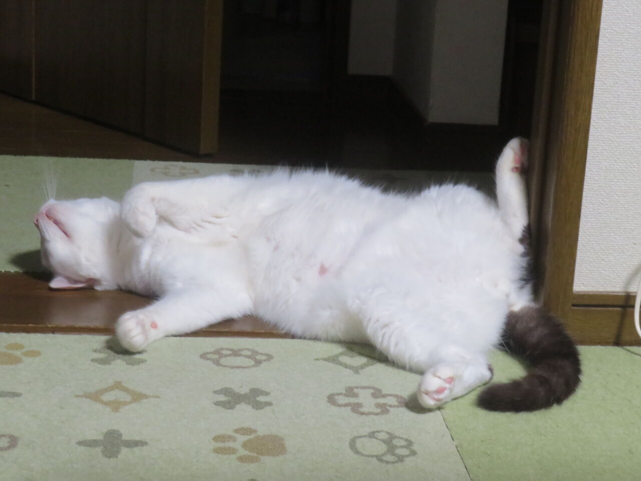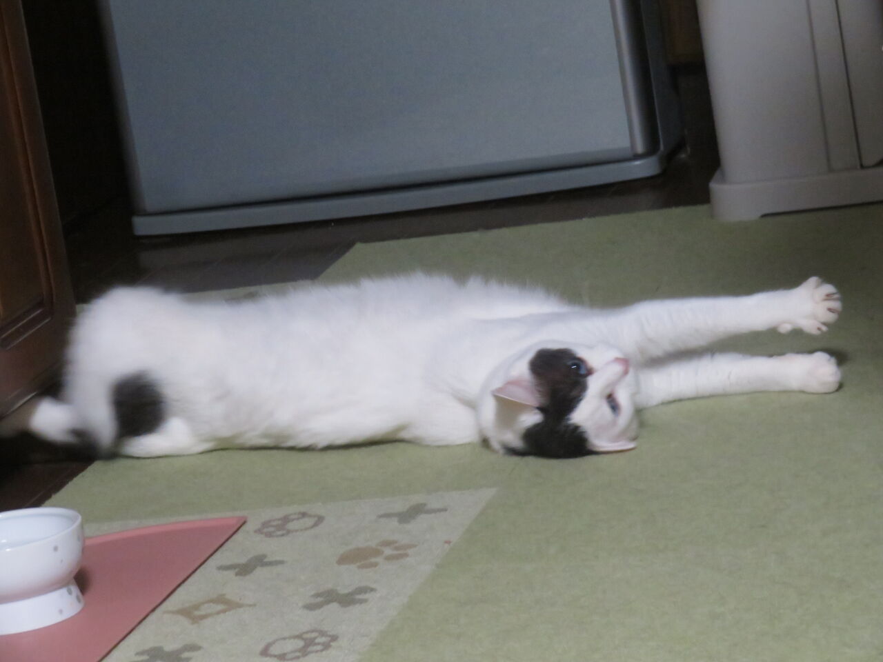 お母ちゃんの毛布の上でへそ天寝の”かい”