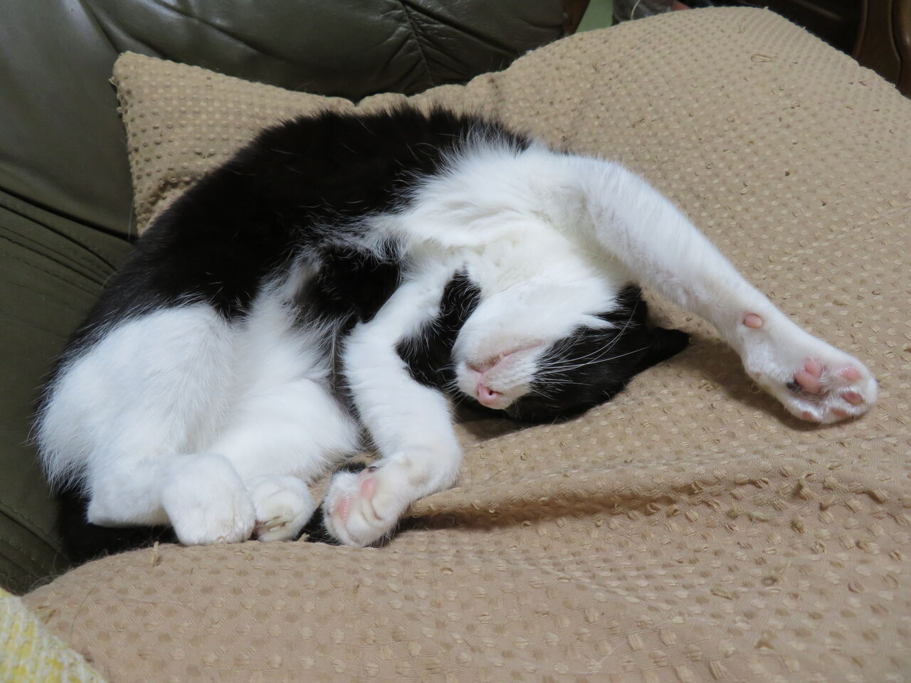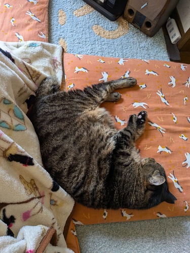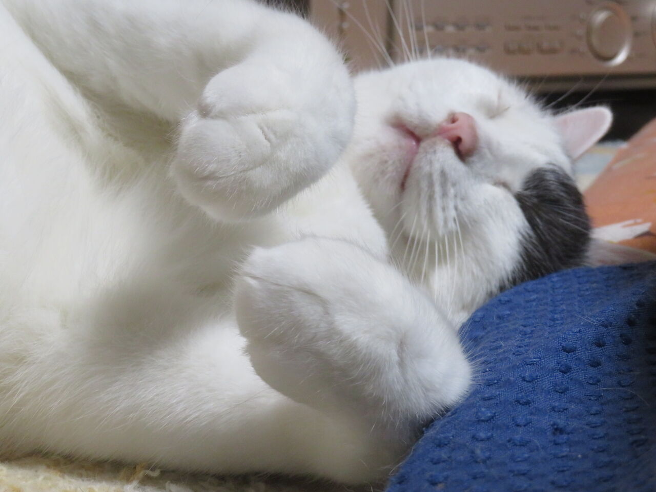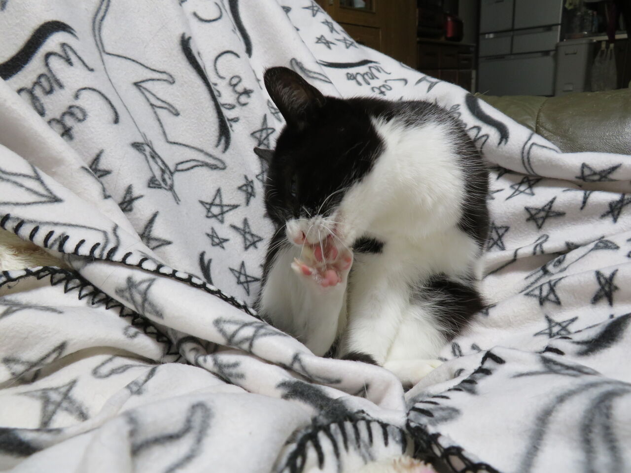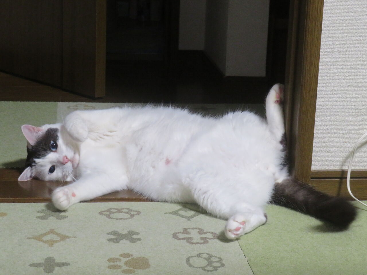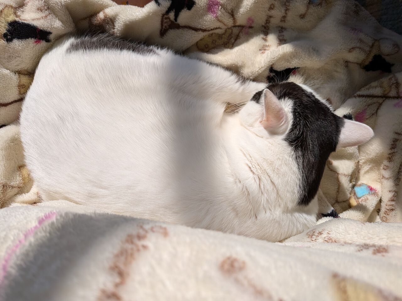 お母ちゃんの毛布の上でへそ天寝の”かい”