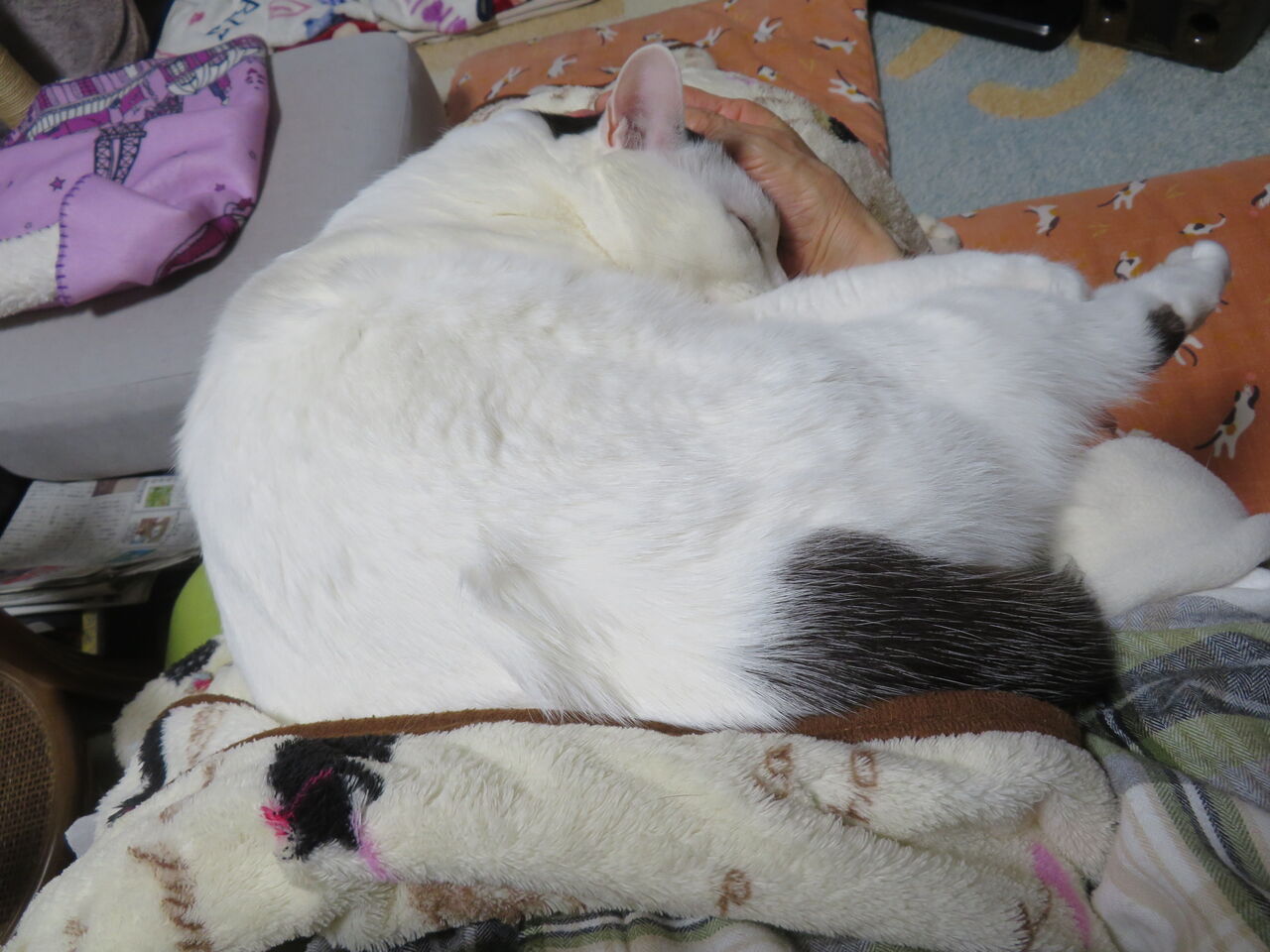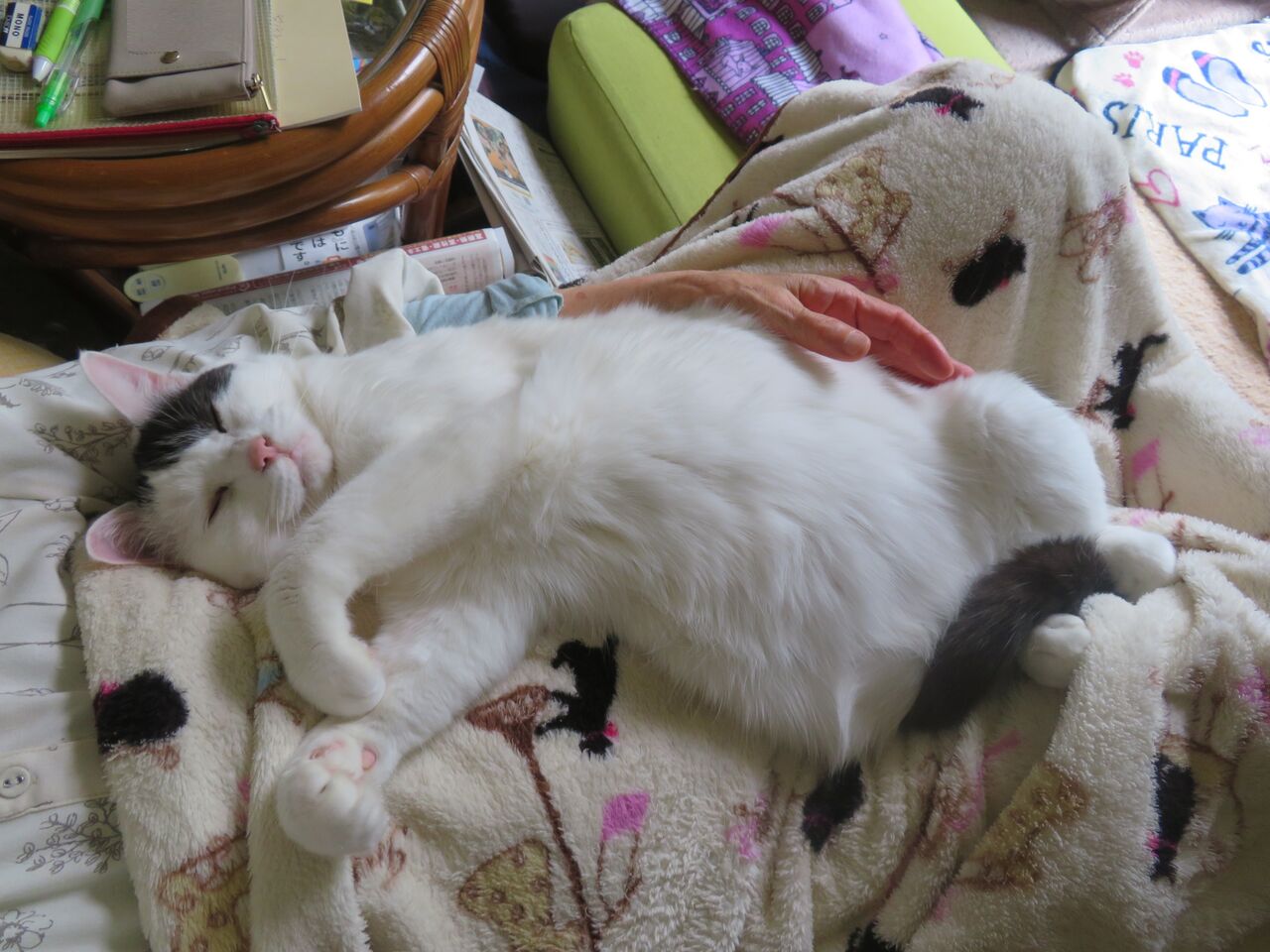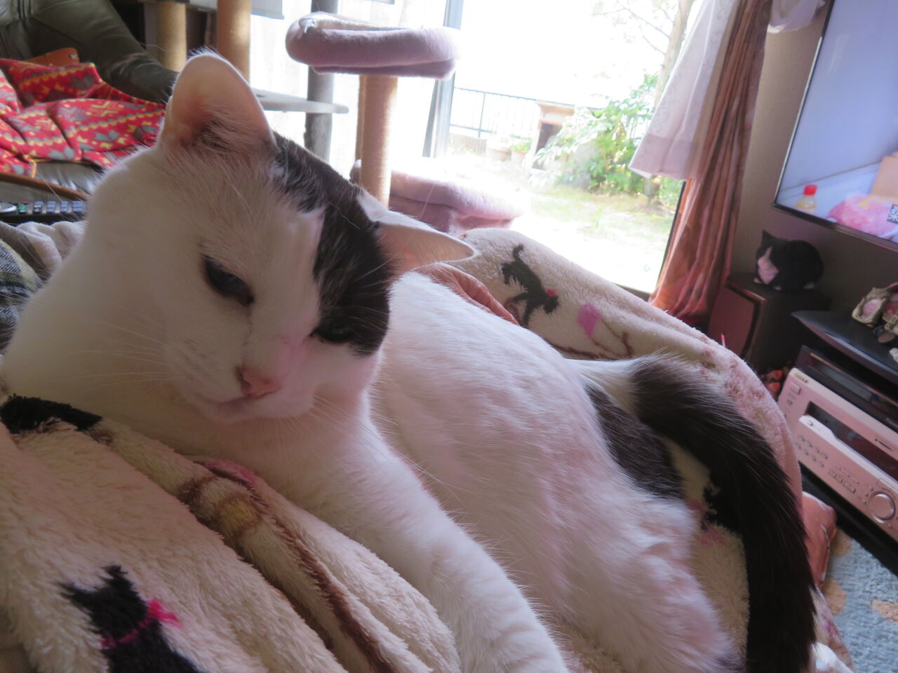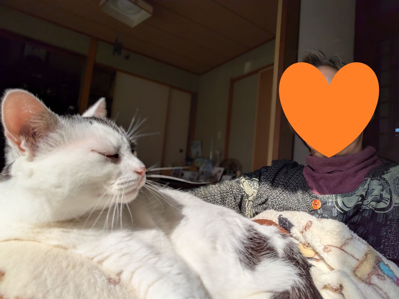 午後、お母ちゃんが毛布をかけて脱力していると、”うみ”自らお母ちゃんの足の間に
