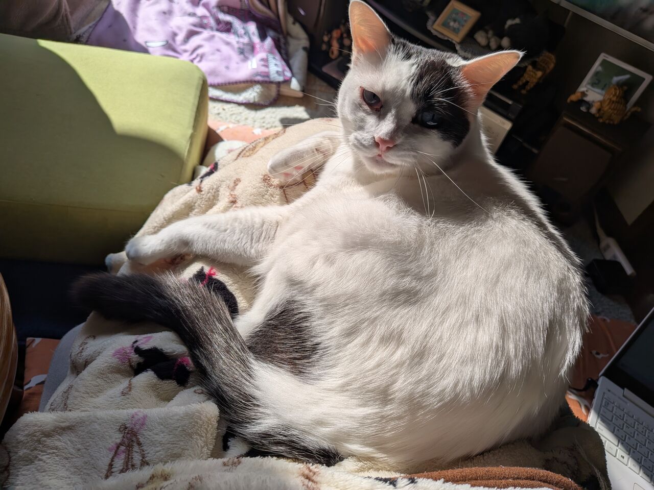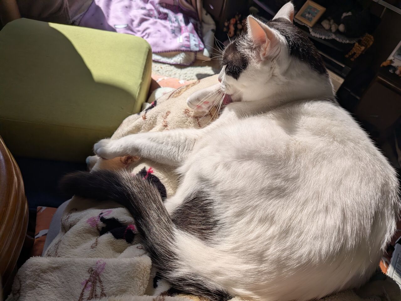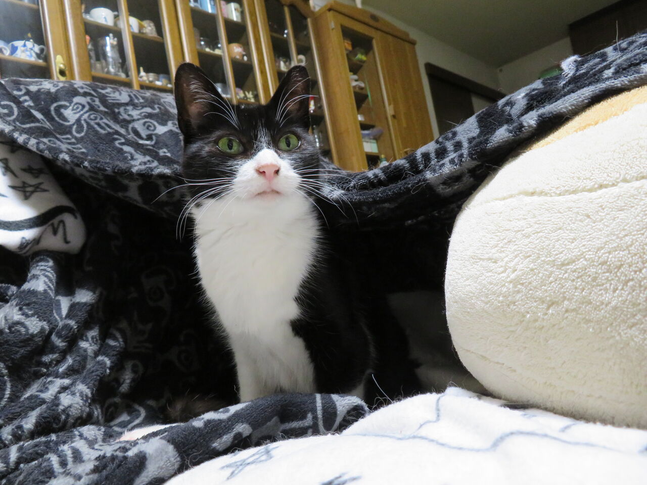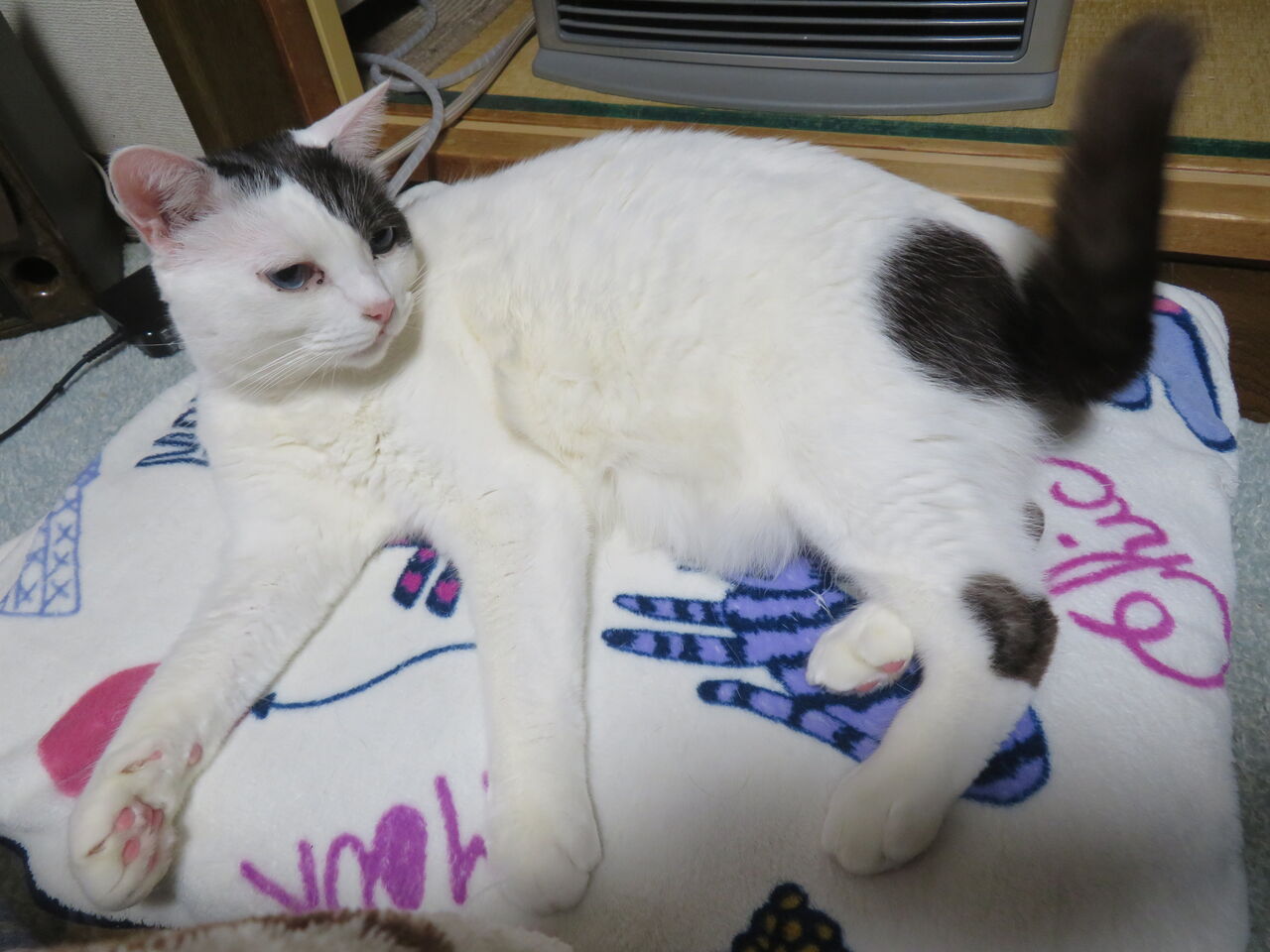 午後、お母ちゃんが毛布をかけて脱力していると、”うみ”自らお母ちゃんの足の間に