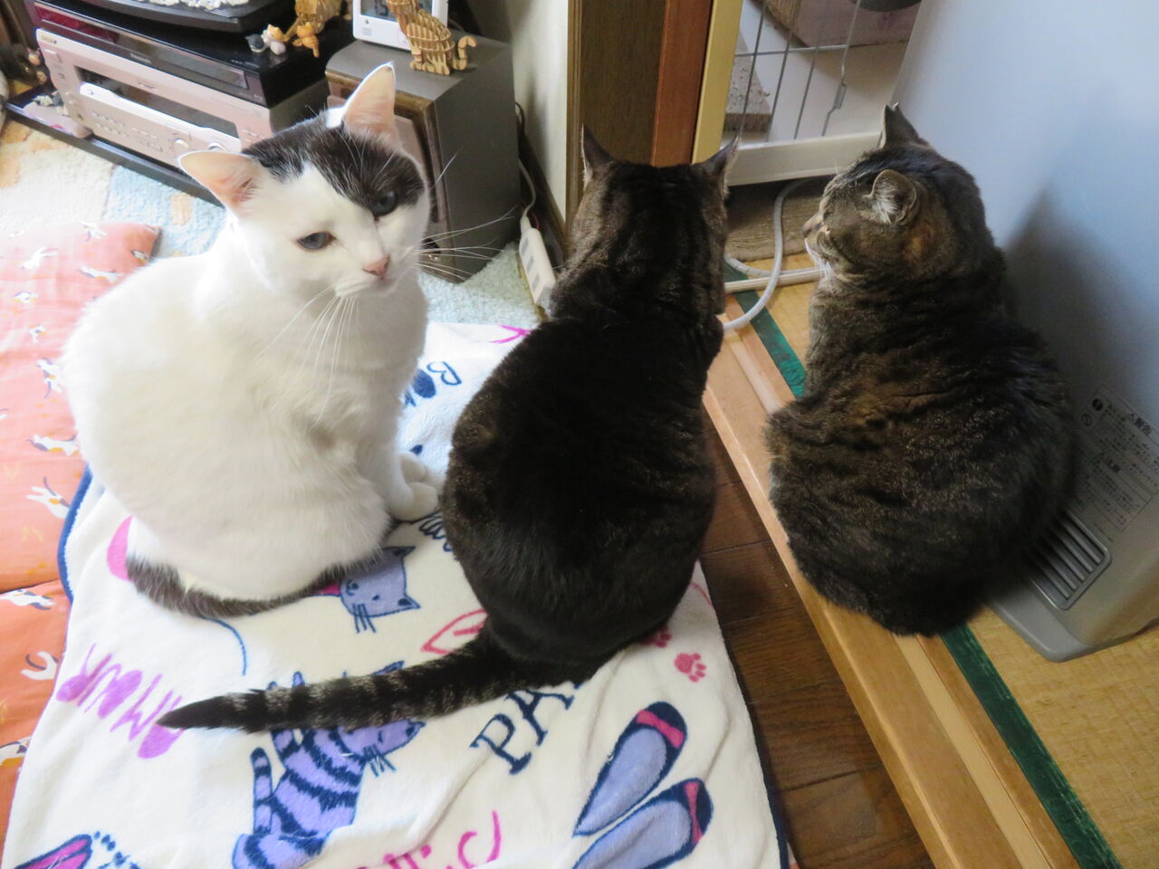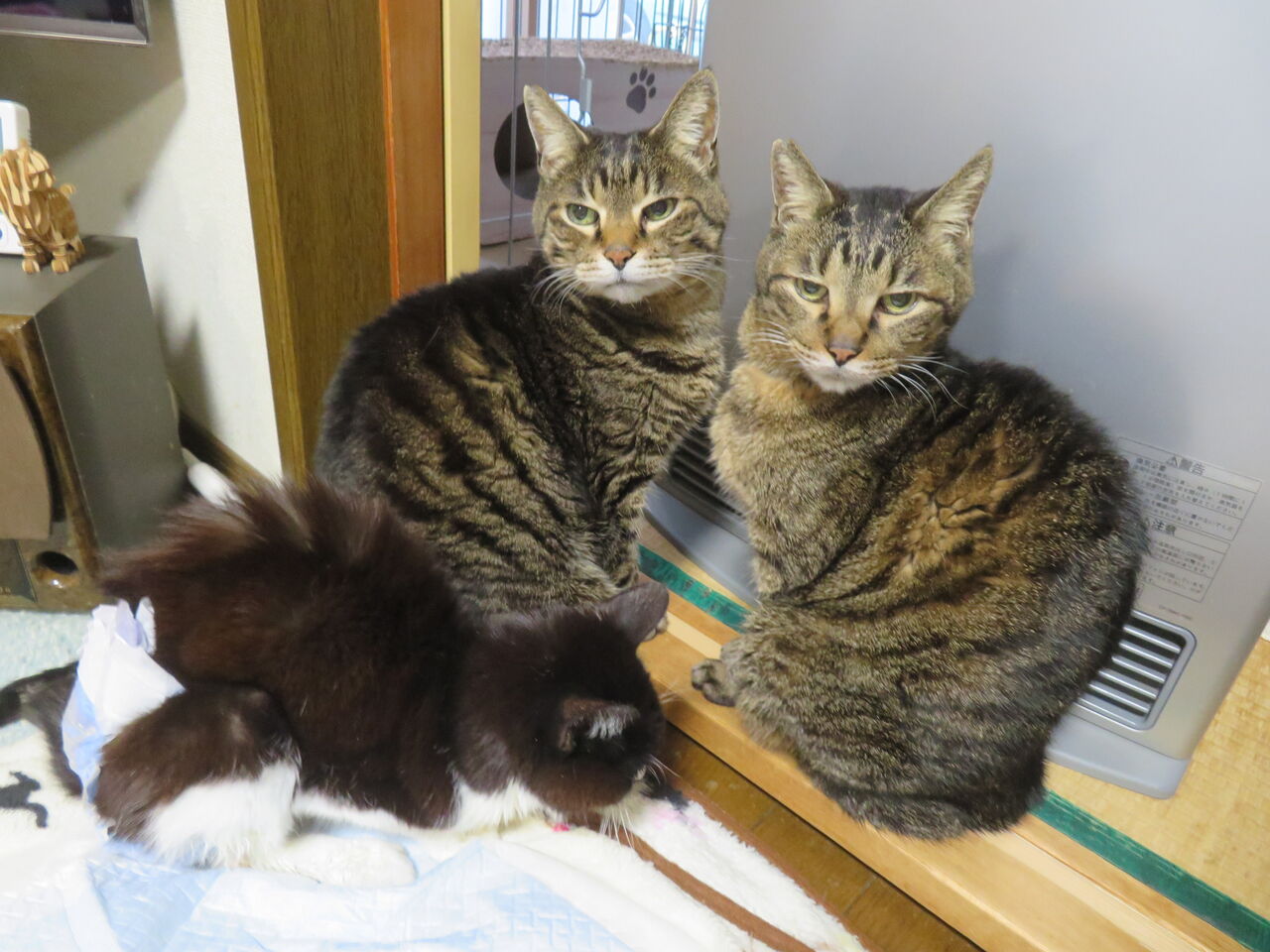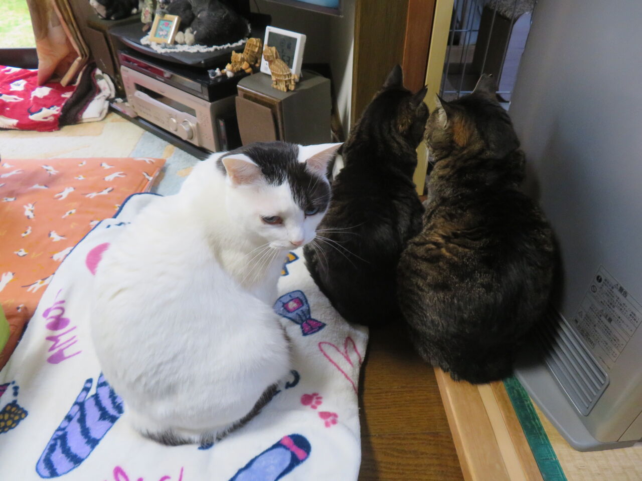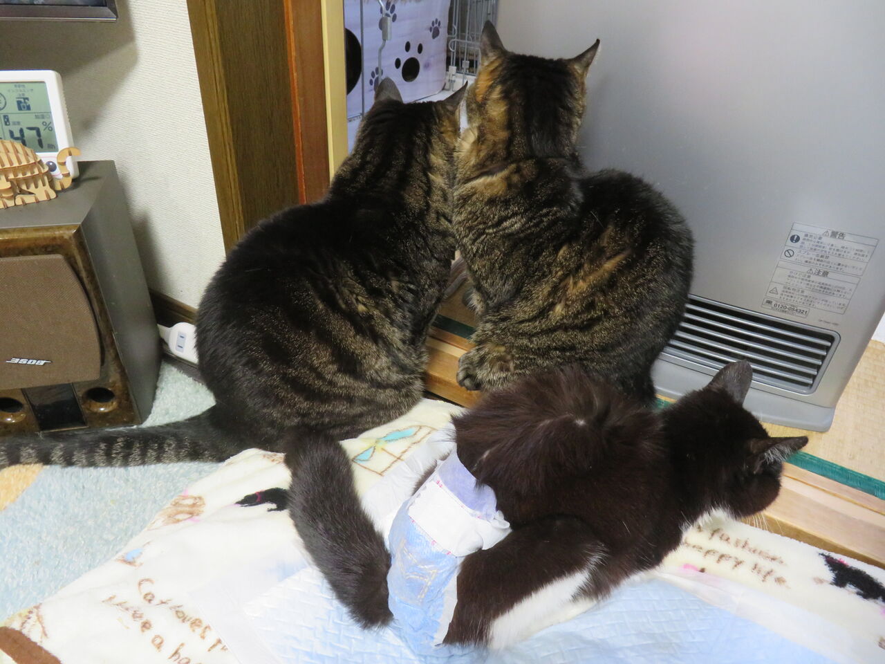 この日の朝も、ストーブ前に、左奥”ななみ”、右奥”たくみ”、手前に”うみ”がチンマリ。
