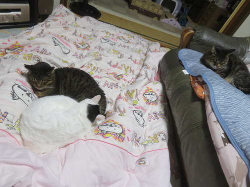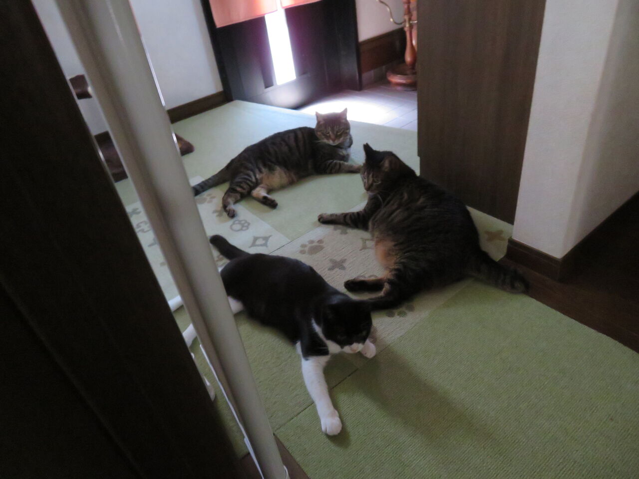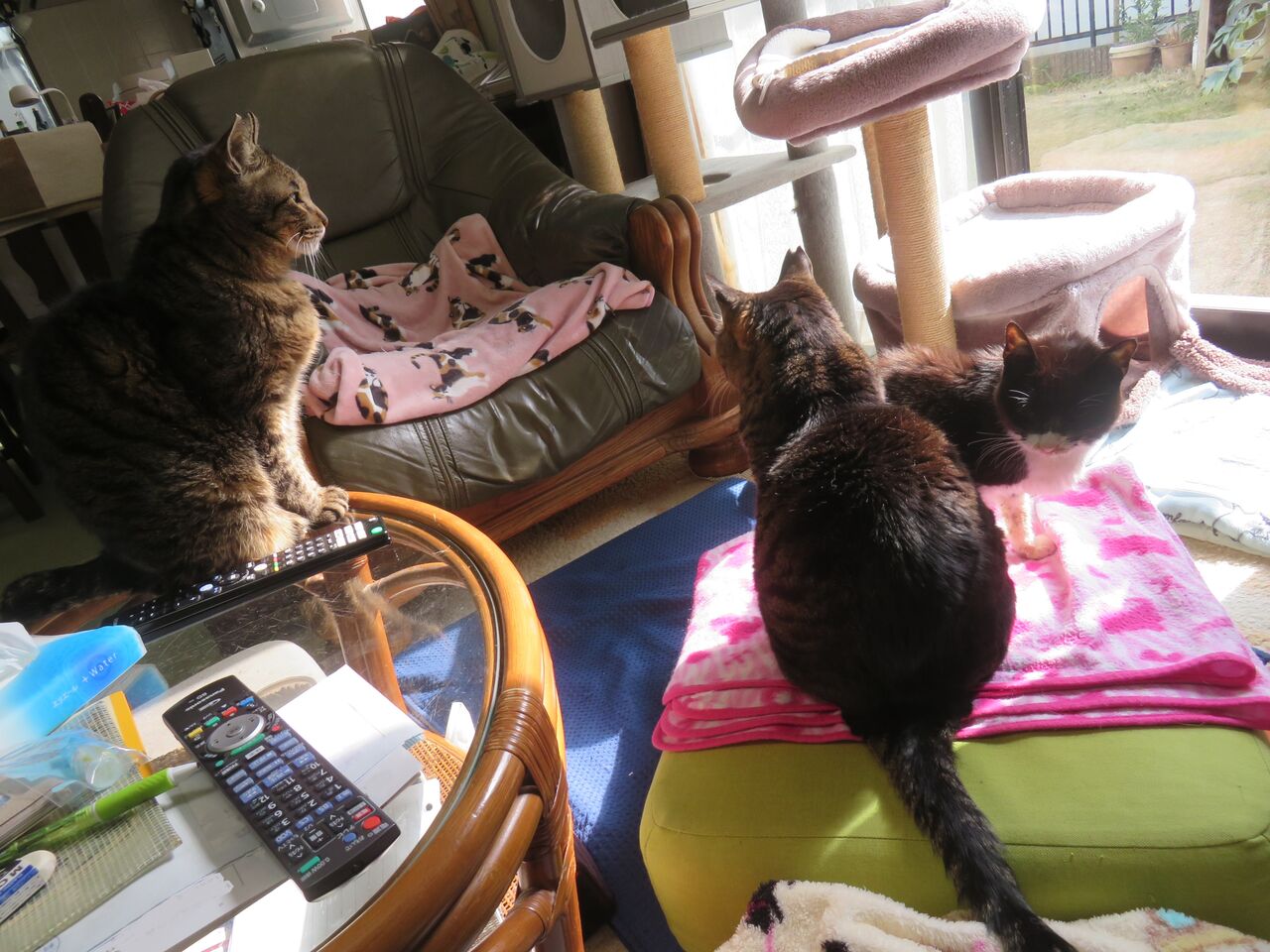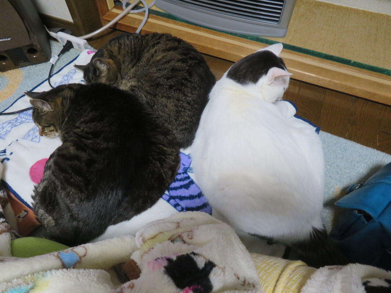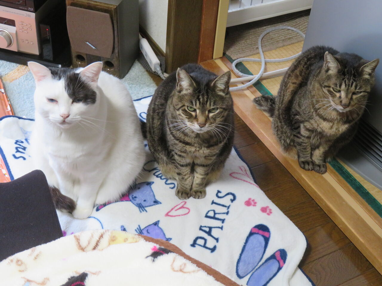 この日の朝も、ストーブ前に、左奥”ななみ”、右奥”たくみ”、手前に”うみ”がチンマリ。