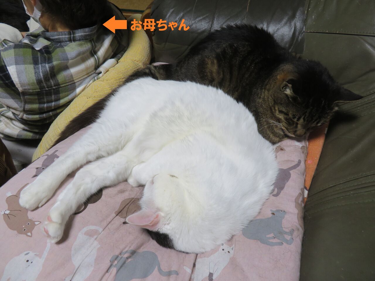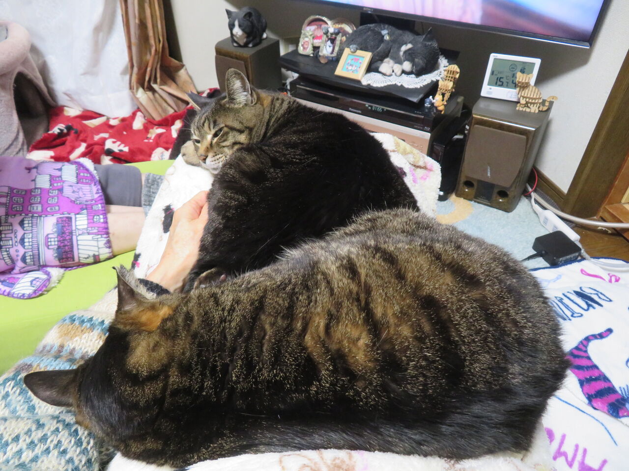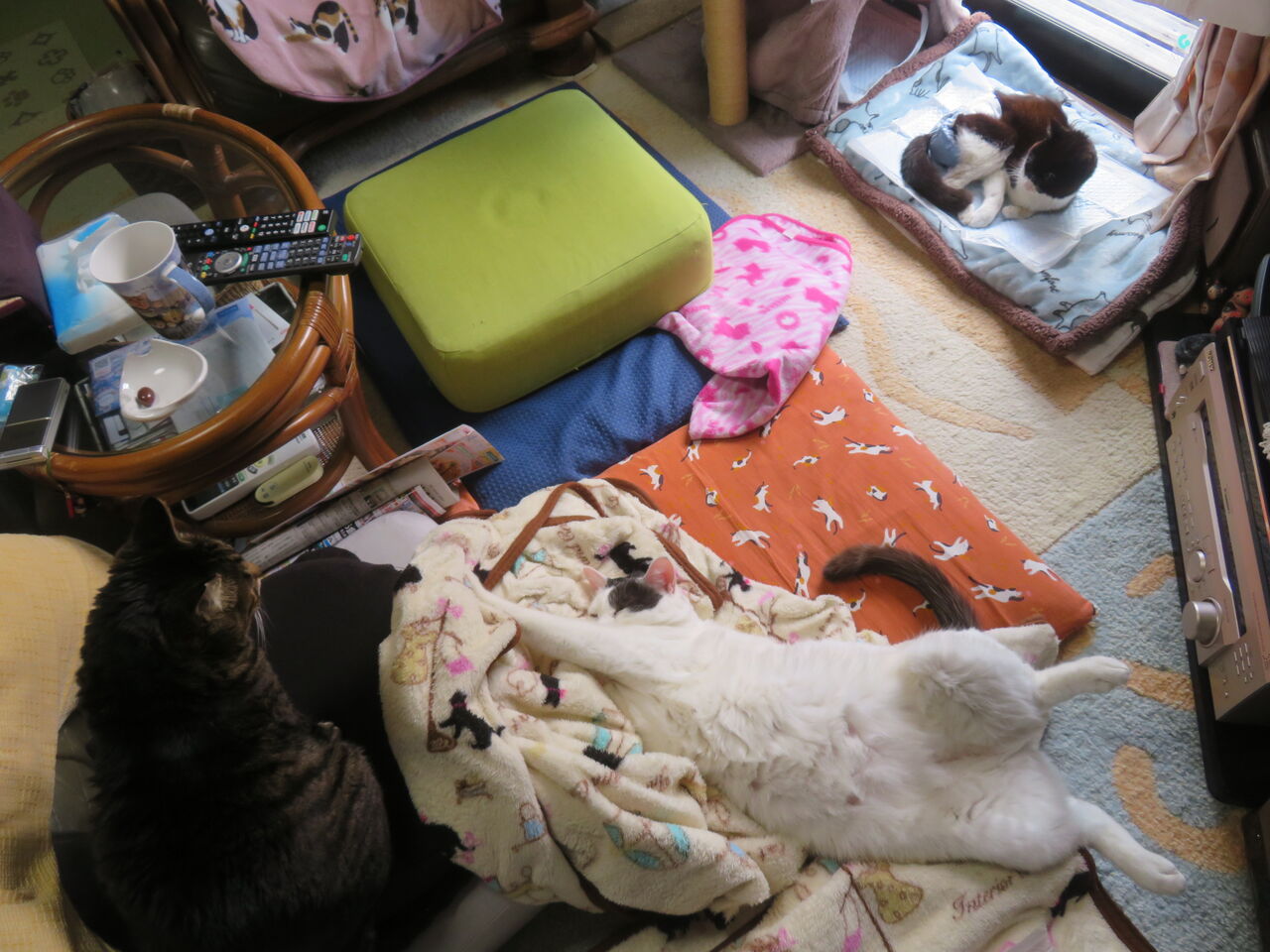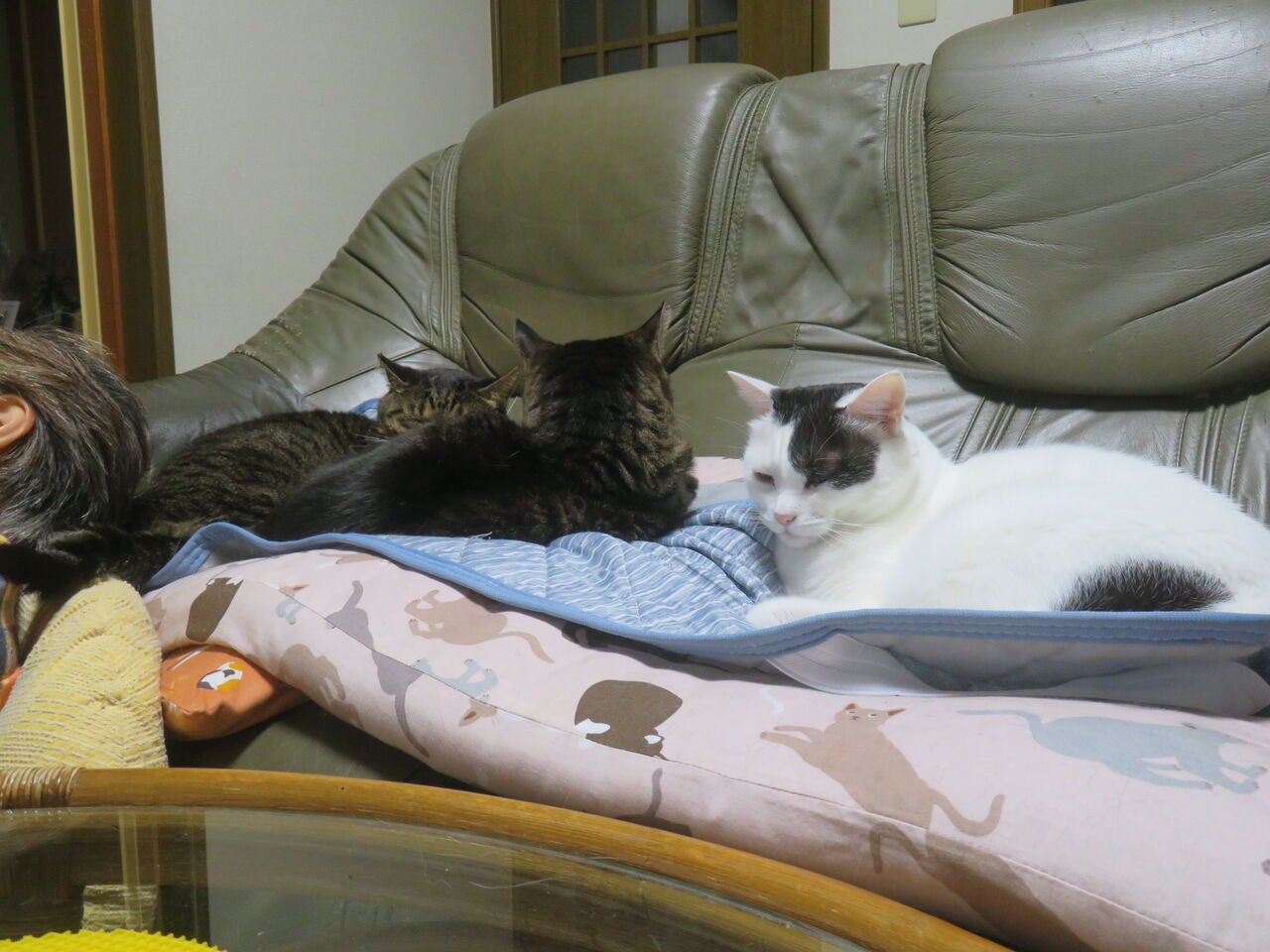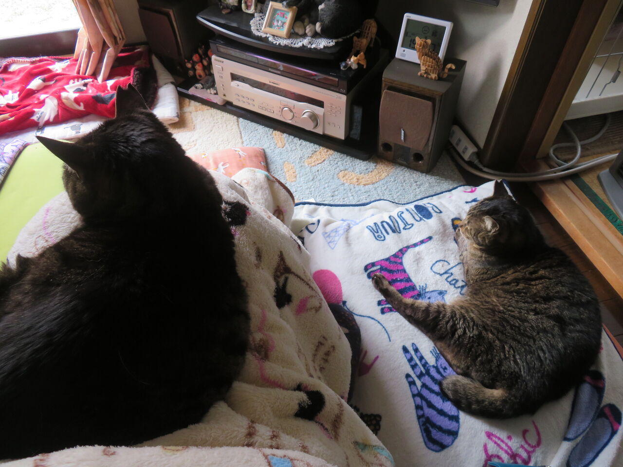 昼前のマッタリタイムには、毛布をかけているお母ちゃんの膝の上に”ななみ”と、その右側には・・・