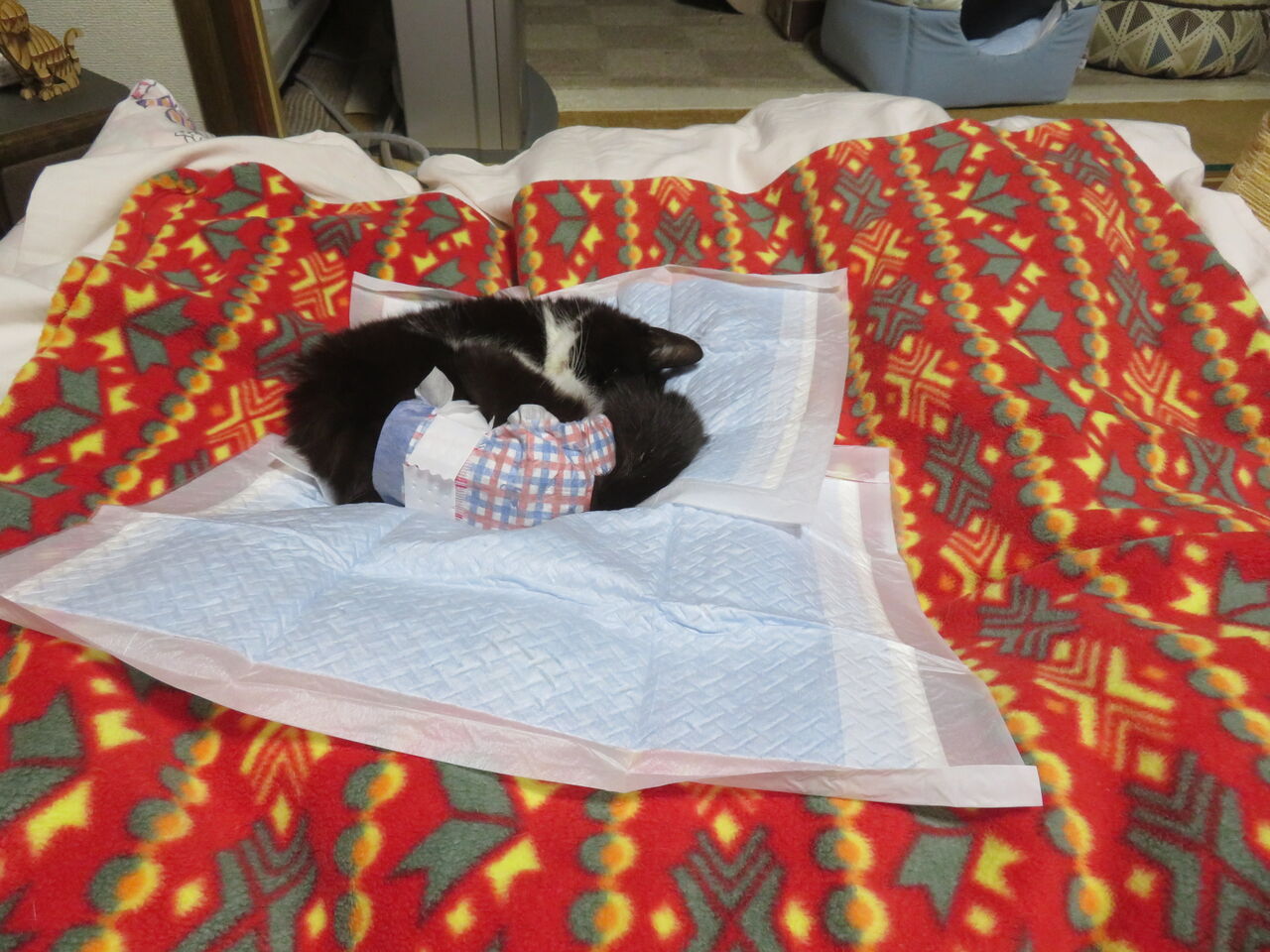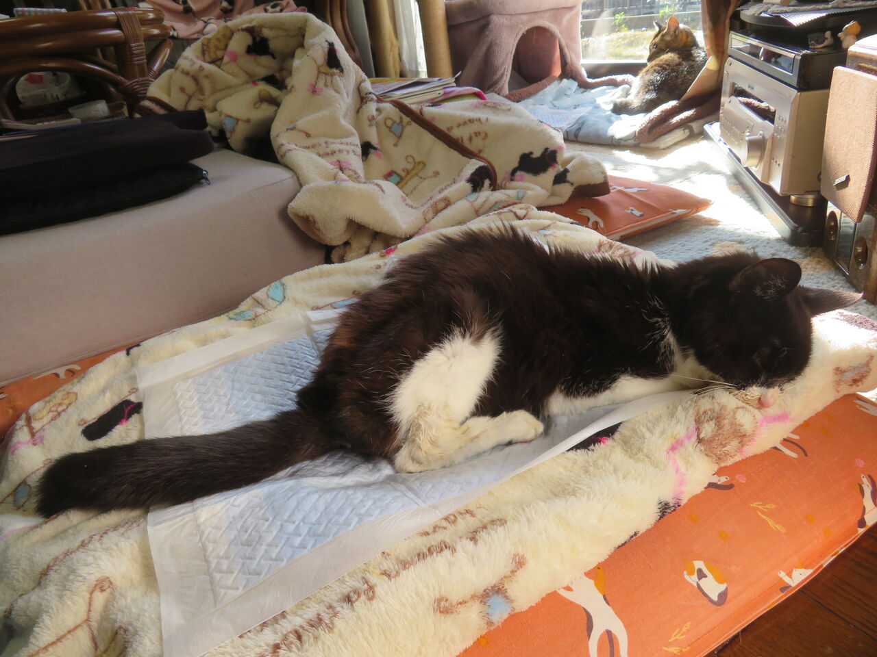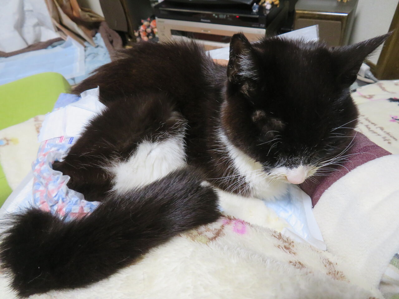 この日の朝は、ストーブを点けても起きて来ない”うみ”、オムツを交換する為にベットから連れてきてオムツ交換をするのに外したのですが、チョットグッタリしています。