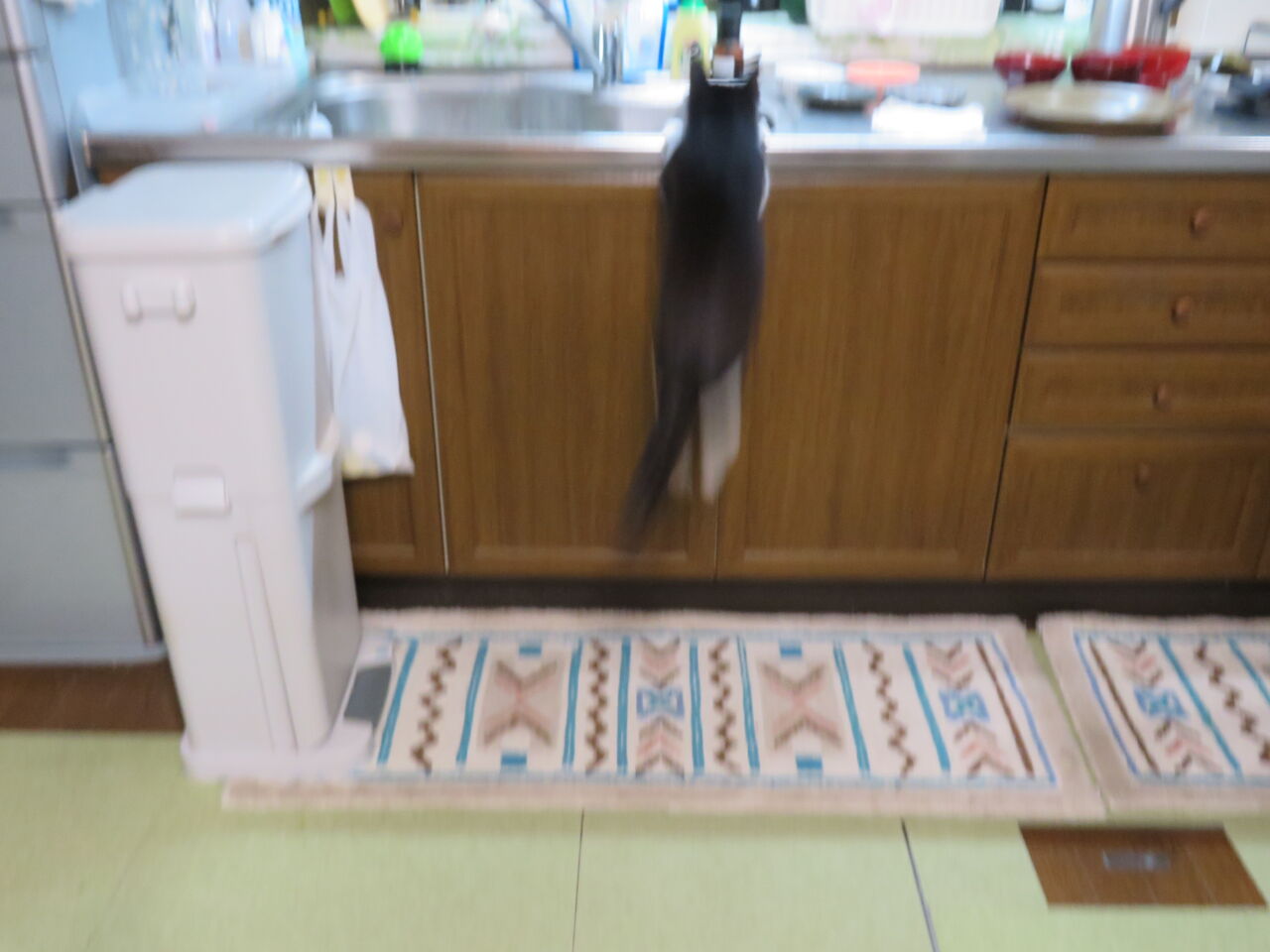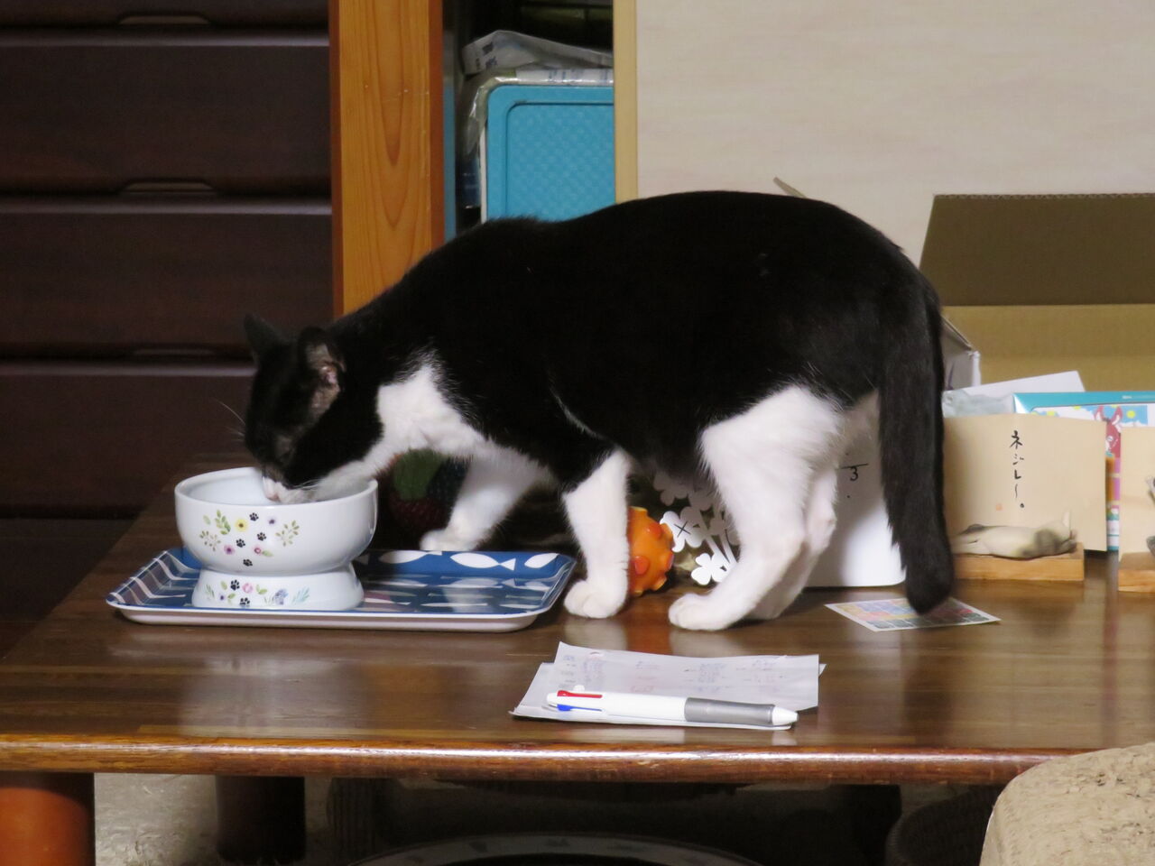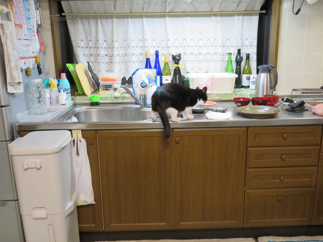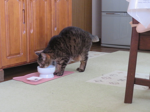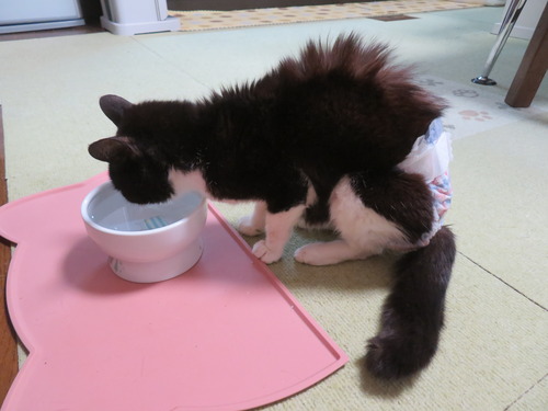 明け方、キッチンの方のトイレまで歩いて(オムツの中に)用を足した後、お水をペチャペチャ飲んでいます。