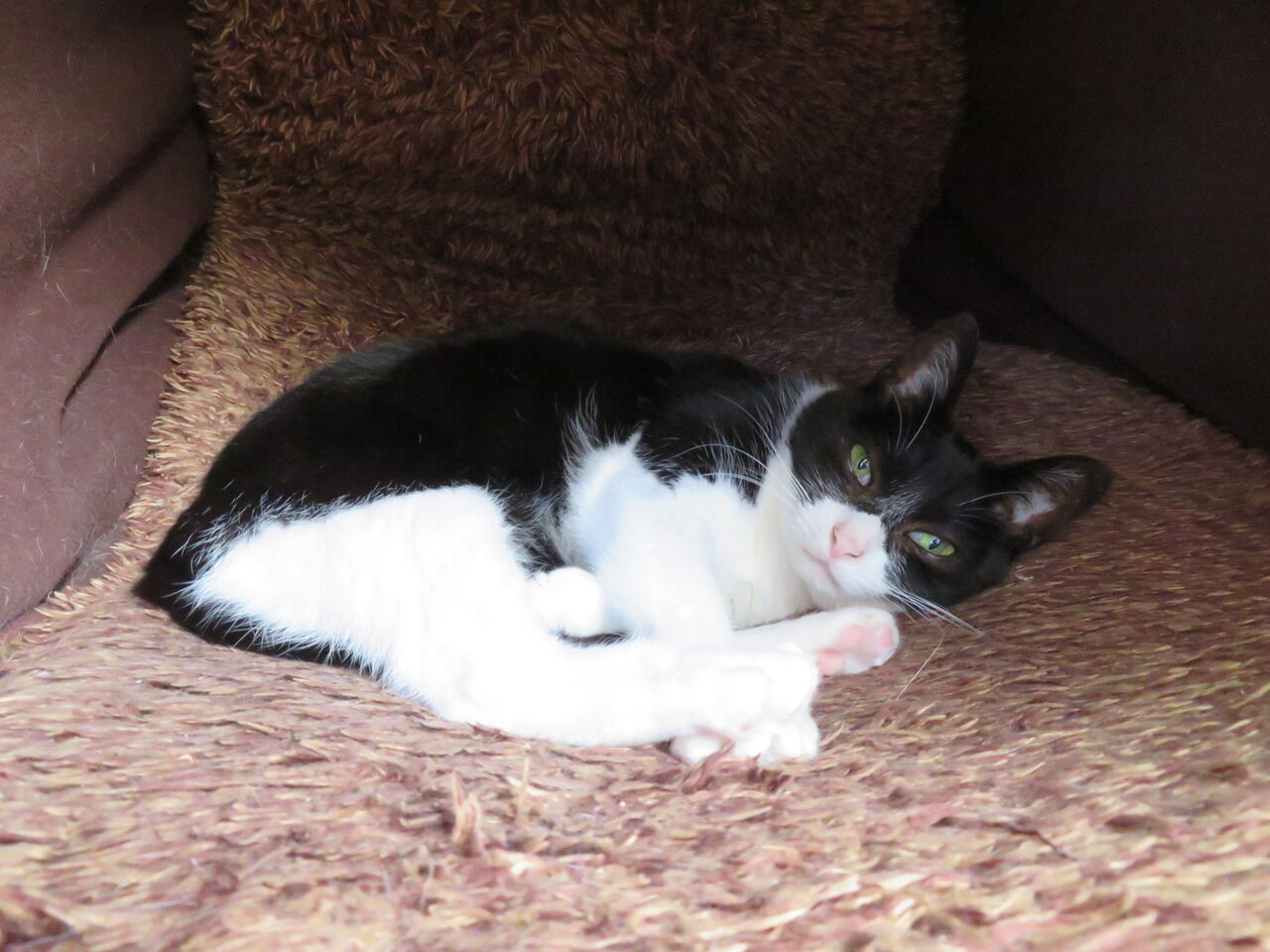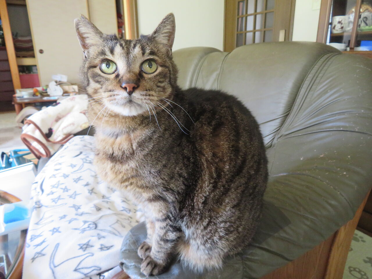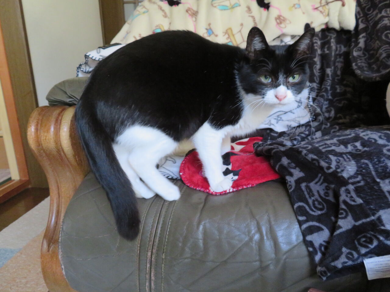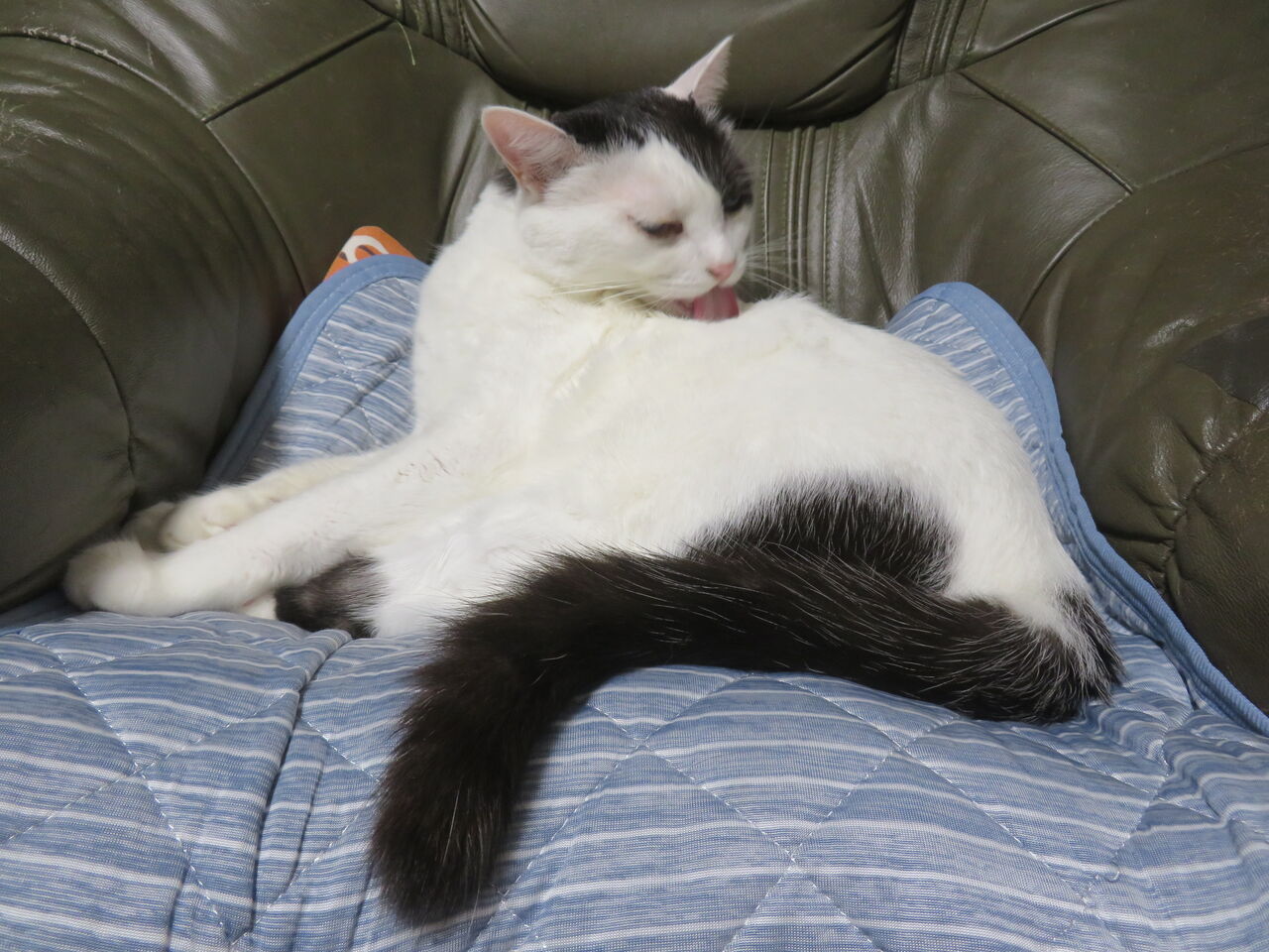 朝起きて間もなく、自ら長ソファに上がった”うみ”です