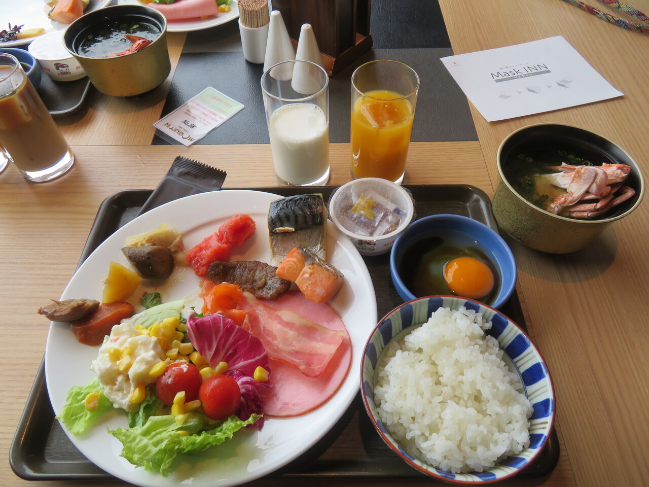 私の大好きなエビフライ(サラダ付き)と、トン汁と、新米〜
