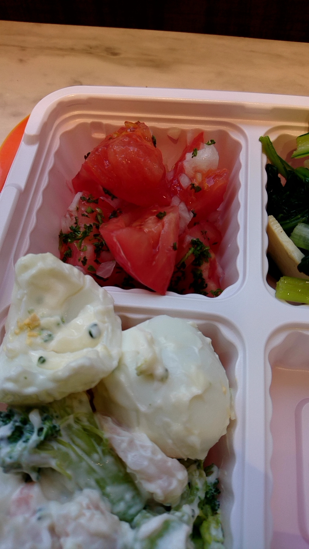 “トマトサラダ”の下が“エビとブロッコリーに茹で玉子のマヨサラダ”