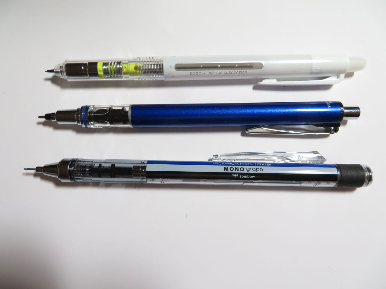 右からクルトガ0.3、デルガード0.3、モノグラフ0.3、プラチナ0.3