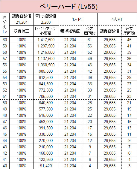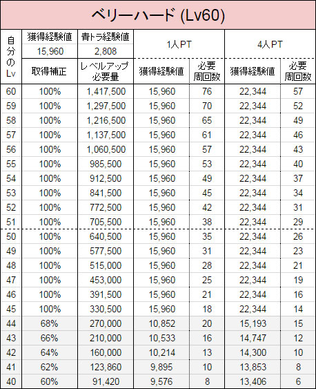そんなファルス・アームの経験値表。(VH以下は画像のリンクのみ)