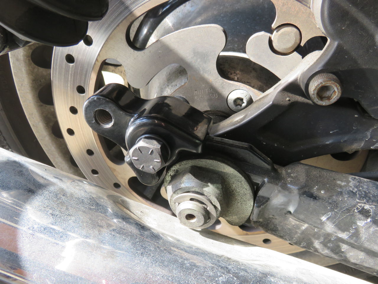 純正ショックを外し、元の取り付け位置にロワリングキットを取り付けてショックの取り付け位置を後ろにずらします